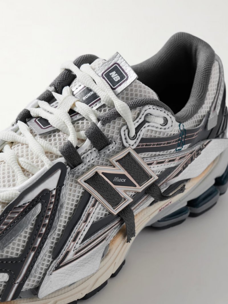 - Gray, silver and gold faux leather, white mesh, white, gold and black rubber