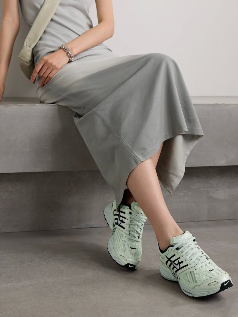 - White textured-leather, light-green and silver smooth leather, light-green and black mesh