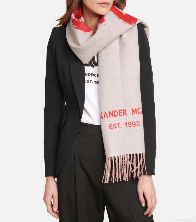 For any fan of Alexander McQueen, this gray and red wool scarf is an essential accessory. Printed with graffiti-like branding, it's a cool way to show your devotion to the British fashion house.