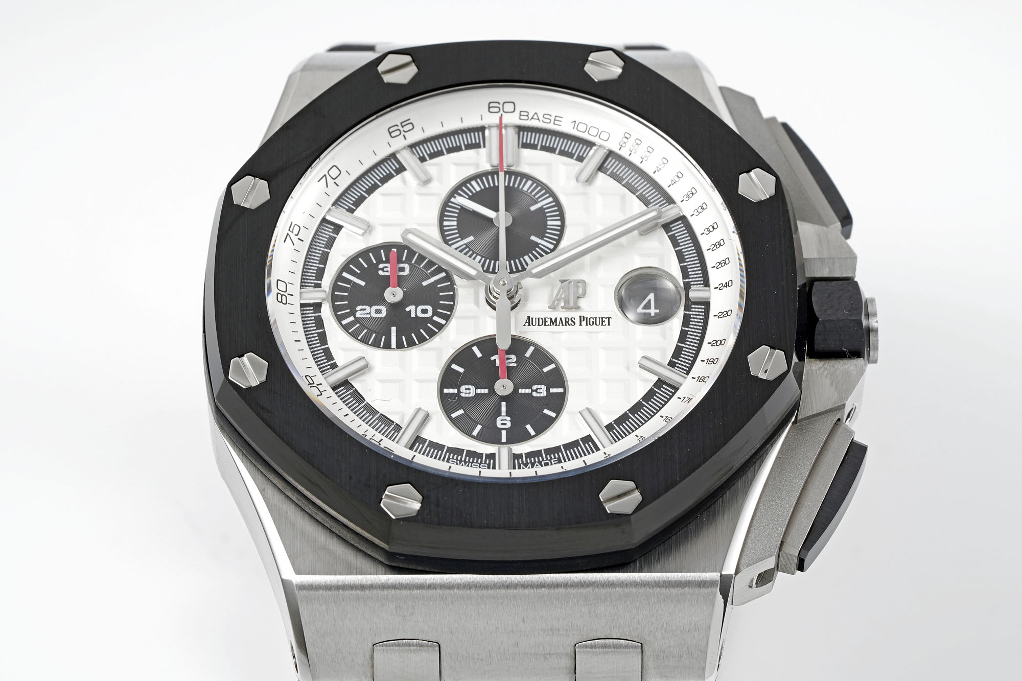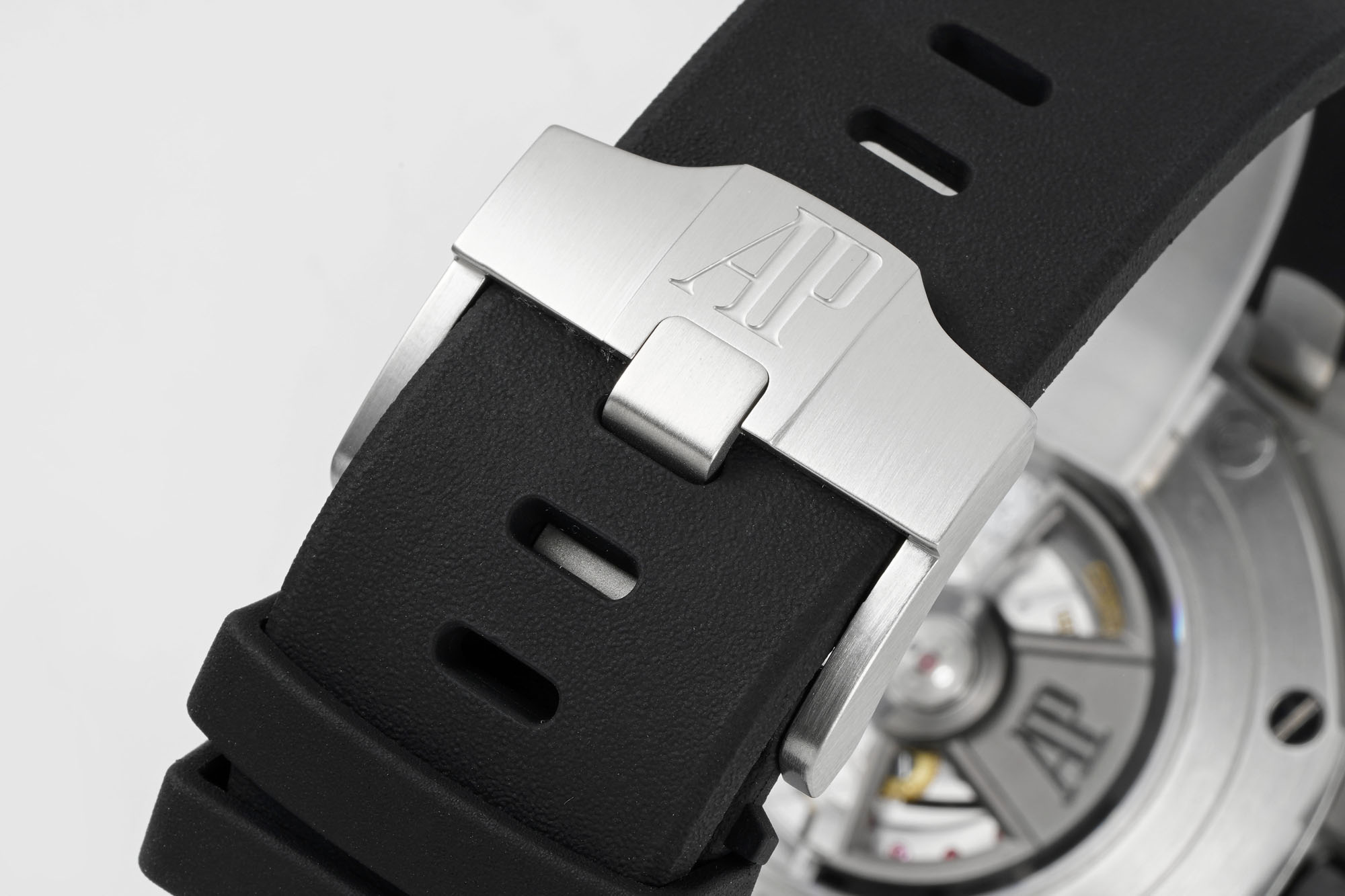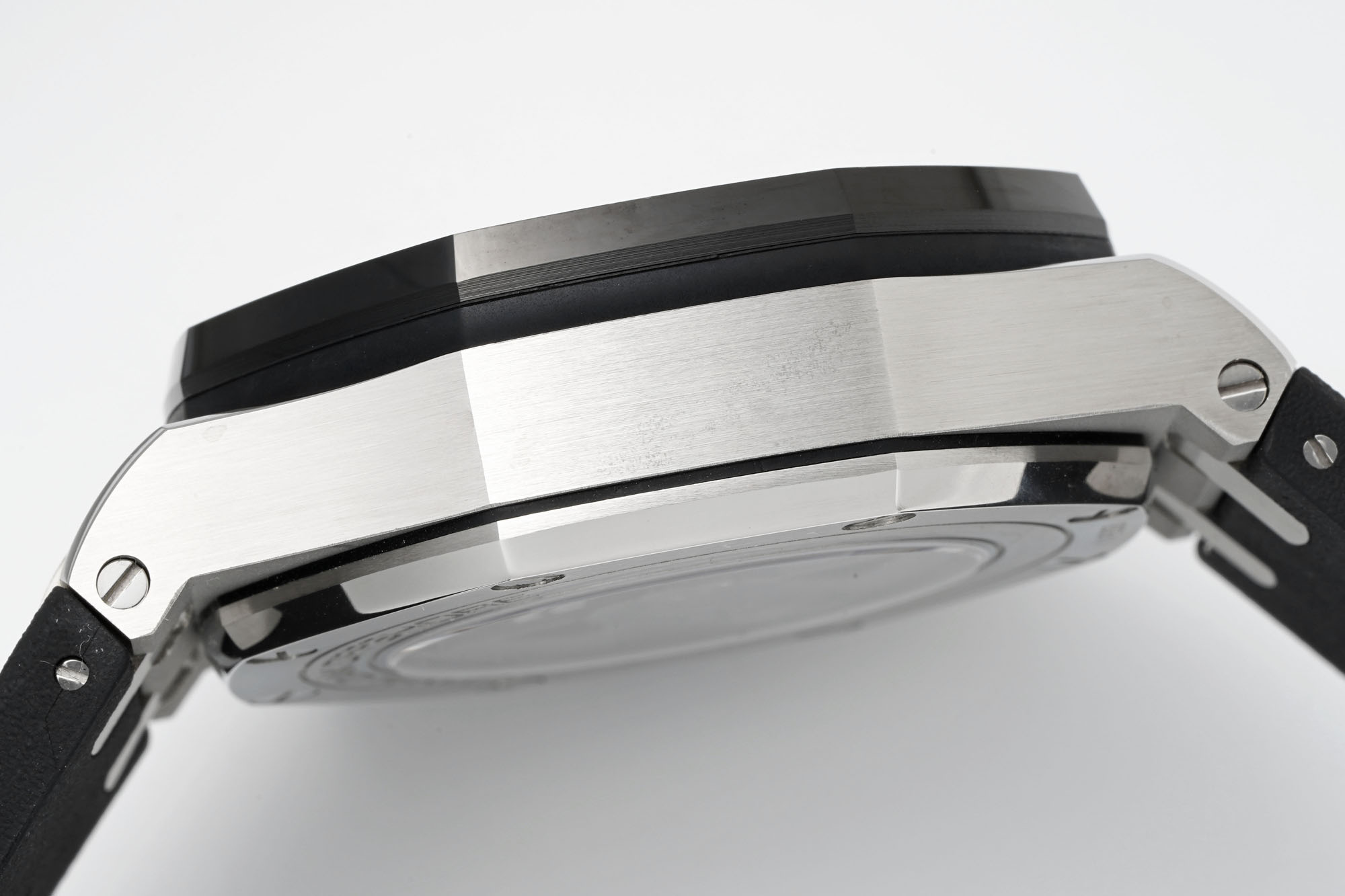 【Dial】The dial has a classic gray-black checkered pattern as the background, with distinct squares that create a sense of depth. The font style on the dial is well-balanced and shows no defects. The three sub-dials are highlighted with white scales above the gray-black case, and the red hands on two of the sub-dials are particularly eye-catching. The small seconds sub-dial is located at twelve o’clock, and there is a circular date window at three o’clock with a multi-faceted magnifying lens decoration. The TPE enlargement effect is consistent with the authentic piece and has a coating on the surface to achieve the effect of clearing data when enlarged. The font style of the date window matches the authentic piece. The sub-dials at six o’clock and nine o’clock are also chronograph sub-dials, and all hour markers on the dial are filled with imported luminescent materials, providing the same luminous effect as the original. The tips of the hands are decorated in red, and the other two hands are clean and neat without any burrs.