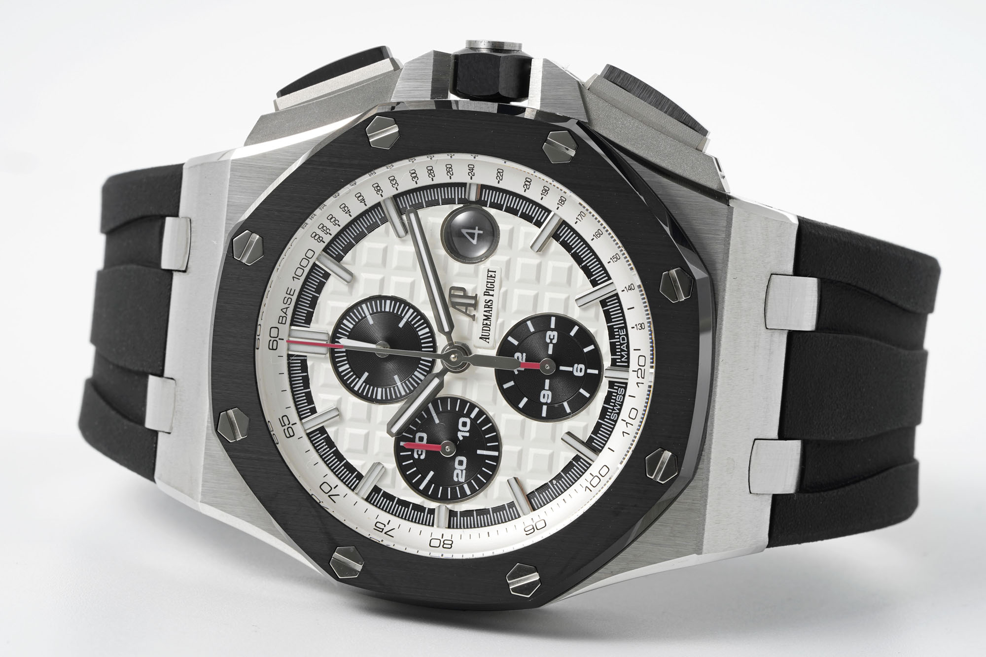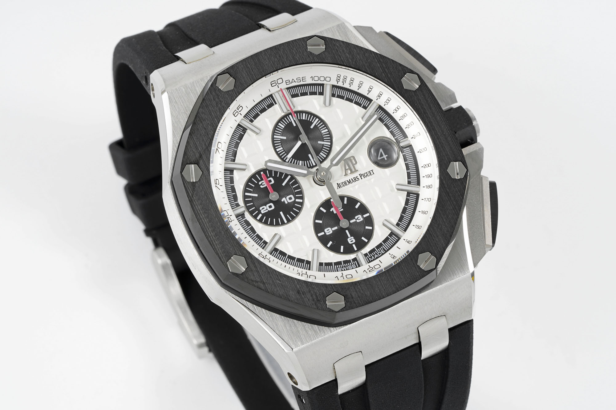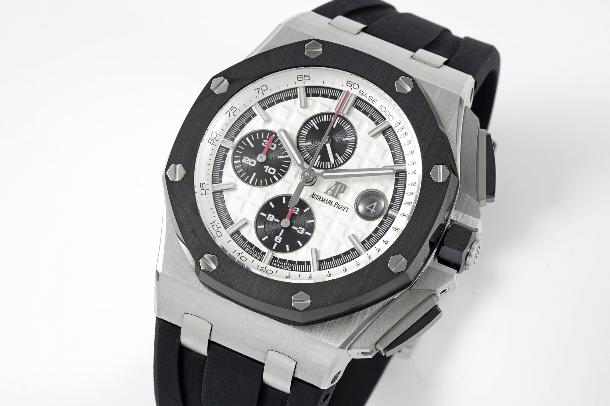 【Dial】The dial has a classic gray-black checkered pattern as the background, with distinct squares that create a sense of depth. The font style on the dial is well-balanced and shows no defects. The three sub-dials are highlighted with white scales above the gray-black case, and the red hands on two of the sub-dials are particularly eye-catching. The small seconds sub-dial is located at twelve o’clock, and there is a circular date window at three o’clock with a multi-faceted magnifying lens decoration. The TPE enlargement effect is consistent with the authentic piece and has a coating on the surface to achieve the effect of clearing data when enlarged. The font style of the date window matches the authentic piece. The sub-dials at six o’clock and nine o’clock are also chronograph sub-dials, and all hour markers on the dial are filled with imported luminescent materials, providing the same luminous effect as the original. The tips of the hands are decorated in red, and the other two hands are clean and neat without any burrs.