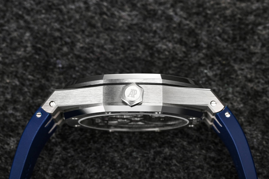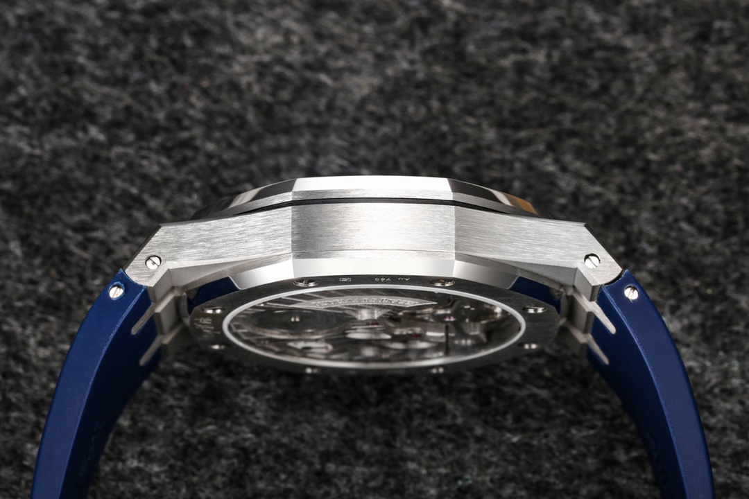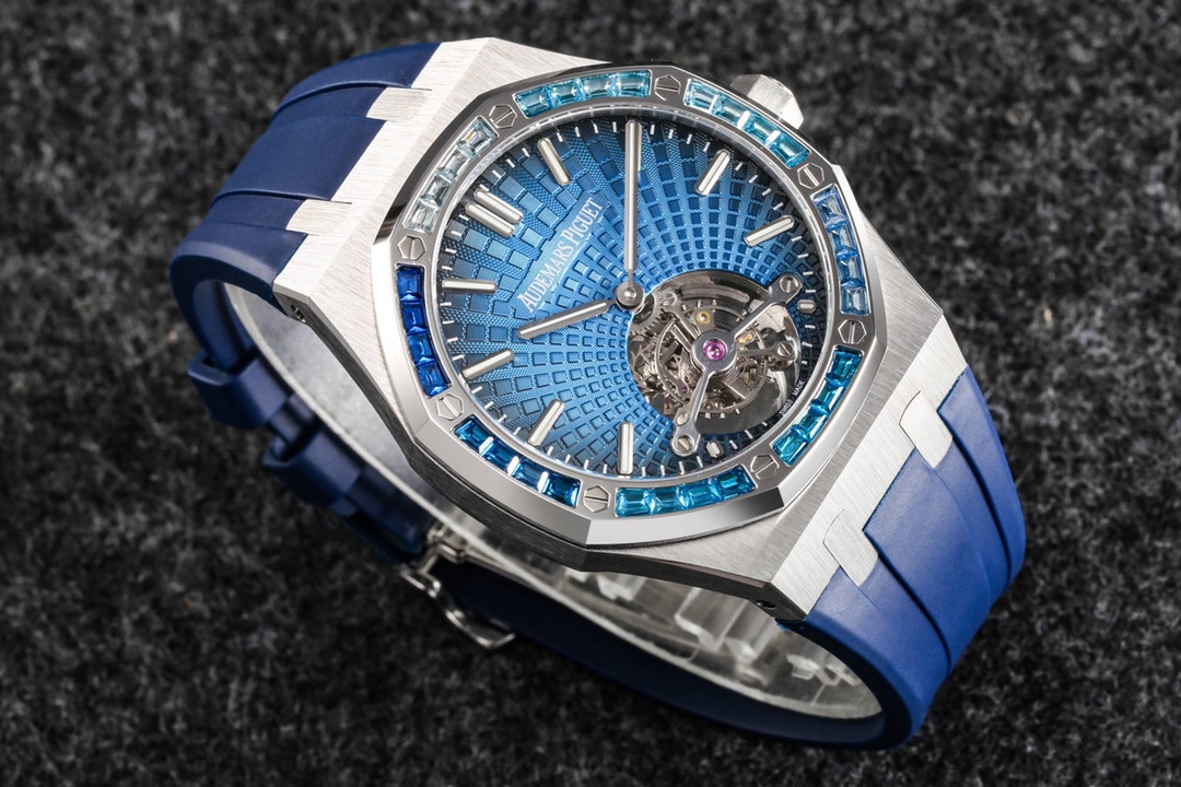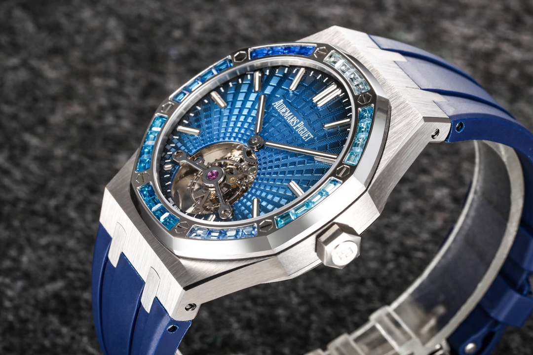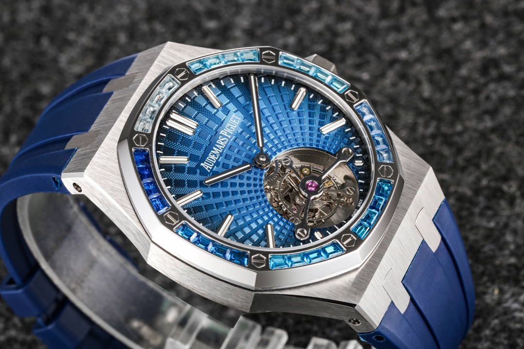 Audemars Piguet continues to lead the way in exploring innovation and unveiled the new Royal Oak Extra-Thin Tourbillon watch at the Geneva exhibition. The iconic “Tapisserie” checkered design has been reimagined into a fresh radiating pattern, offering a new visual experience. The sunburst radiating pattern originates from the tourbillon at 6 o’clock, with the size of the pattern gradually increasing from the center outwards, creating a captivating color gradient effect. The radiating pattern is brilliant and visually stunning. The checkered dial is complemented by white gold fluorescent three-dimensional hands, featuring Swiss superluminova, ensuring clear time visibility even in dark environments, providing great convenience.