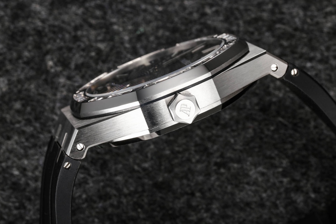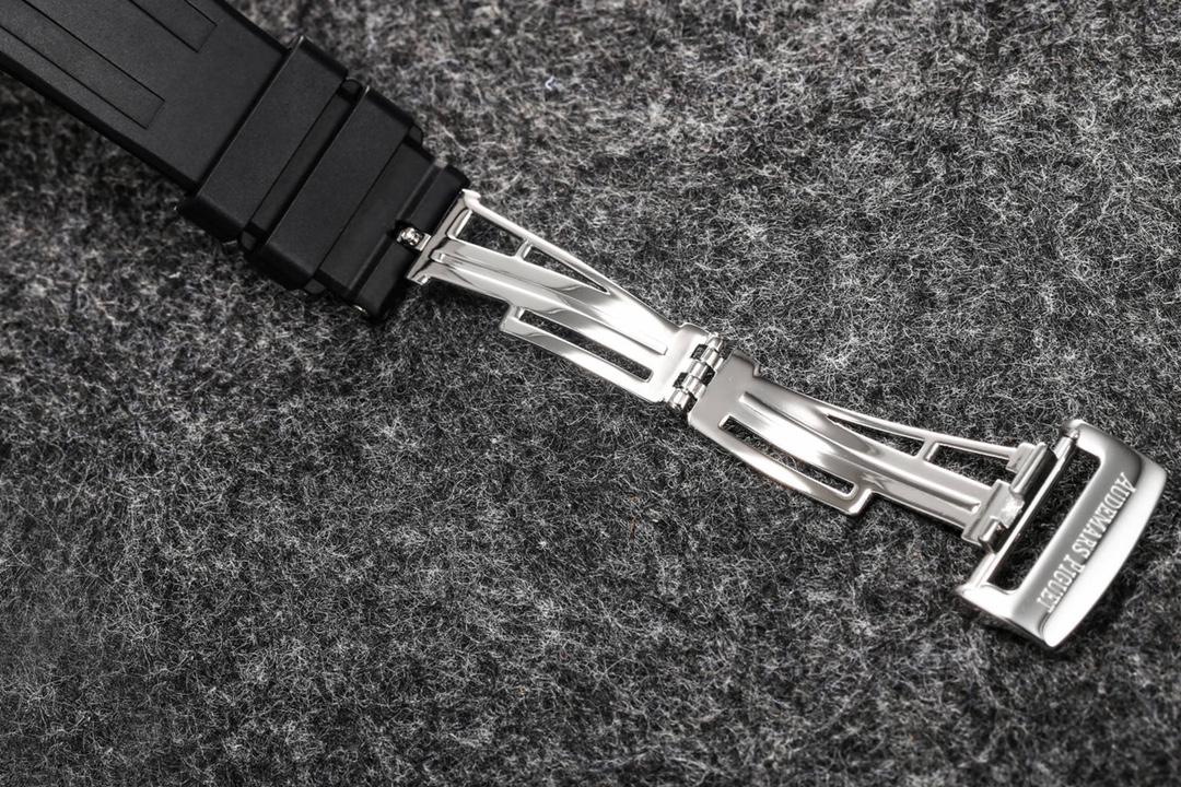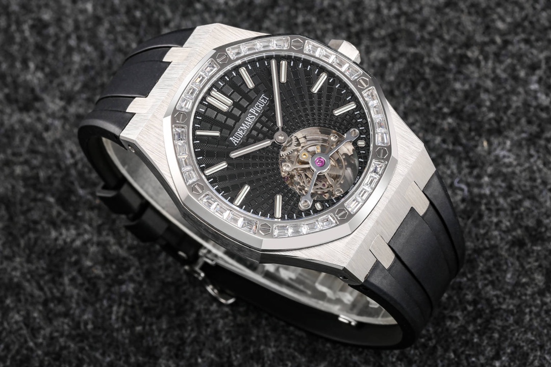Audemars Piguet continues to lead the way in exploring innovation and unveiled the new Royal Oak Extra-Thin Tourbillon watch at the Geneva exhibition. The iconic “Tapisserie” checkered design has been reimagined into a fresh radiating pattern, offering a new visual experience. The sunburst radiating pattern originates from the tourbillon at 6 o’clock, with the size of the pattern gradually increasing from the center outwards, creating a captivating color gradient effect. The radiating pattern is brilliant and visually stunning. The checkered dial is complemented by white gold fluorescent three-dimensional hands, featuring Swiss superluminova, ensuring clear time visibility even in dark environments, providing great convenience.