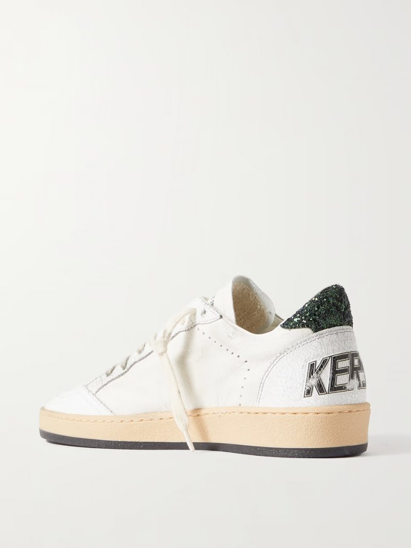 - White cracked-leather (Goat), green glittered leather (Cow)