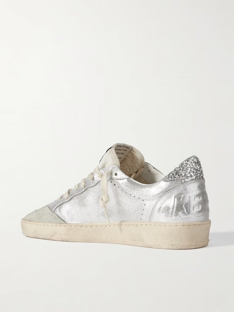 - Silver leather, silver glittered leather, off-white cracked-leather, off-white suede