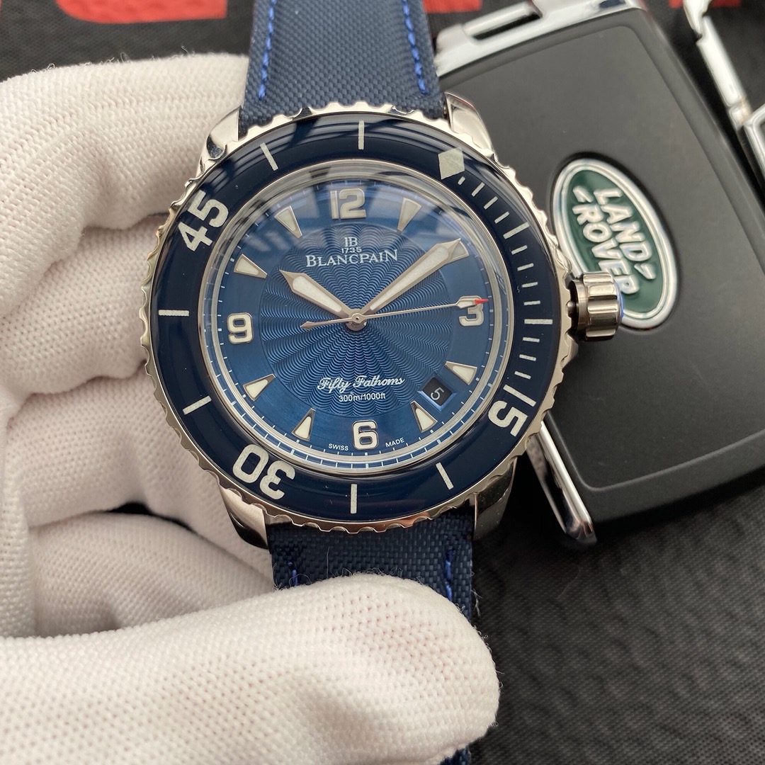 Luminous blue sapphire bezel, sapphire crystal with anti-glare blue coating, rhodium-plated hands, blue Geneva wave dial, imported 821A mechanical movement, solid case back, deep blue and dark black nylon fiber leather strap, titanium alloy buckle.