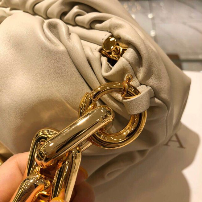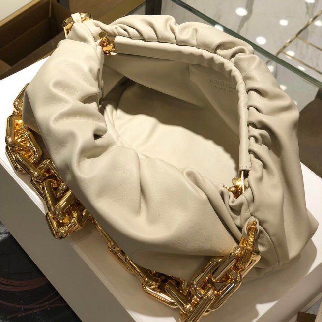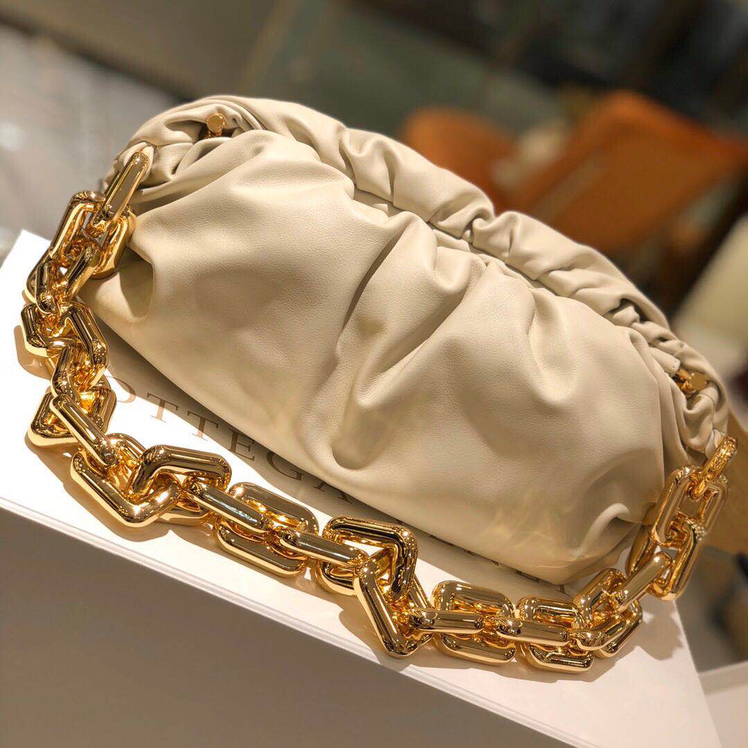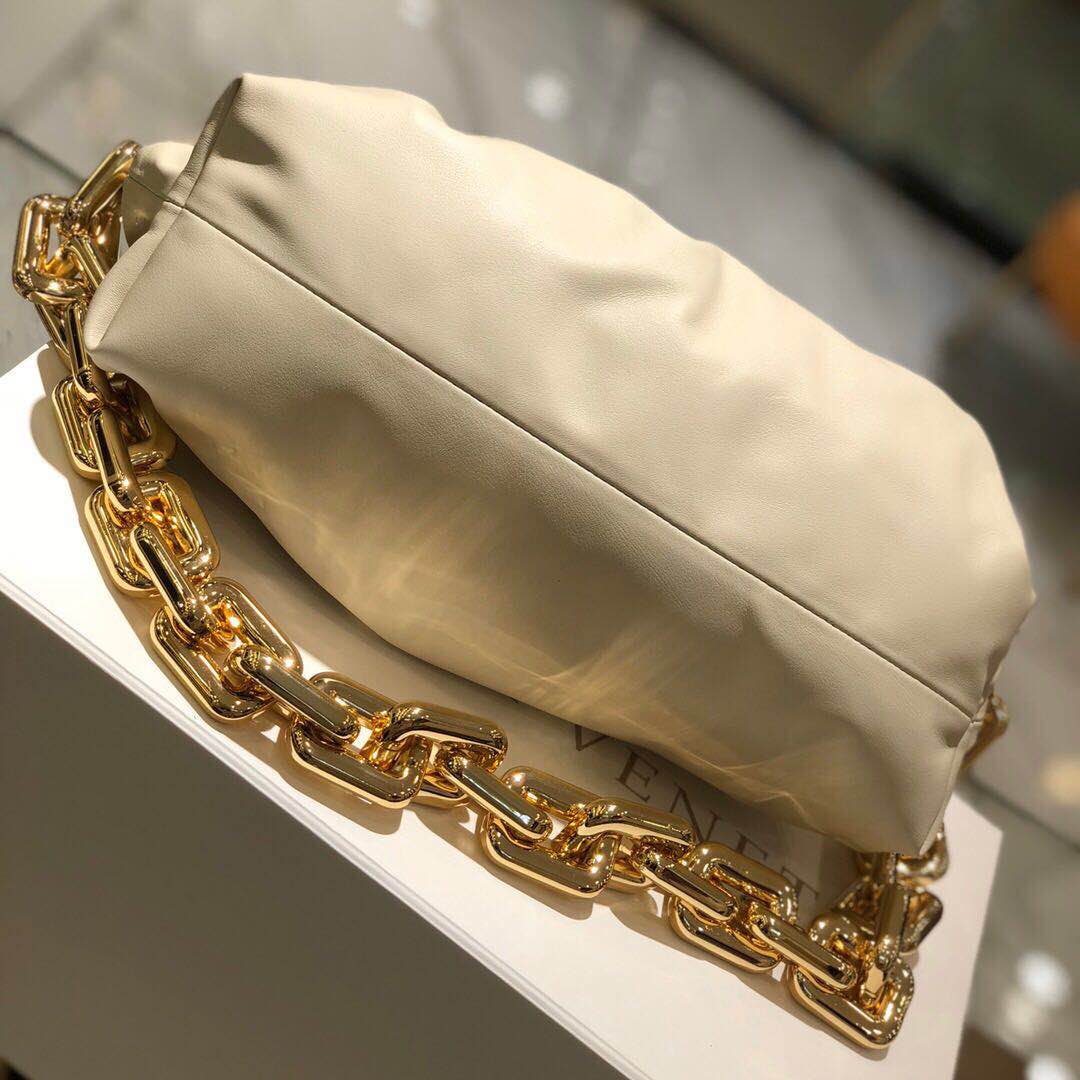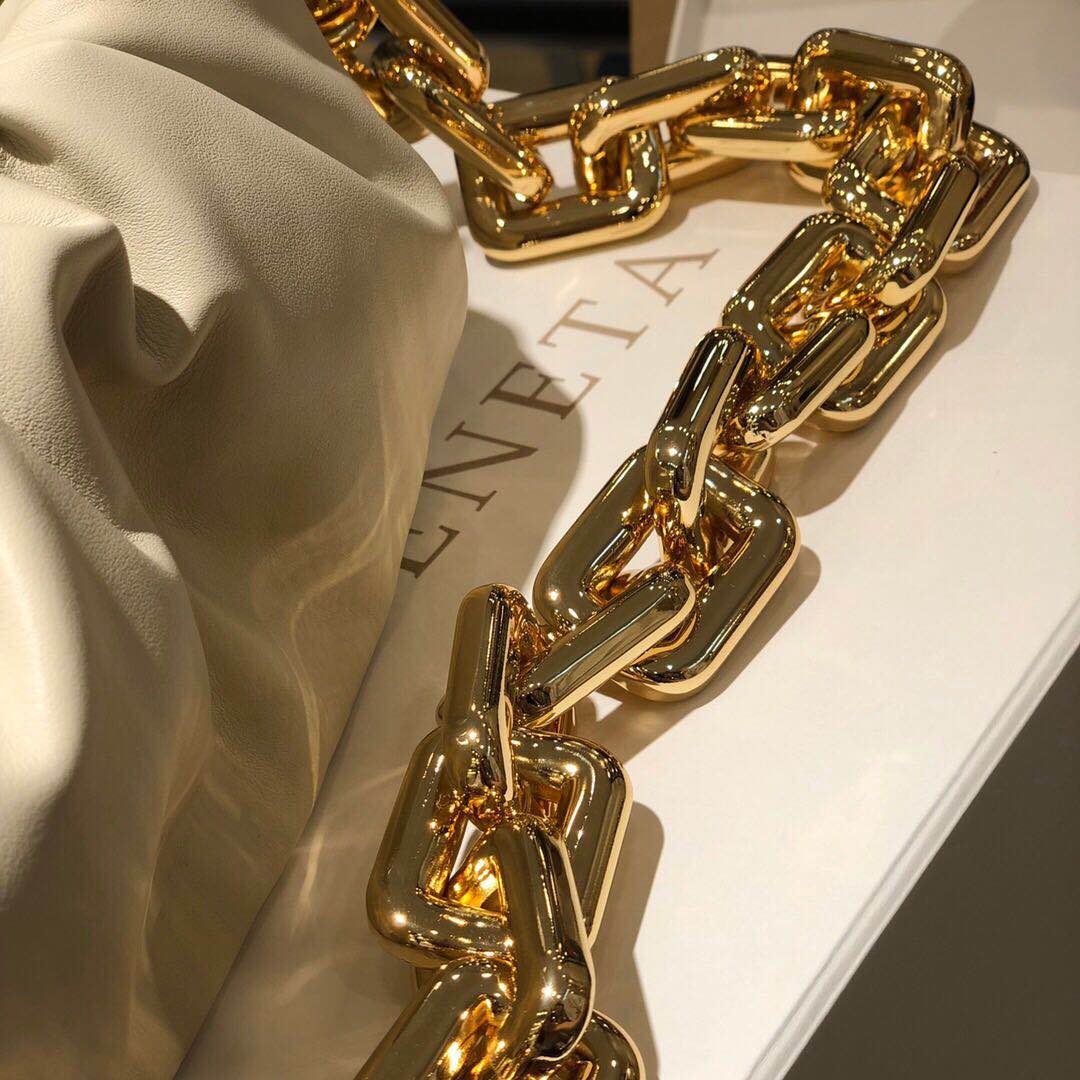 Bottega Veneta updates its cult Pouch bag with a chunky golden chain handle.