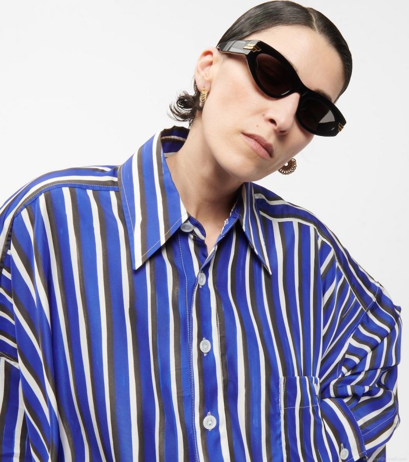 Bottega Veneta reintroduces its Classic sunglasses with oval-shaped lenses. The acetate design has wide temples with gold-toned hardware accents.