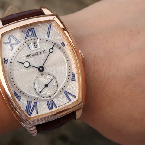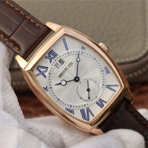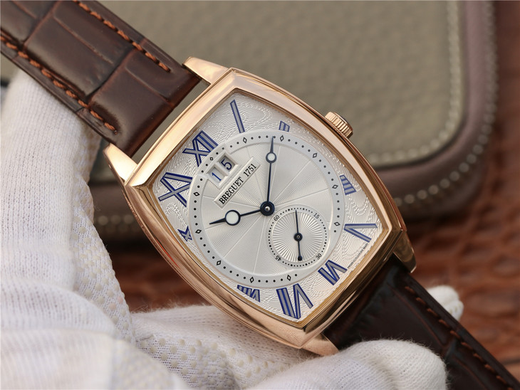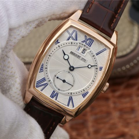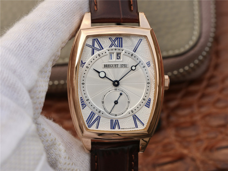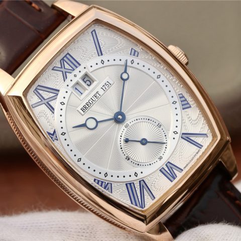 This is a Breguet Heritage Series 5410BB/12/9VV wristwatch, featuring a unique barrel-shaped case that combines complex functions. The case is adorned with coin patterns on the outer edge. Dimensions: 42 x 35 millimeters. The lugs are welded and fixed with screws. It has a water resistance of 3 bar (30 meters). The watch showcases a classic guilloché dial with exquisite engraving patterns. The innovative wave-shaped barrel dial combines with luminescent-coated Breguet-style hollow blue steel hands. The dial design is rich in layers, including small seconds and a large date display. The height differences add not only elegance but also a strong sense of depth, turning the timepiece into a work of art.