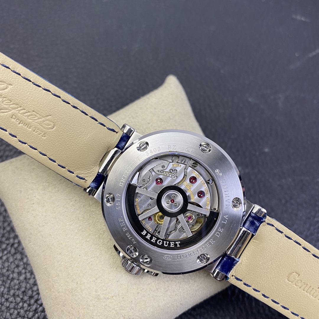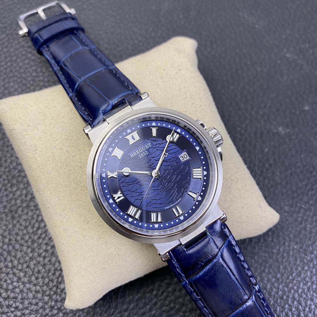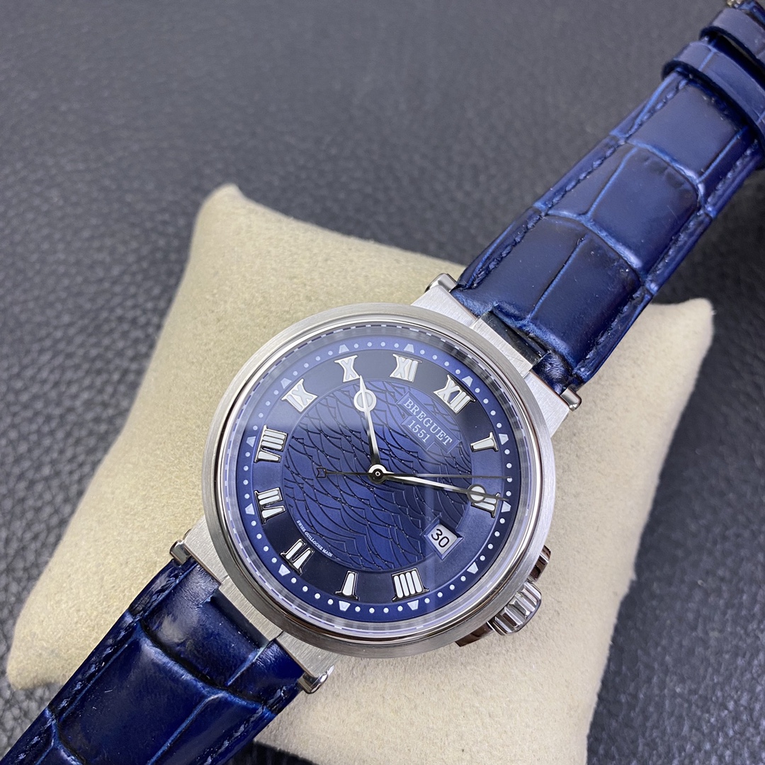 The Breguet MARINE Nautical Series wristwatch is a highly classic timepiece. It is considered the origin of marine chronometers and hailed as a masterpiece in the watchmaking industry. It features an upgraded imported 9015 movement to the original 777A automatic mechanical movement, with a diameter of 40 millimeters. The outer edge of the case is adorned with coin patterns. Both sides are equipped with scratch-resistant sapphire crystals, and it has a screw-down waterproof crown. It has been tested to be water-resistant up to 100 meters. The watch is complemented by a dial with a sunburst pattern and a genuine Italian crocodile leather strap, exuding an elegant and robust temperament.