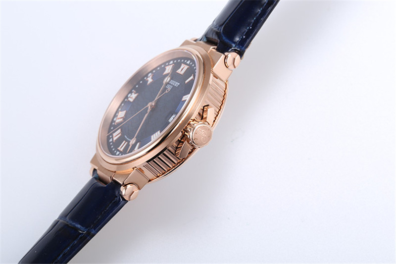The Breguet MARINE Nautical Series wristwatch is a highly classic timepiece. It is considered the origin of marine chronometers and hailed as a masterpiece in the watchmaking industry. It features an upgraded imported 9015 movement to the original 777A automatic mechanical movement, with a diameter of 40 millimeters. The outer edge of the case is adorned with coin patterns. Both sides are equipped with scratch-resistant sapphire crystals, and it has a screw-down waterproof crown. It has been tested to be water-resistant up to 100 meters. The watch is complemented by a dial with a sunburst pattern and a genuine Italian crocodile leather strap, exuding an elegant and robust temperament.