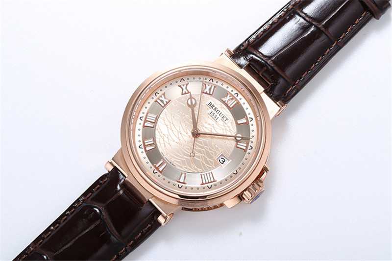 The Breguet MARINE Nautical Series wristwatch is a highly classic timepiece. It is considered the origin of marine chronometers and hailed as a masterpiece in the watchmaking industry. It features an upgraded imported 9015 movement to the original 777A automatic mechanical movement, with a diameter of 40 millimeters. The outer edge of the case is adorned with coin patterns. Both sides are equipped with scratch-resistant sapphire crystals, and it has a screw-down waterproof crown. It has been tested to be water-resistant up to 100 meters. The watch is complemented by a dial with a sunburst pattern and a genuine Italian crocodile leather strap, exuding an elegant and robust temperament.