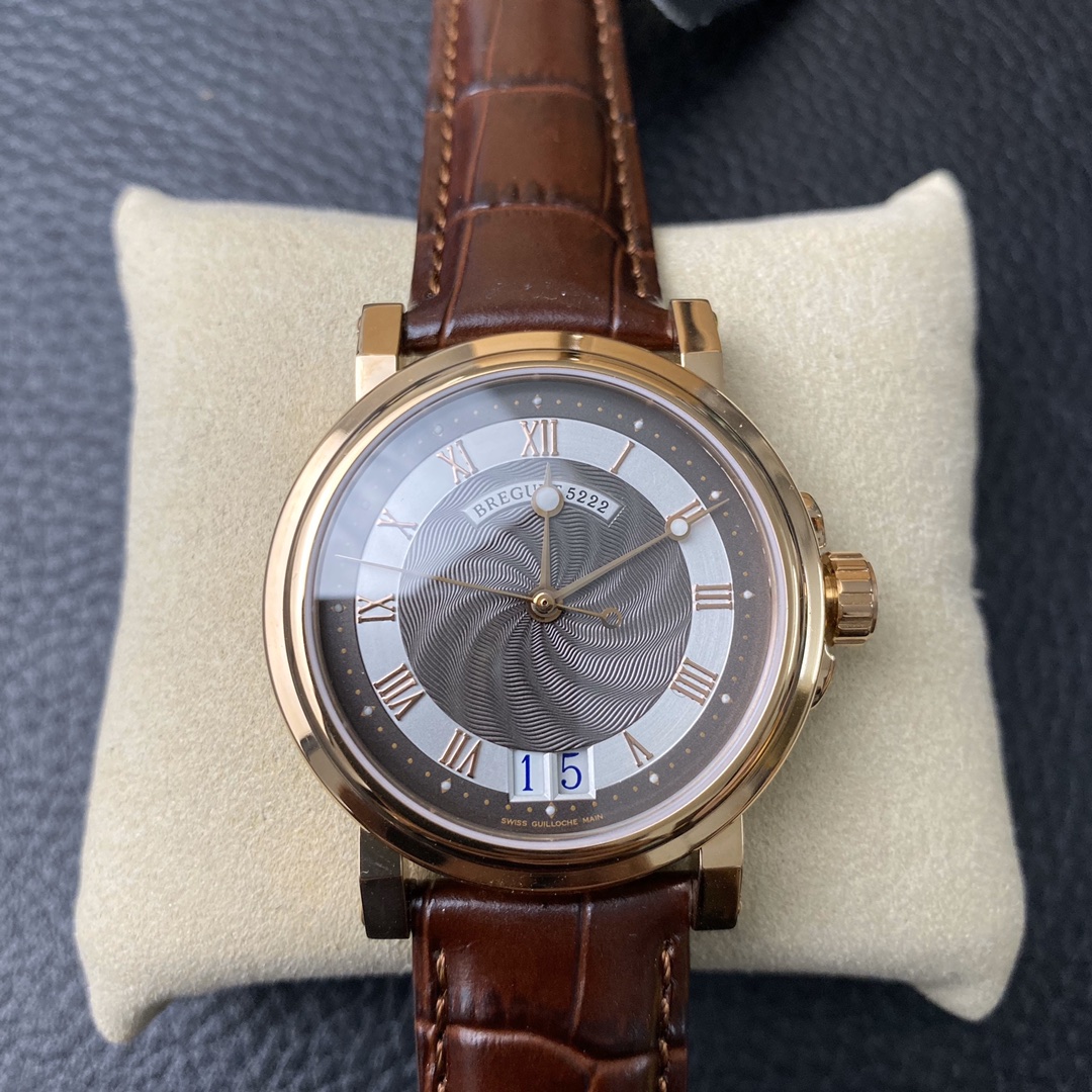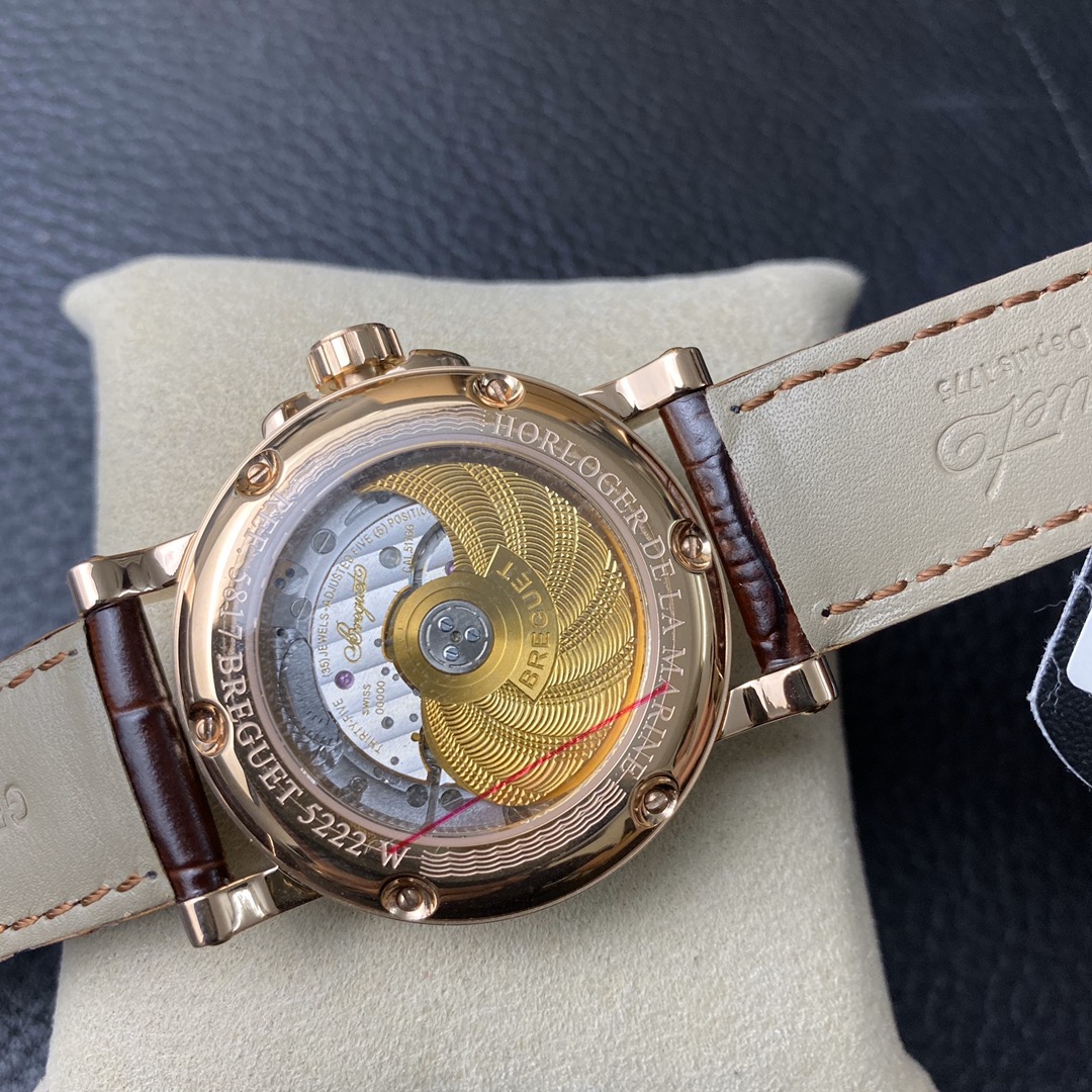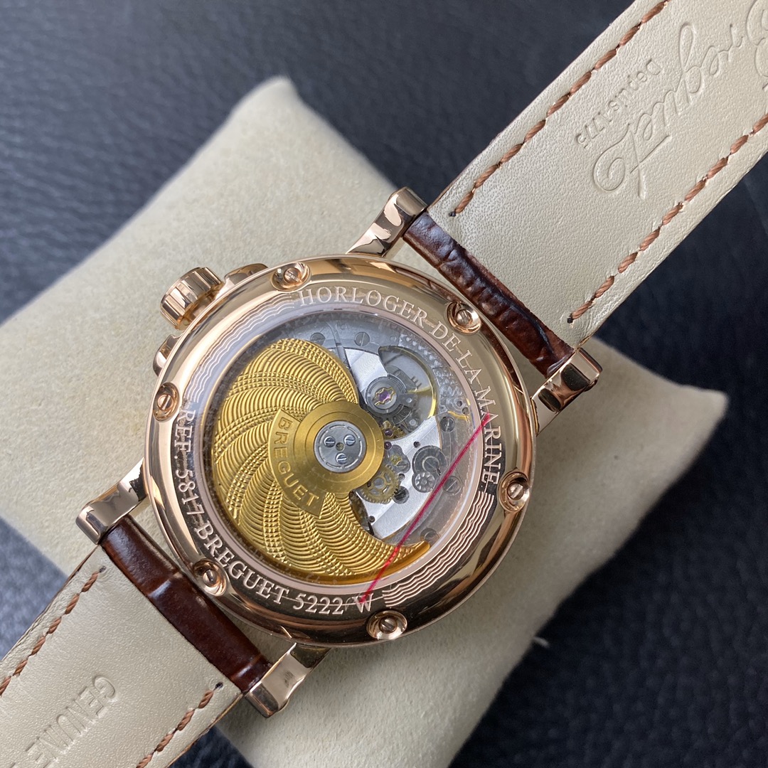 This is the Breguet Marine Series 5817 wristwatch, with a diameter of 39mm. It is powered by the reissued Breguet Cal.517GG movement. The watch features Breguet hands (hollow eccentric “moon-shaped” hands) and Breguet numerals. The central part of the dial adopts the signature wave pattern of the Marine series, which is also echoed by the wave-like texture on the balance wheel of the movement. The watch has an exquisite and elegant appearance, combining both a sense of fashion and sophistication. It is a great choice for both business and casual occasions.