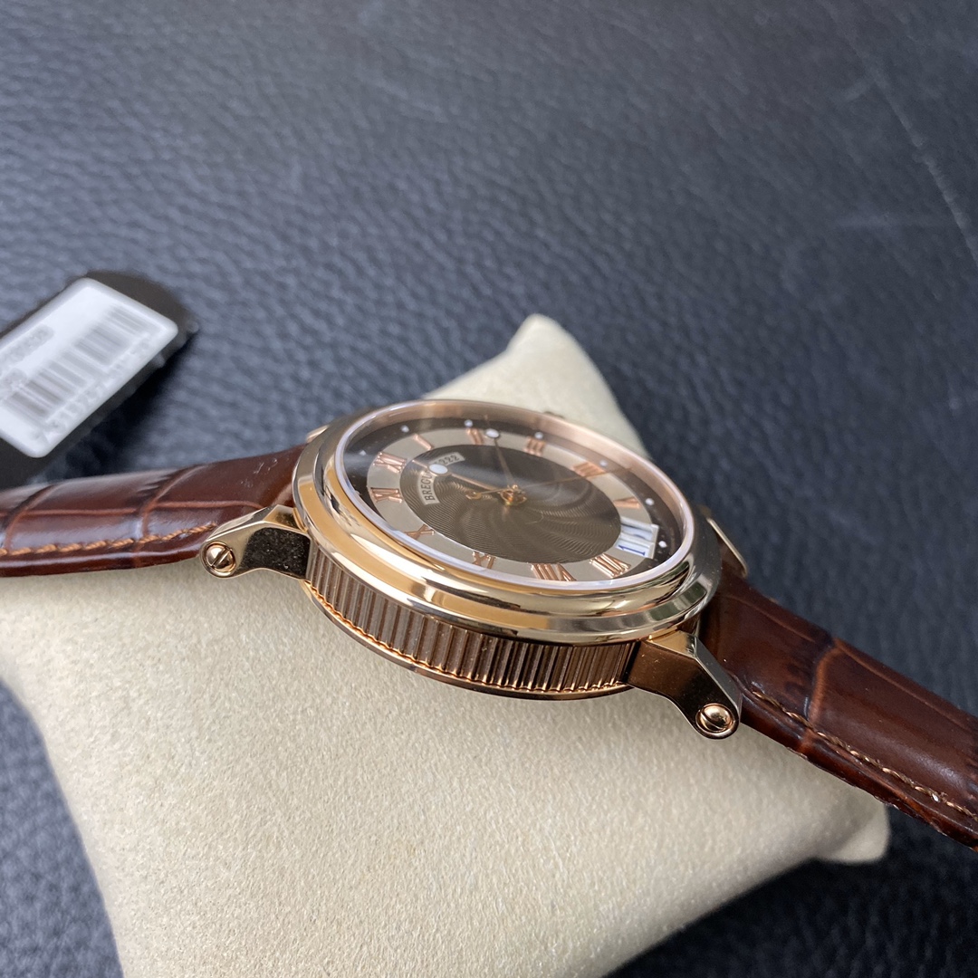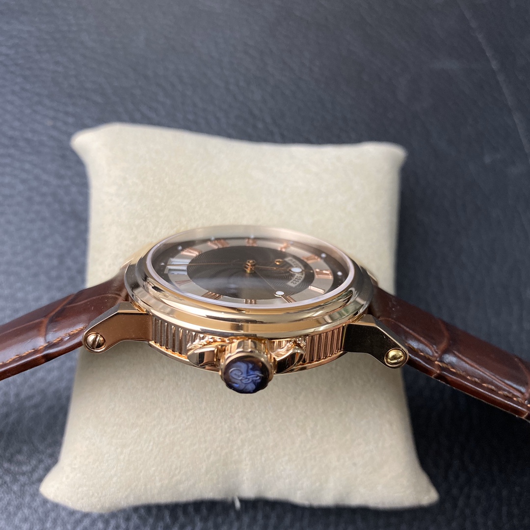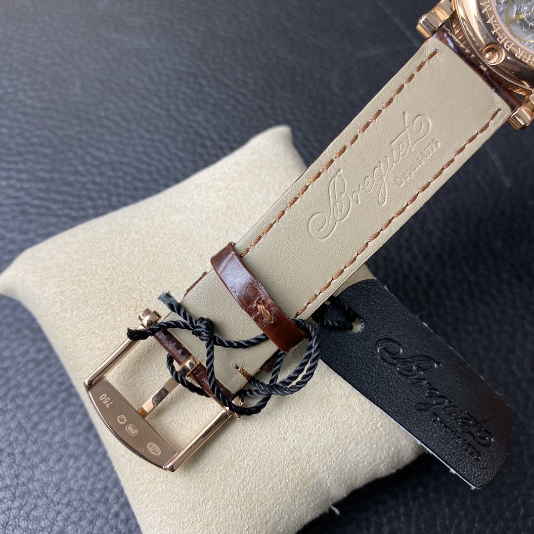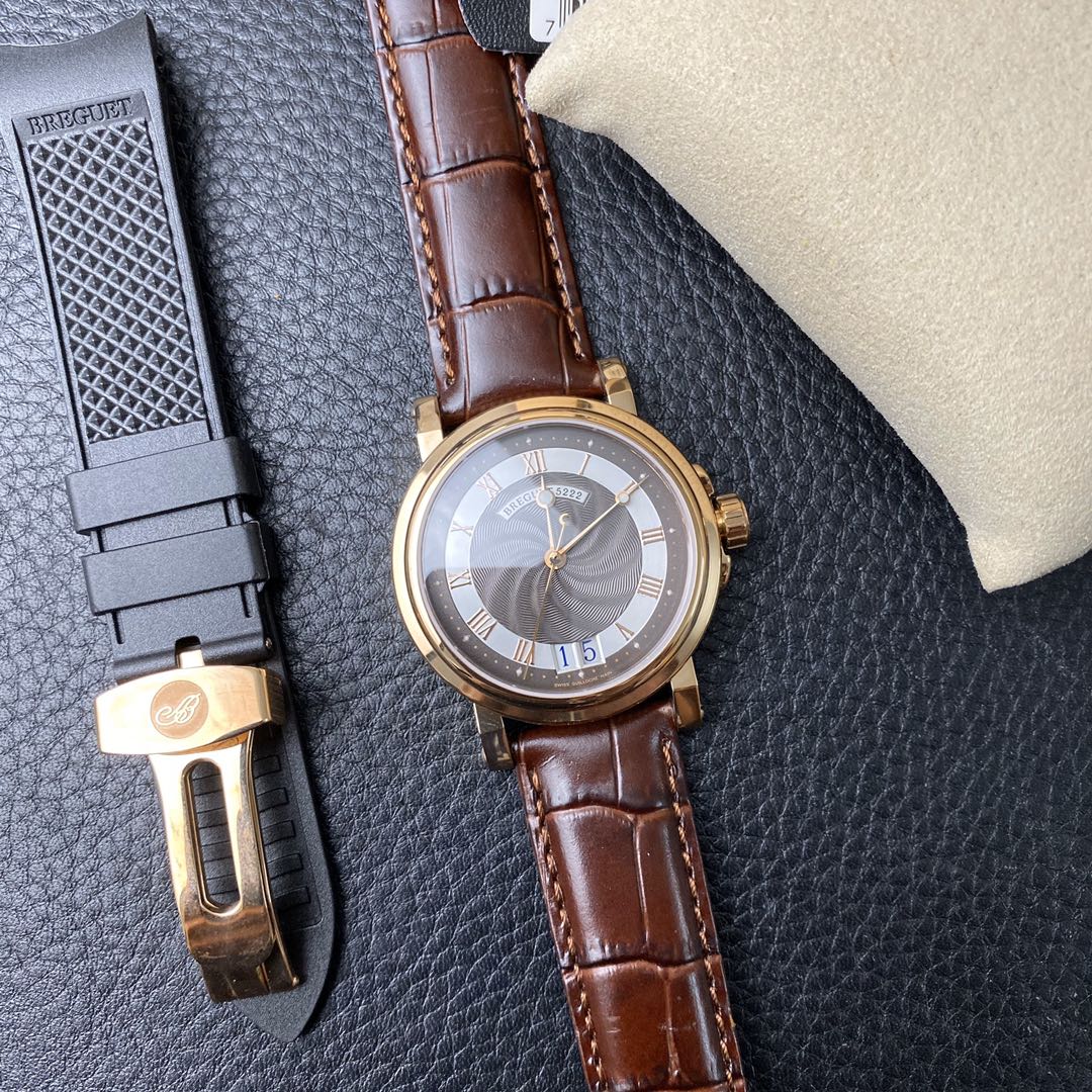 This is the Breguet Marine Series 5817 wristwatch, with a diameter of 39mm. It is powered by the reissued Breguet Cal.517GG movement. The watch features Breguet hands (hollow eccentric “moon-shaped” hands) and Breguet numerals. The central part of the dial adopts the signature wave pattern of the Marine series, which is also echoed by the wave-like texture on the balance wheel of the movement. The watch has an exquisite and elegant appearance, combining both a sense of fashion and sophistication. It is a great choice for both business and casual occasions.
