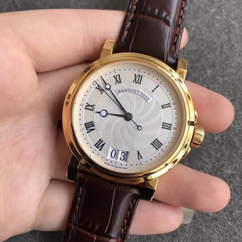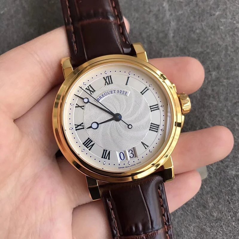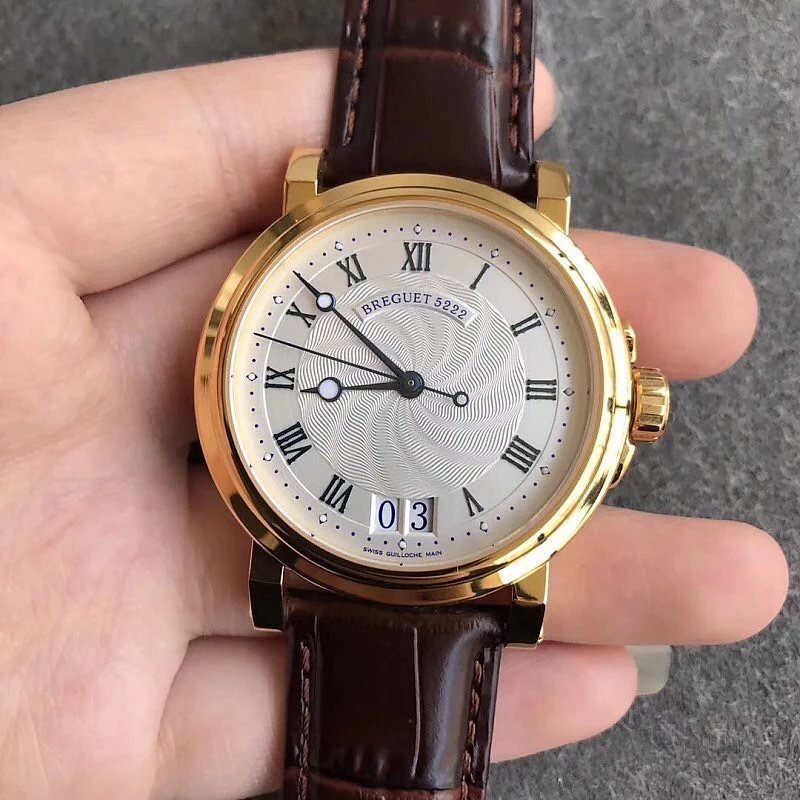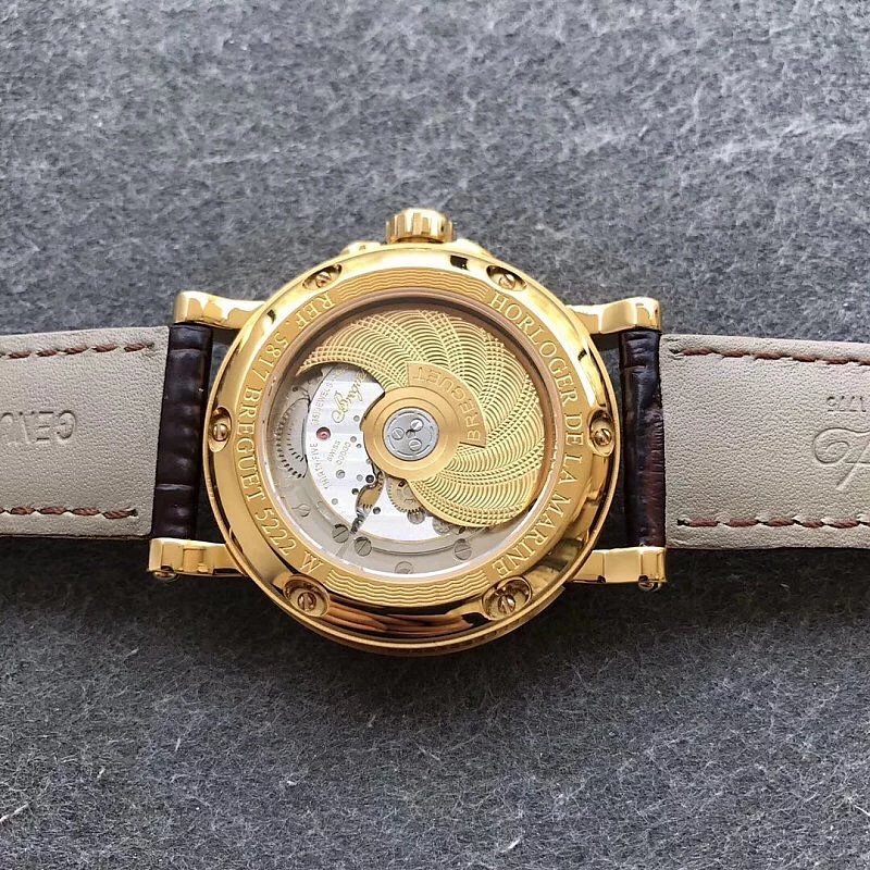 This is the Breguet Marine Series 5817 wristwatch, with a diameter of 39mm. It is powered by the reissued Breguet Cal.517GG movement. The watch features Breguet hands (hollow eccentric “moon-shaped” hands) and Breguet numerals. The central part of the dial adopts the signature wave pattern of the Marine series, which is also echoed by the wave-like texture on the balance wheel of the movement. The watch has an exquisite and elegant appearance, combining both a sense of fashion and sophistication. It is a great choice for both business and casual occasions.