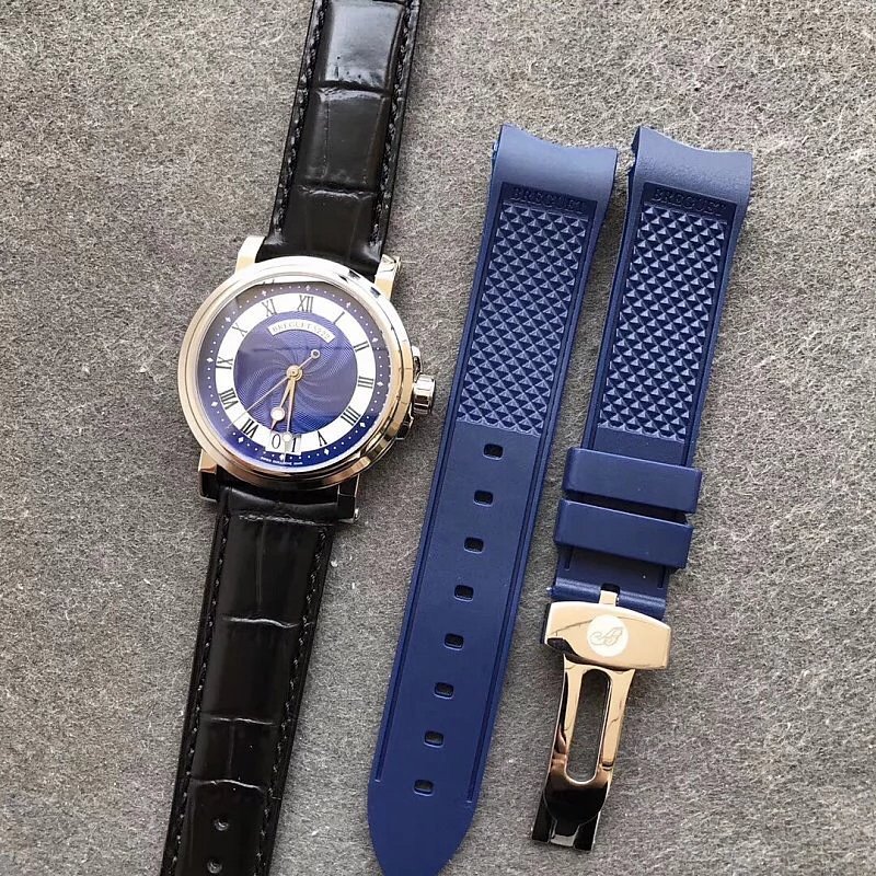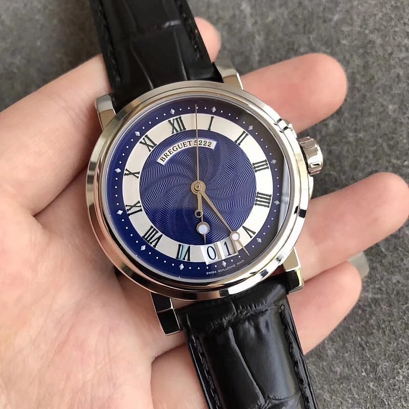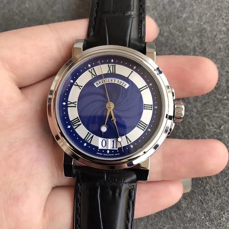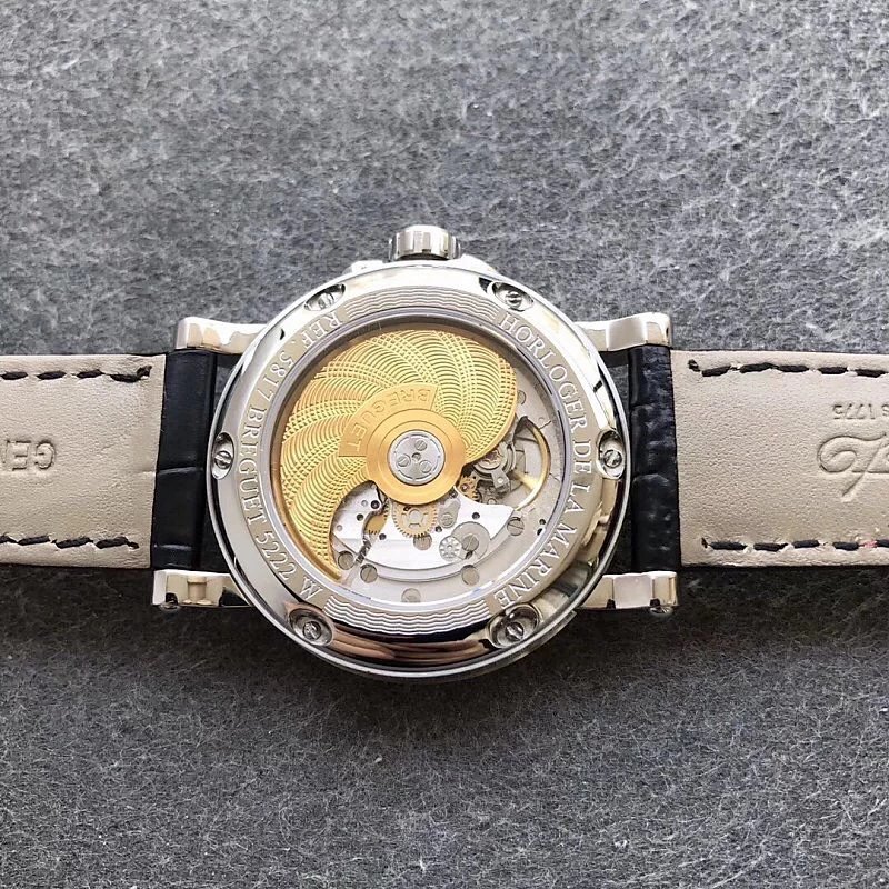 This is the Breguet Marine Series 5817 wristwatch, with a diameter of 39mm. It is powered by the reissued Breguet Cal.517GG movement. The watch features Breguet hands (hollow eccentric “moon-shaped” hands) and Breguet numerals. The central part of the dial adopts the signature wave pattern of the Marine series, which is also echoed by the wave-like texture on the balance wheel of the movement. The watch has an exquisite and elegant appearance, combining both a sense of fashion and sophistication. It is a great choice for both business and casual occasions.