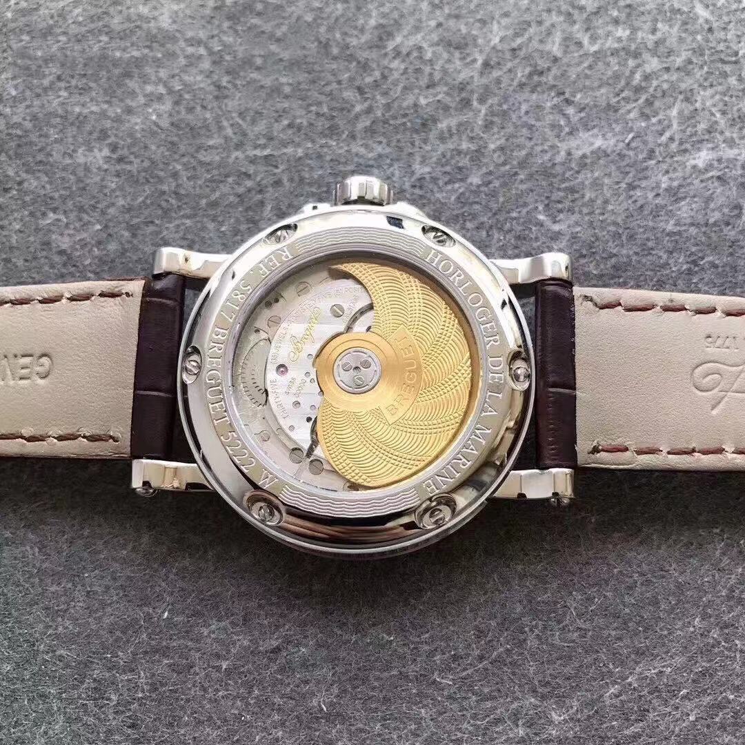 This is the Breguet Marine Series 5817 wristwatch, with a diameter of 39mm. It is powered by the reissued Breguet Cal.517GG movement. The watch features Breguet hands (hollow eccentric “moon-shaped” hands) and Breguet numerals. The central part of the dial adopts the signature wave pattern of the Marine series, which is also echoed by the wave-like texture on the balance wheel of the movement. The watch has an exquisite and elegant appearance, combining both a sense of fashion and sophistication. It is a great choice for both business and casual occasions.