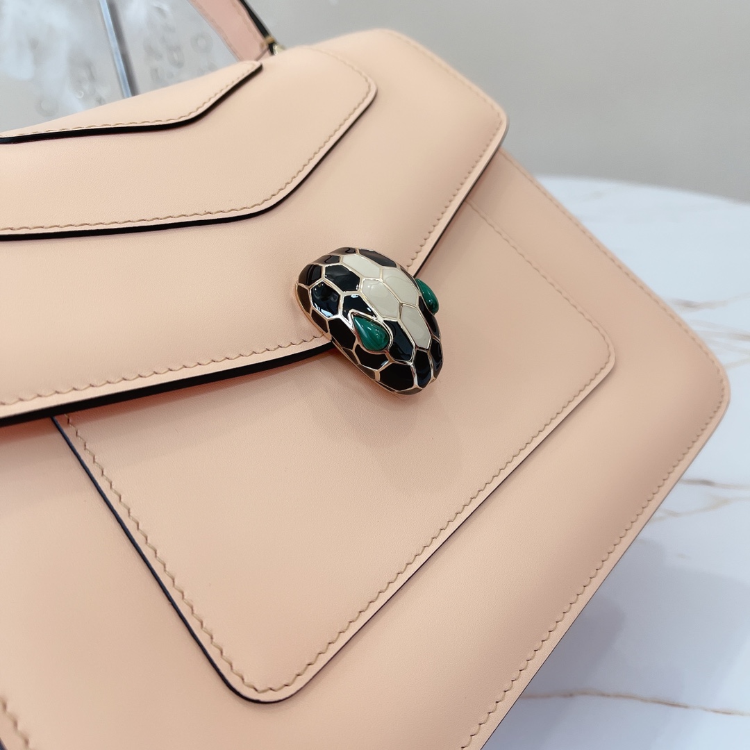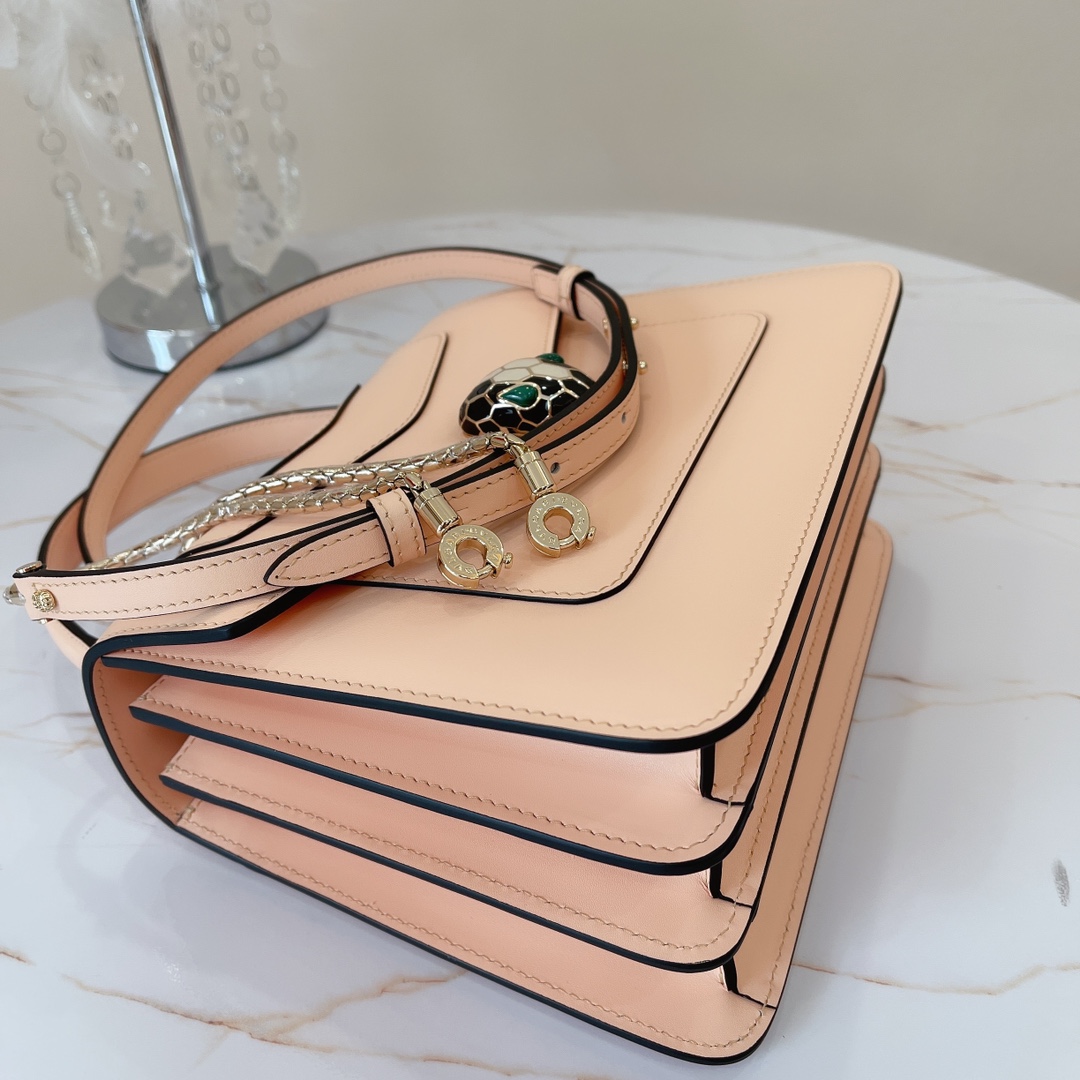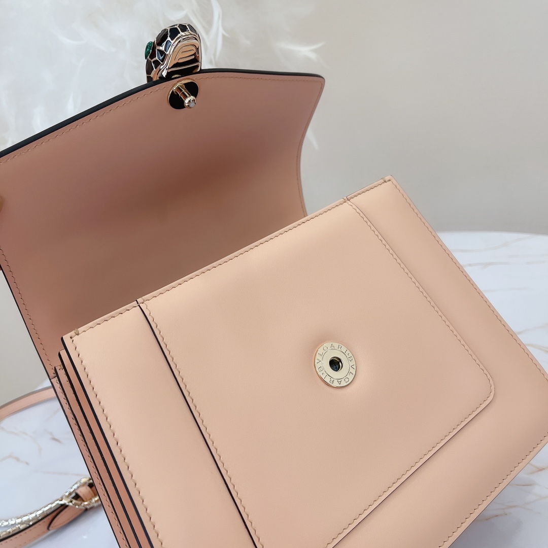 The series of crossbody bags captures a fresh color variation, specially crafted for the upcoming season. This bag is made of peach pink calfskin leather, complemented by light gold-plated brass accents. The iconic snakehead closure is adorned with black and white enamel and green malachite eyes, adding a captivating touch. The hand-carry style includes a back open pocket, three compartments, a zip pocket, and a small mirror. It comes with a detachable and adjustable snake-shaped chain and leather shoulder strap, offering versatile and stylish functionality.