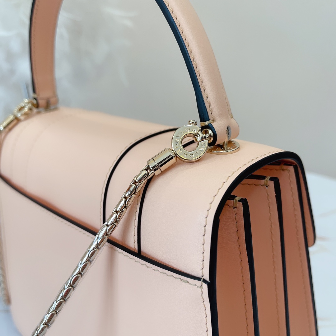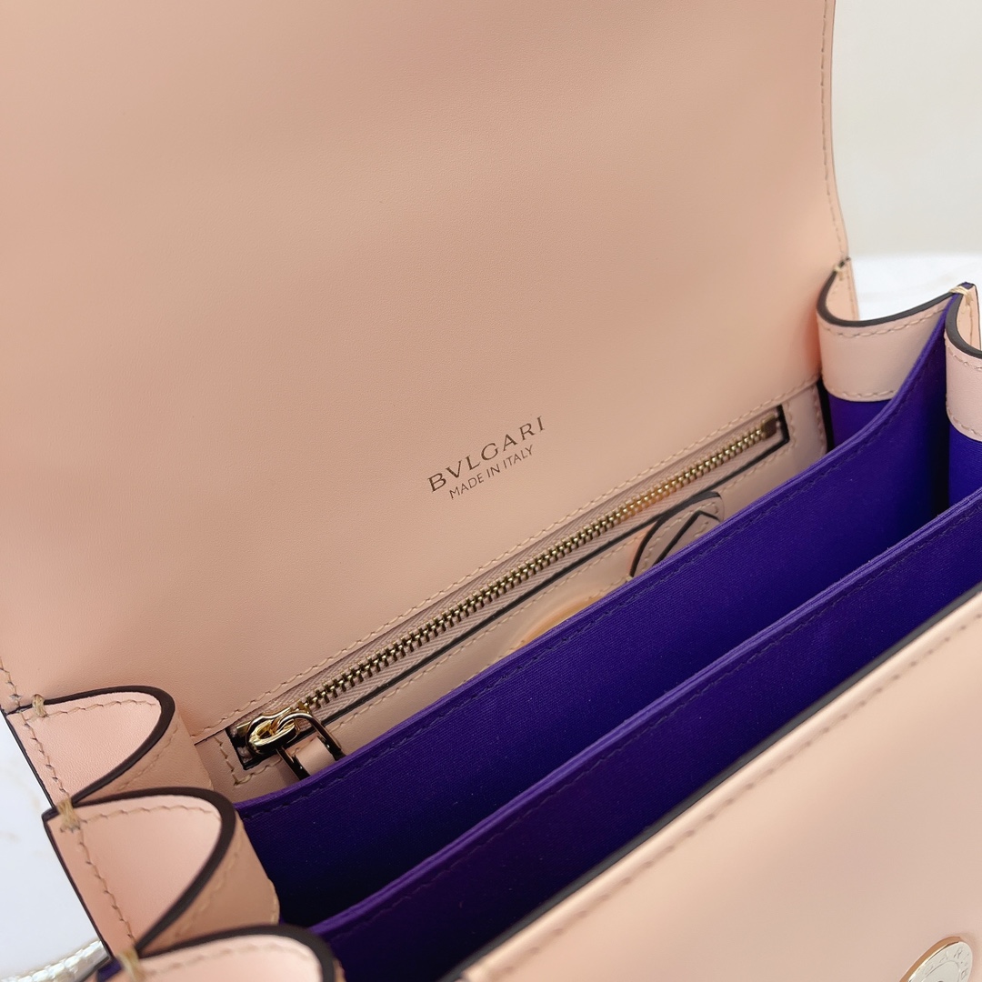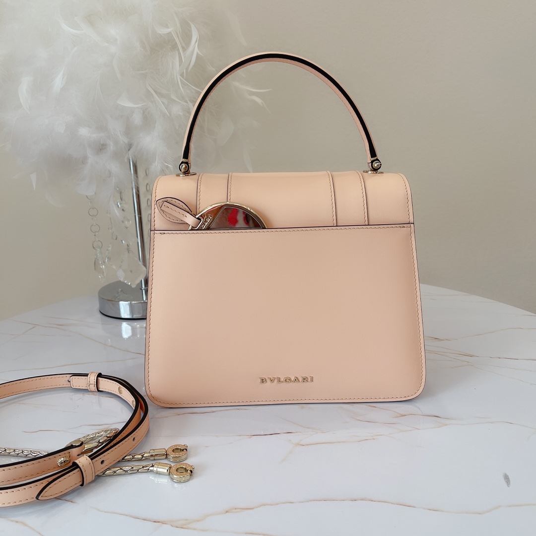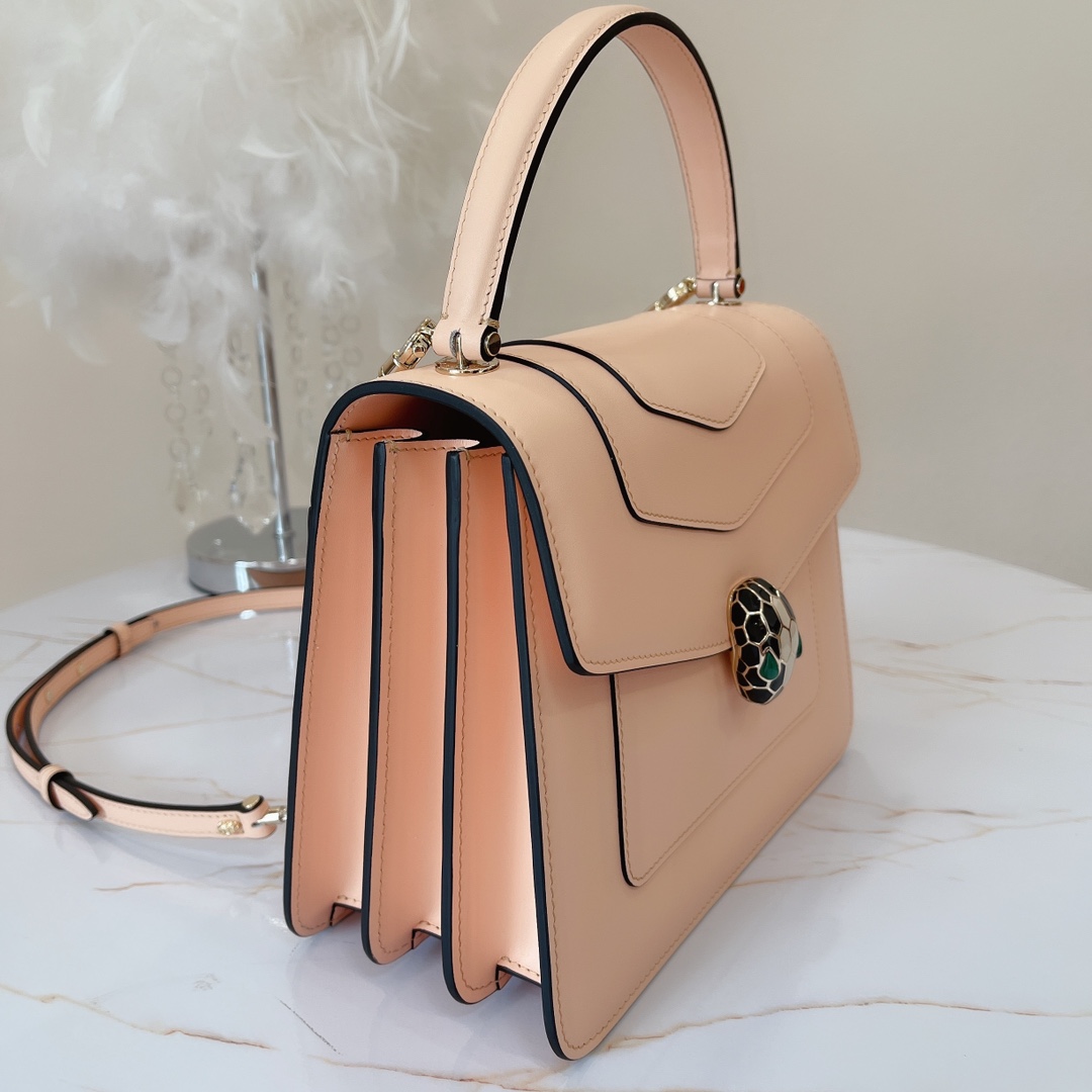 The series of crossbody bags captures a fresh color variation, specially crafted for the upcoming season. This bag is made of peach pink calfskin leather, complemented by light gold-plated brass accents. The iconic snakehead closure is adorned with black and white enamel and green malachite eyes, adding a captivating touch. The hand-carry style includes a back open pocket, three compartments, a zip pocket, and a small mirror. It comes with a detachable and adjustable snake-shaped chain and leather shoulder strap, offering versatile and stylish functionality.