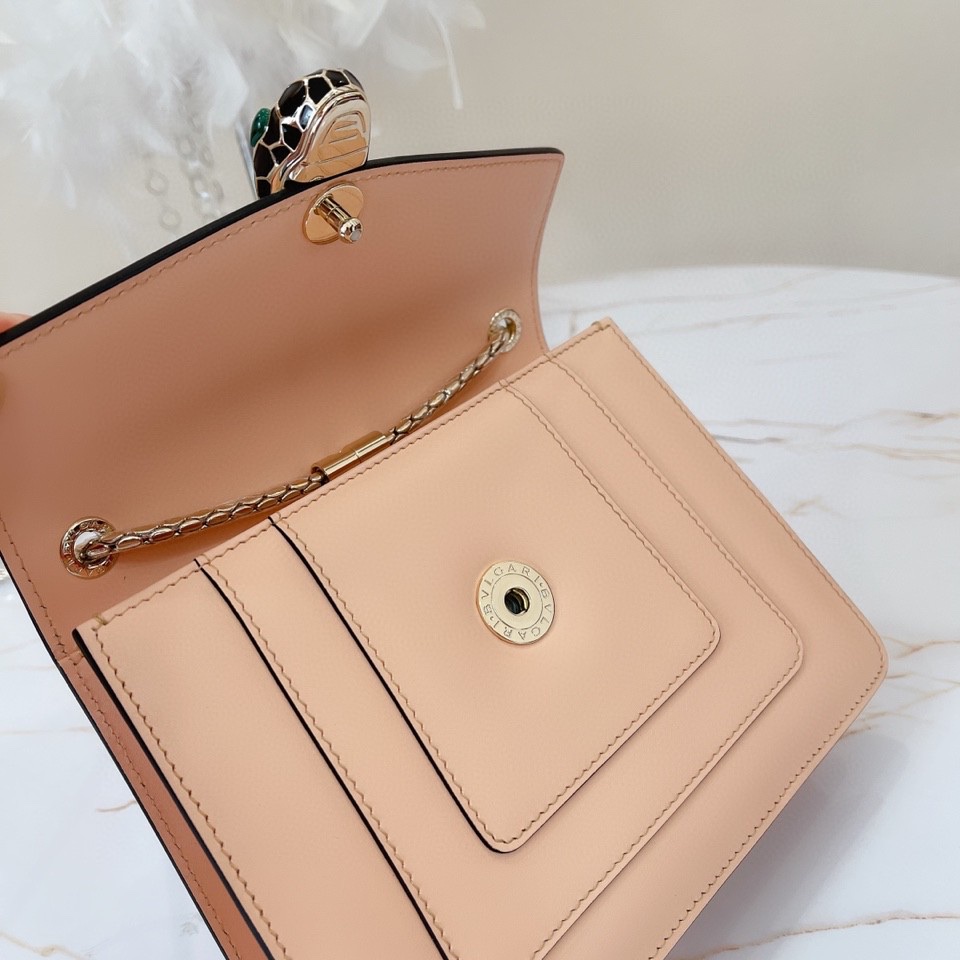 The classic series of crossbody bags captures a fresh color variation, specially designed to welcome the upcoming season. This bag is made of peach pink calfskin leather, complemented by light gold-plated brass accents. The iconic snakehead closure is adorned with black and white enamel and green malachite eyes, creating a captivating and enchanting look. It features an internal open pocket and a small mirror.