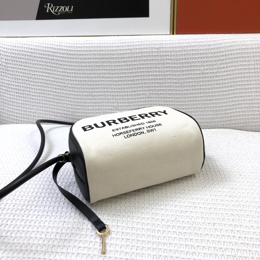 This Burberry handbag, originally a high-quality fashion show piece, has been transformed into a compact and stylish bowling bag. The exterior is made of 100% cotton with decorative elements crafted from 100% calf leather. The interior is lined with 100% calf leather. It features a detachable crossbody strap.