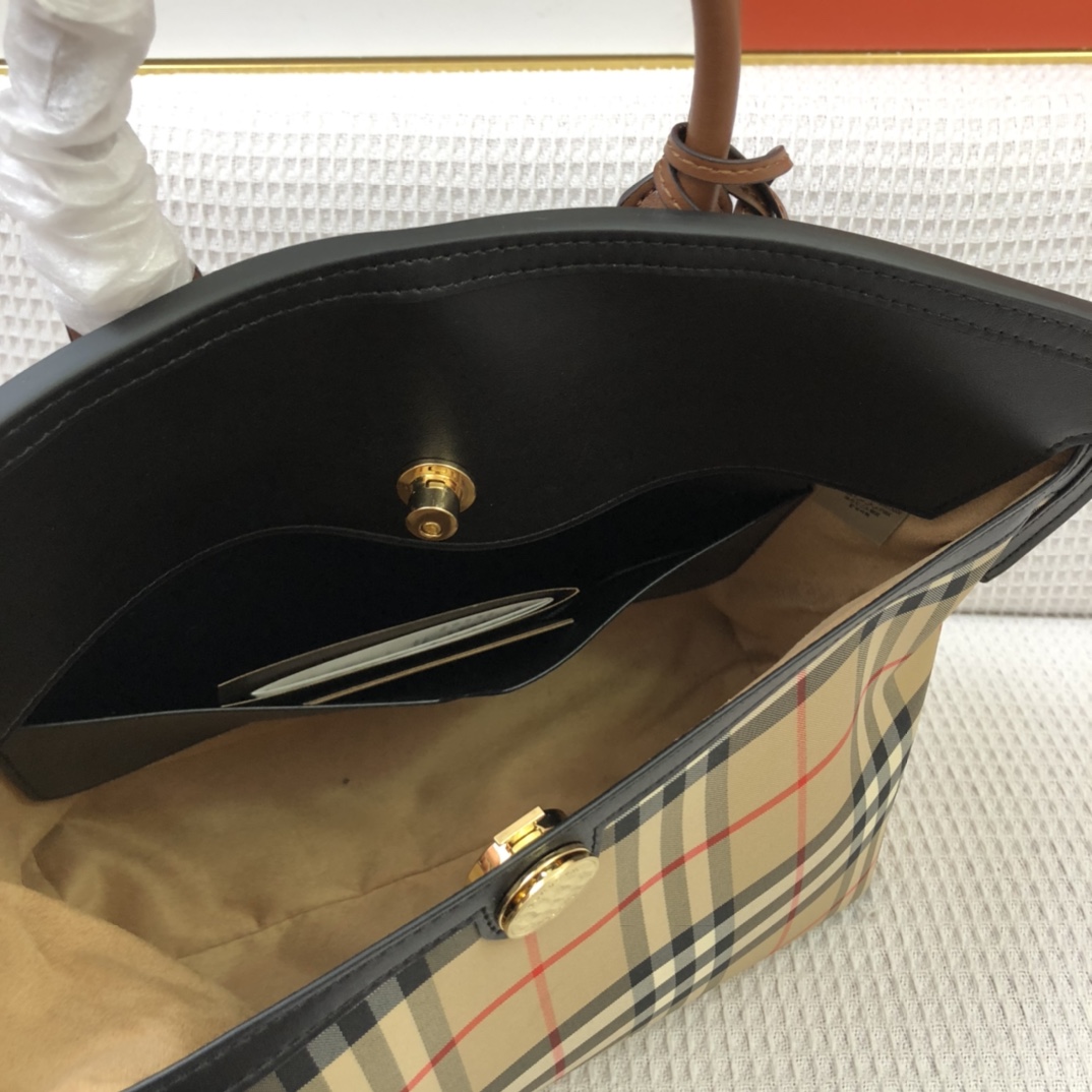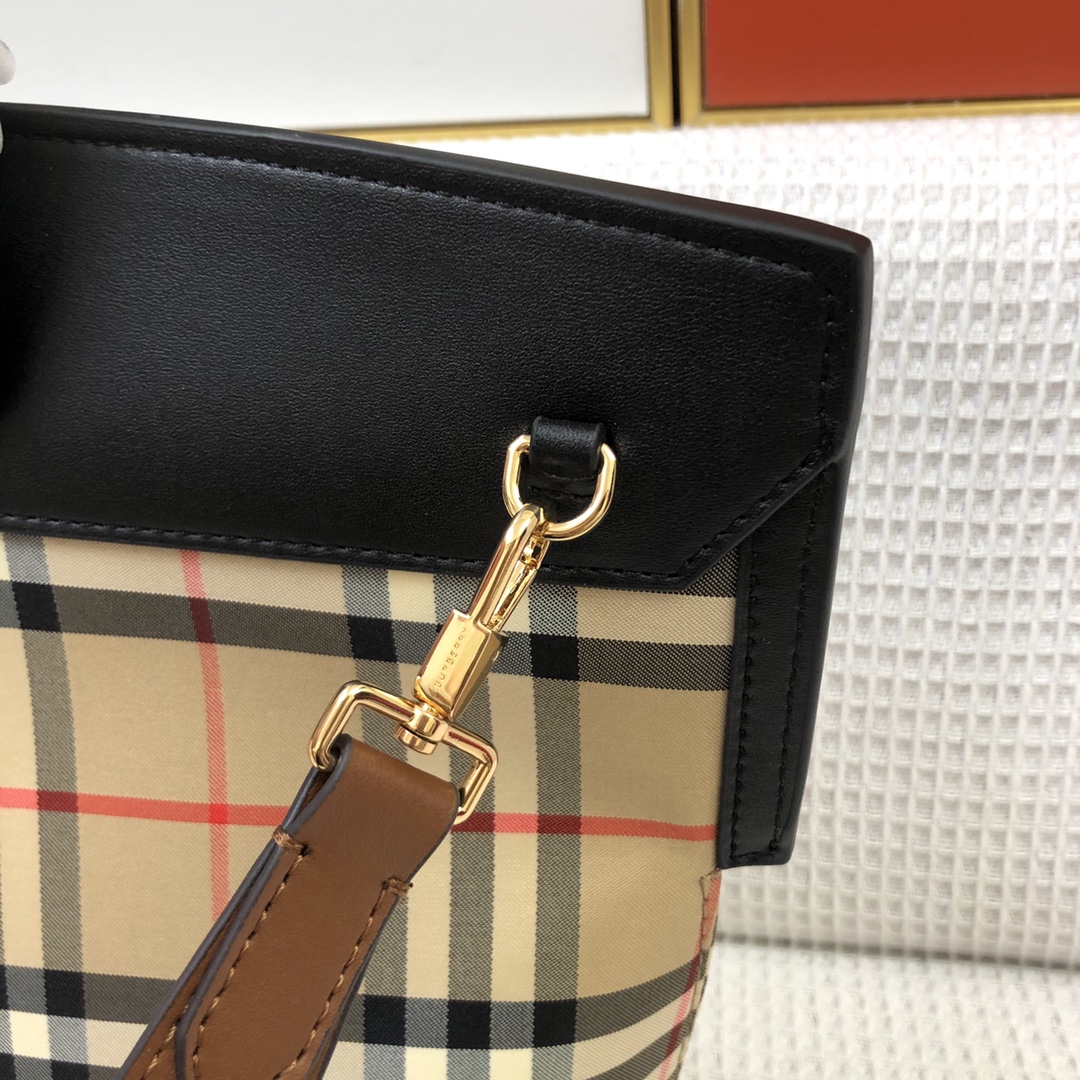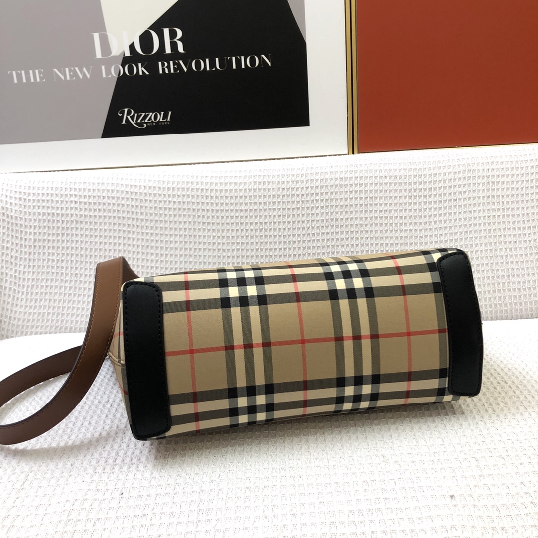 This Burberry handbag, named “Society – Seldy Bag,” is a fashion show piece crafted with meticulous attention to detail. It is made from dual-tone leather and features the iconic Vintage Check pattern. The interior is lined with suede. The bag comes with a detachable strap, allowing it to be worn as a shoulder or crossbody bag.