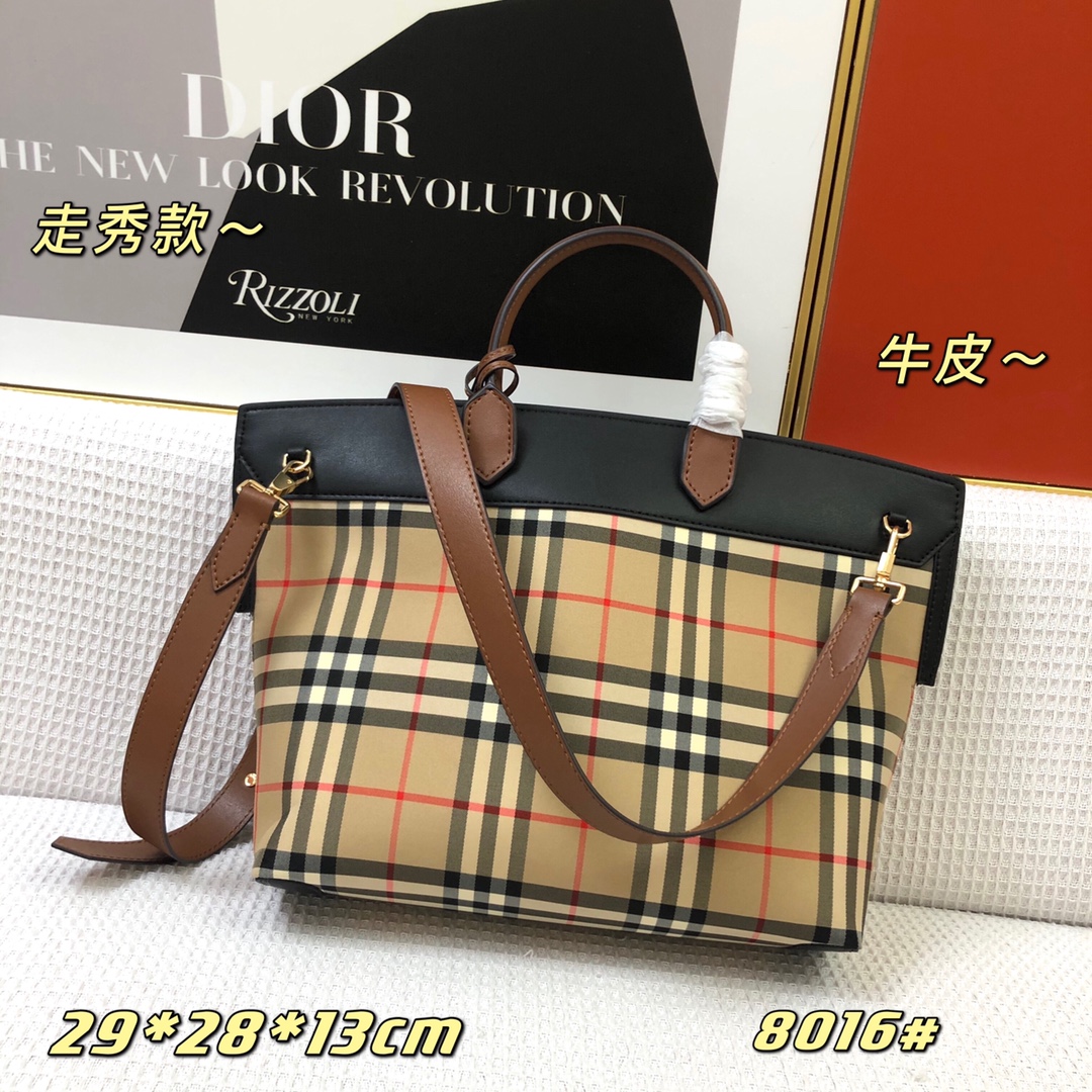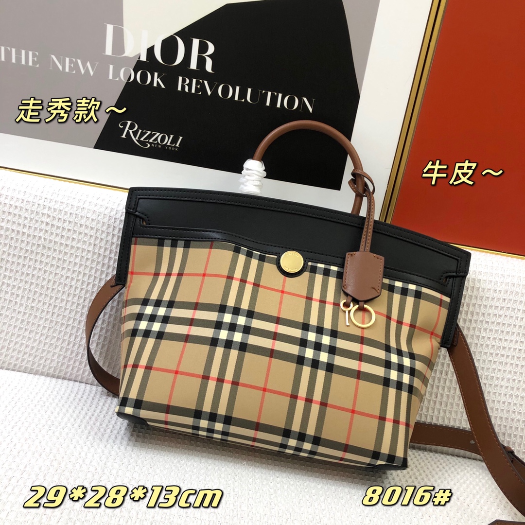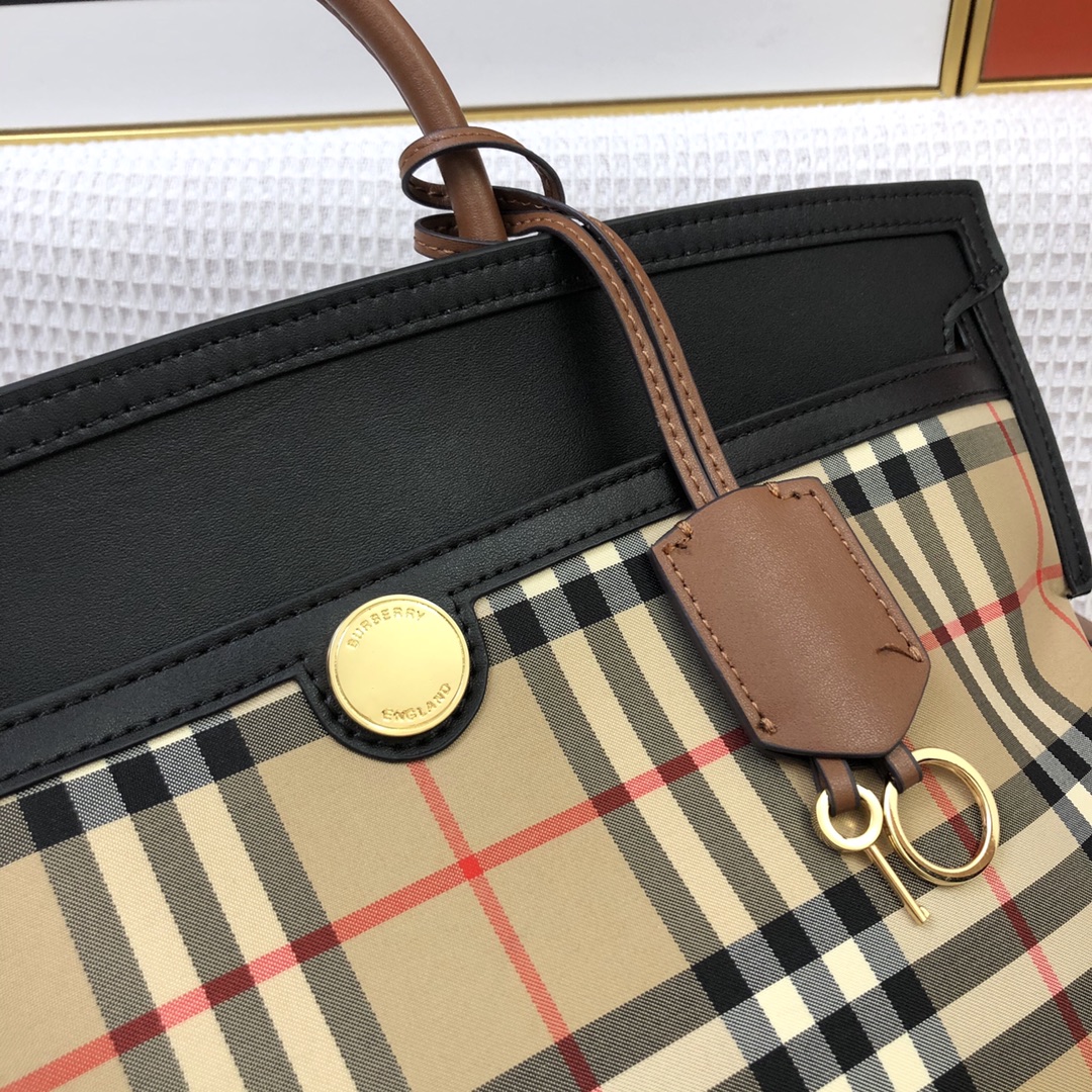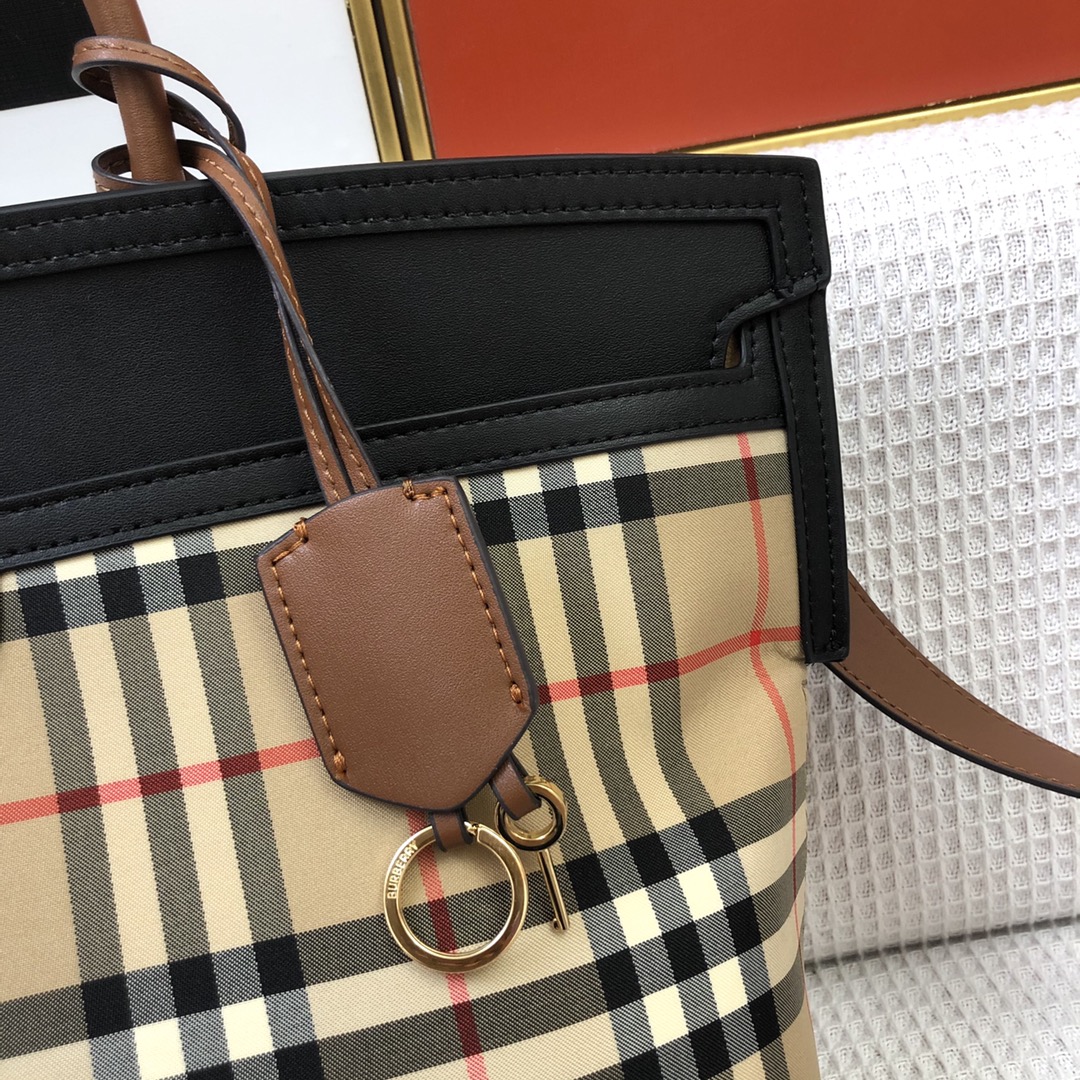 This Burberry handbag, named “Society – Seldy Bag,” is a fashion show piece crafted with meticulous attention to detail. It is made from dual-tone leather and features the iconic Vintage Check pattern. The interior is lined with suede. The bag comes with a detachable strap, allowing it to be worn as a shoulder or crossbody bag.