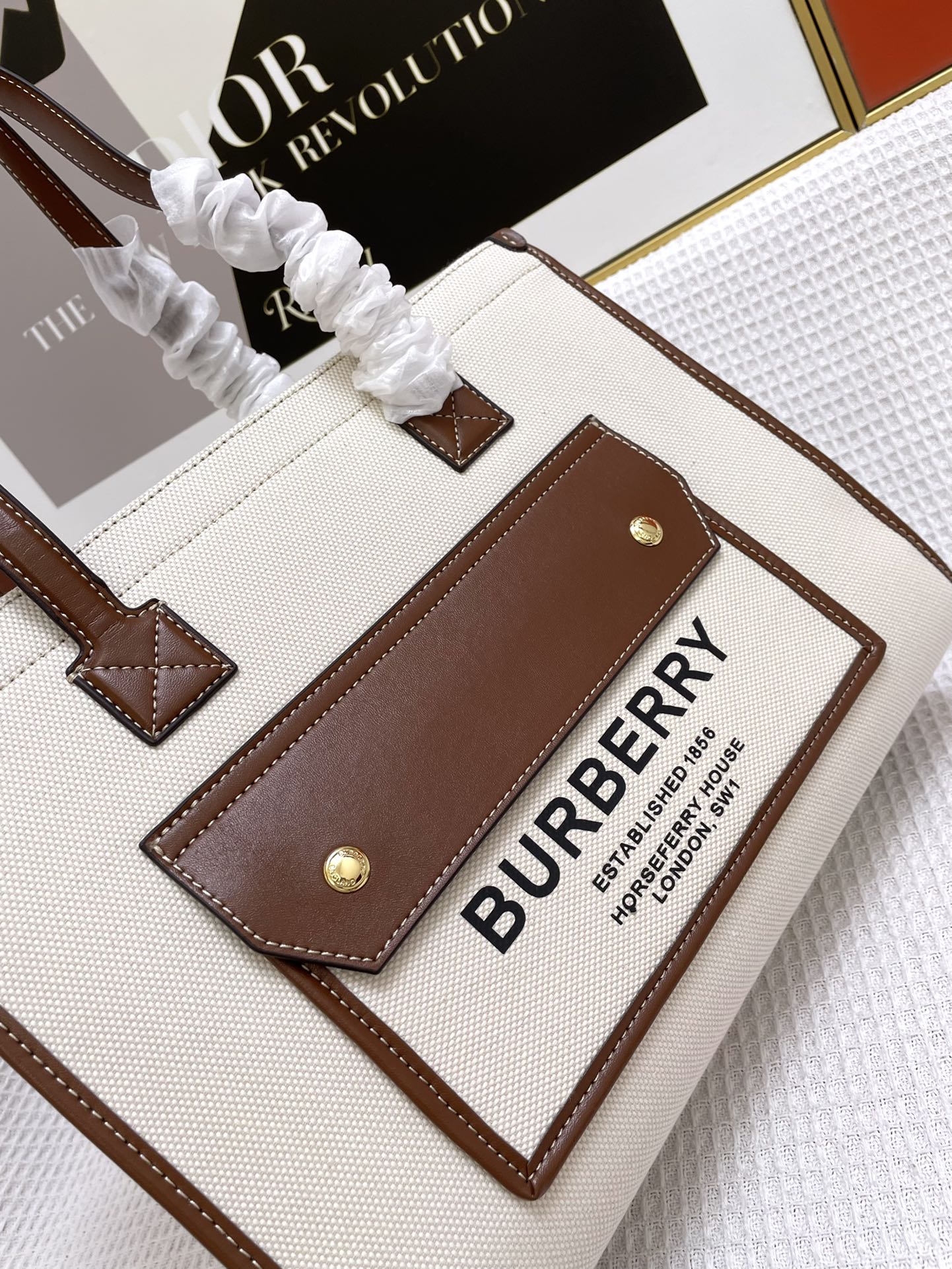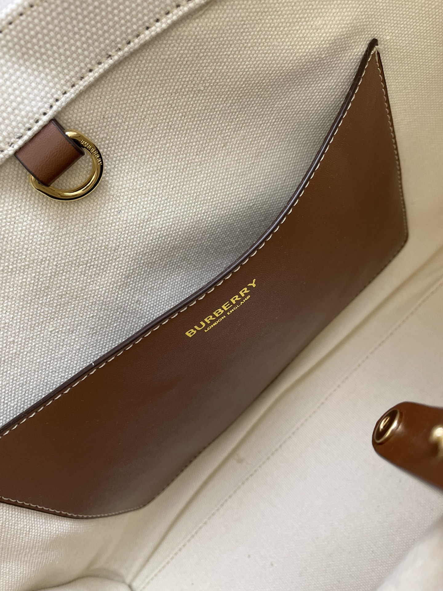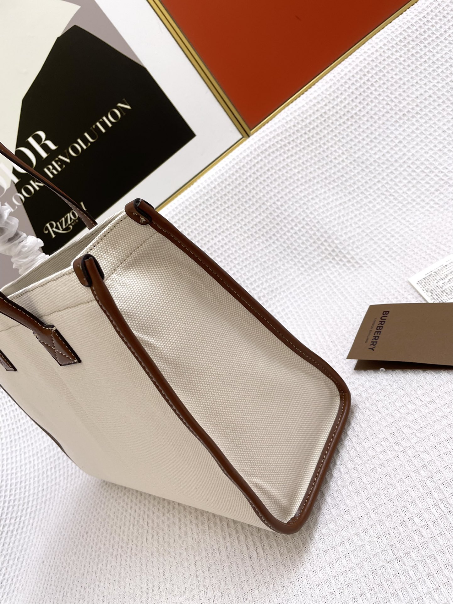 【Burberry Top-Grade Original】Dual-tone canvas and leather Freya tote bag, meticulously crafted in Italy, featuring a combination of grained leather and cotton canvas, adorned with the Horseferry brand print. Can be carried by the top handle or worn over the shoulder.