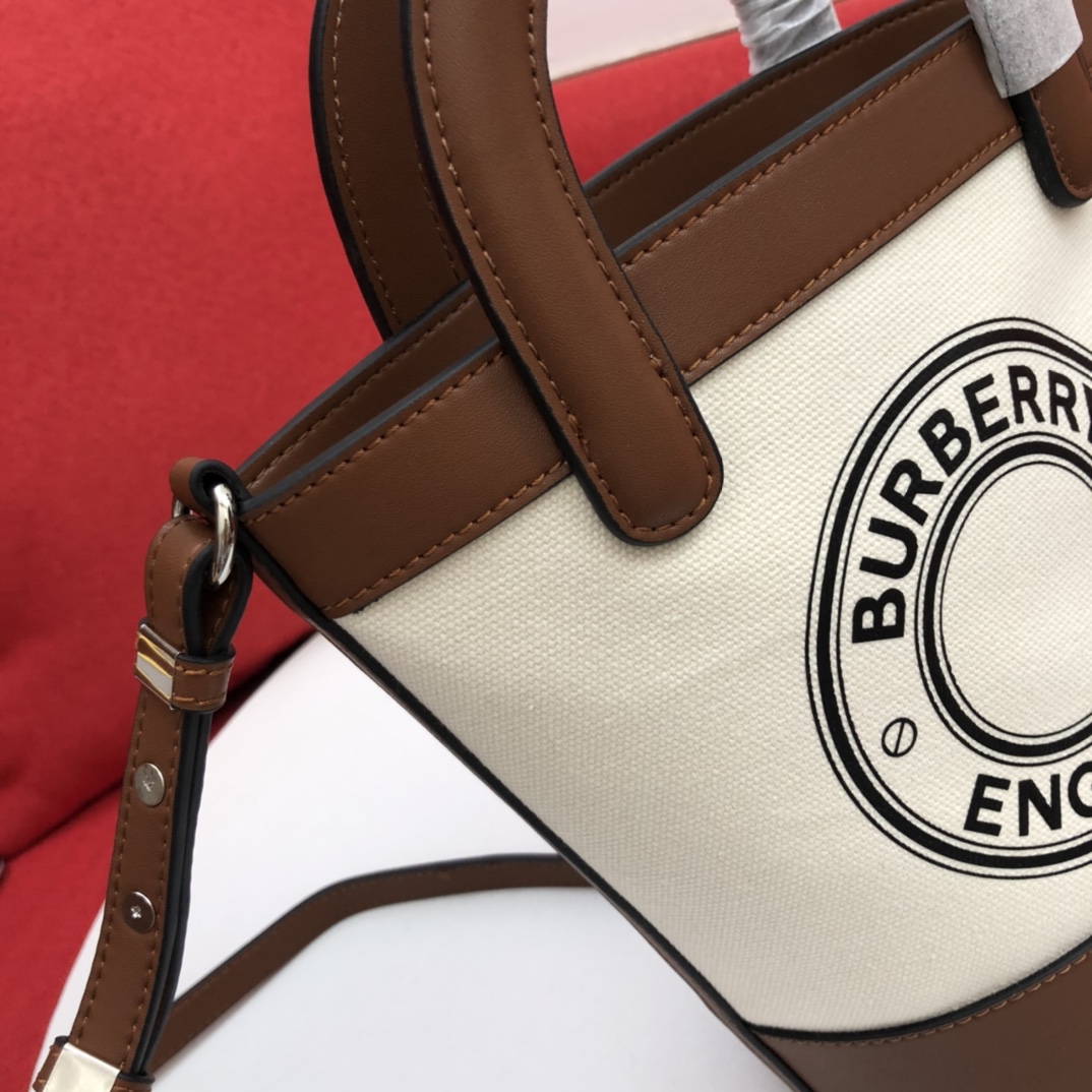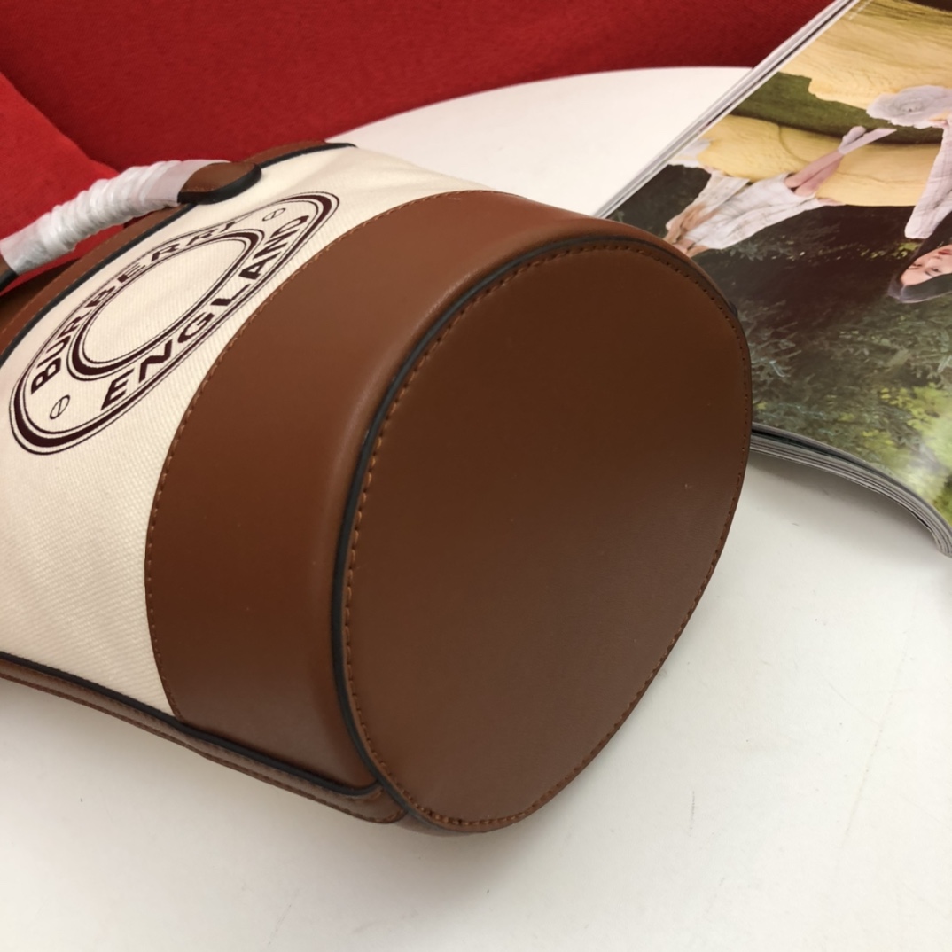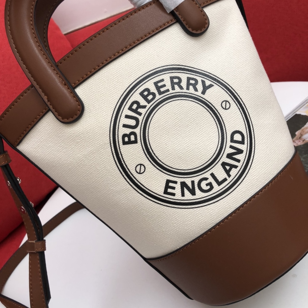 Burberry’s equestrian-inspired cotton canvas bucket bag, featuring contrasting leather edge design and adorned with the brand’s logo pattern. The bag’s compact silhouette is named after Queen Elizabeth II’s Shetland pony. Can be carried by the top handle or with the adjustable shoulder strap.