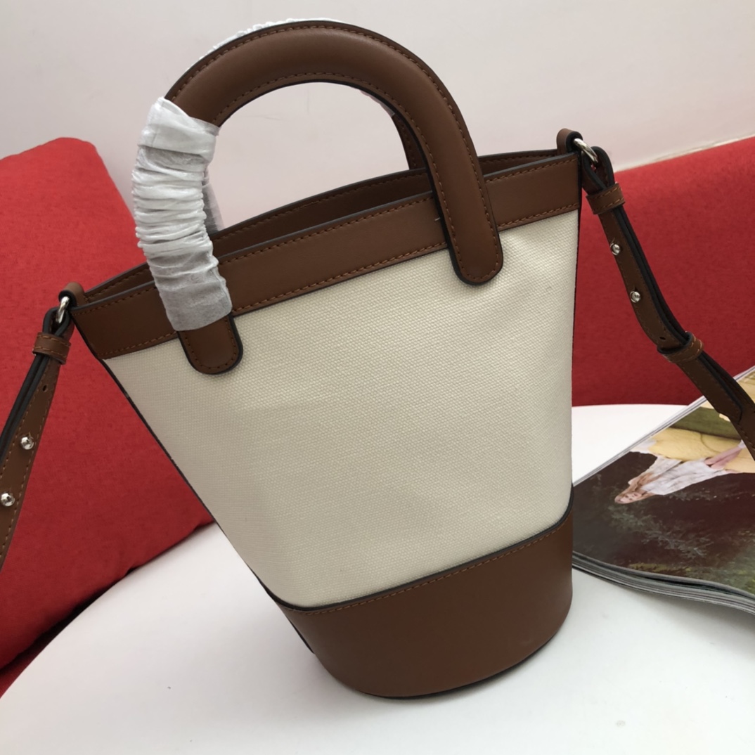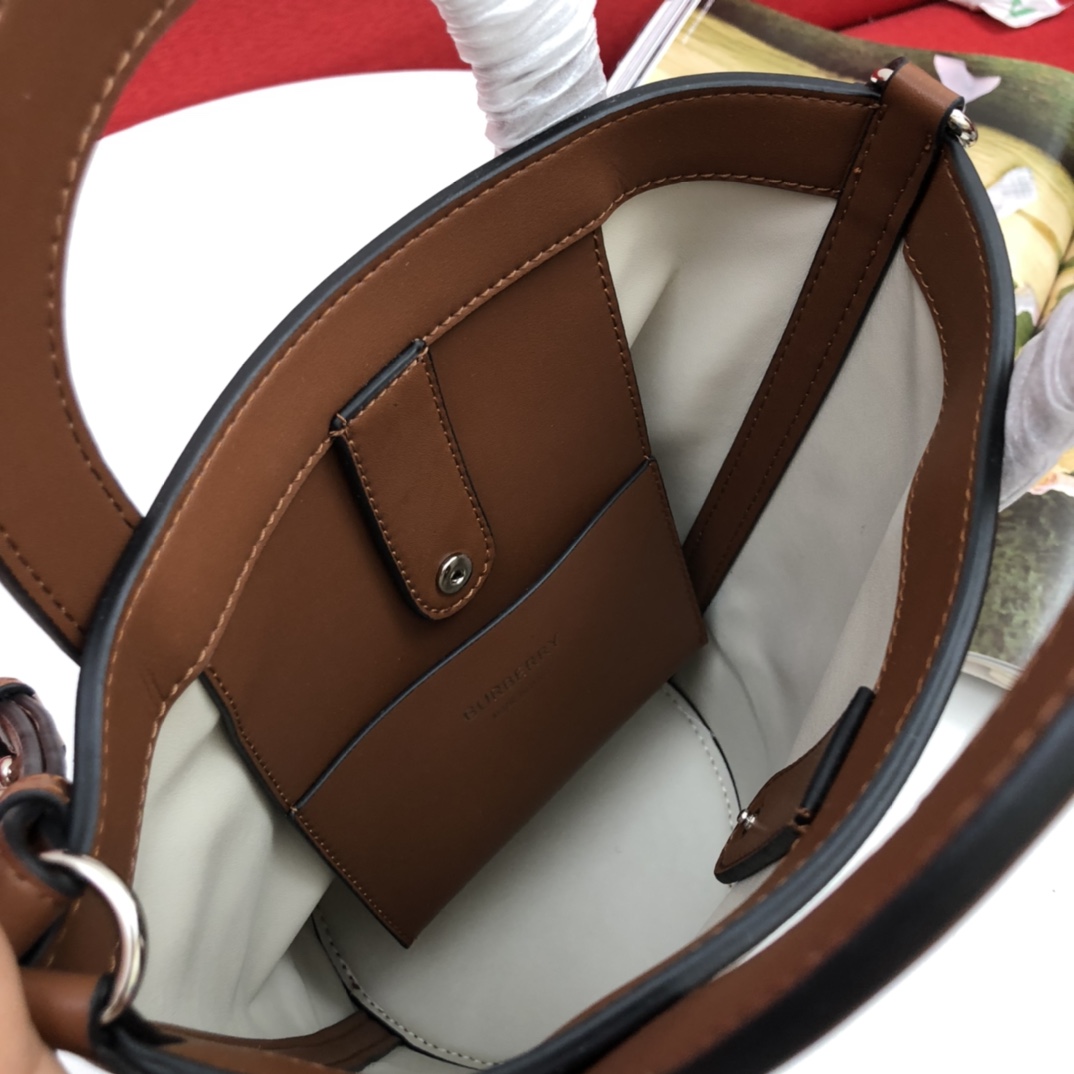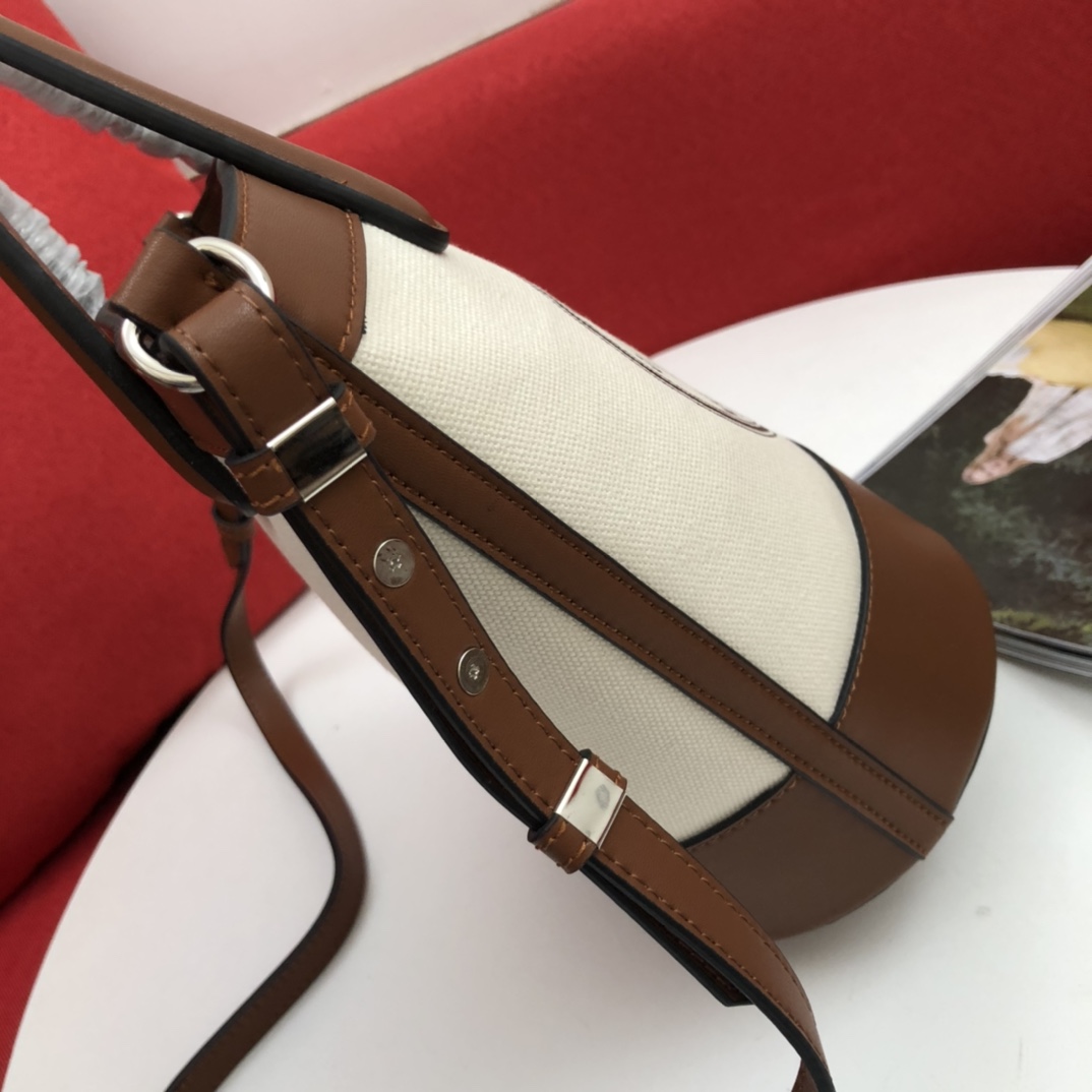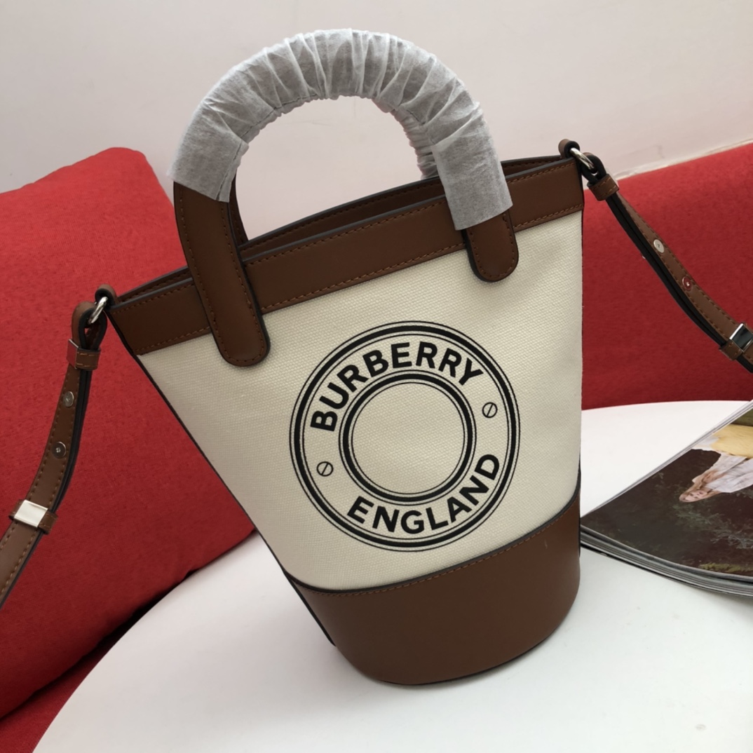 Burberry’s equestrian-inspired cotton canvas bucket bag, featuring contrasting leather edge design and adorned with the brand’s logo pattern. The bag’s compact silhouette is named after Queen Elizabeth II’s Shetland pony. Can be carried by the top handle or with the adjustable shoulder strap.