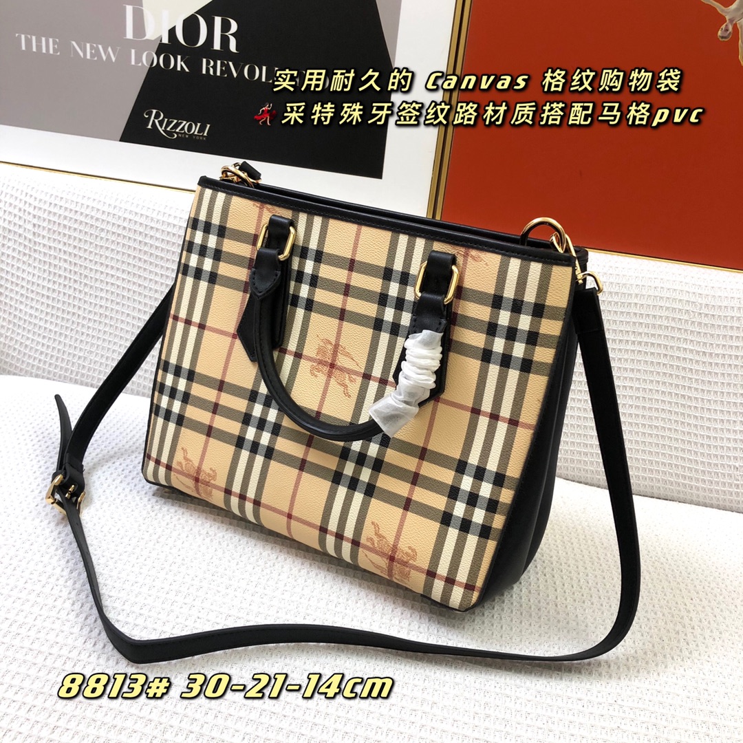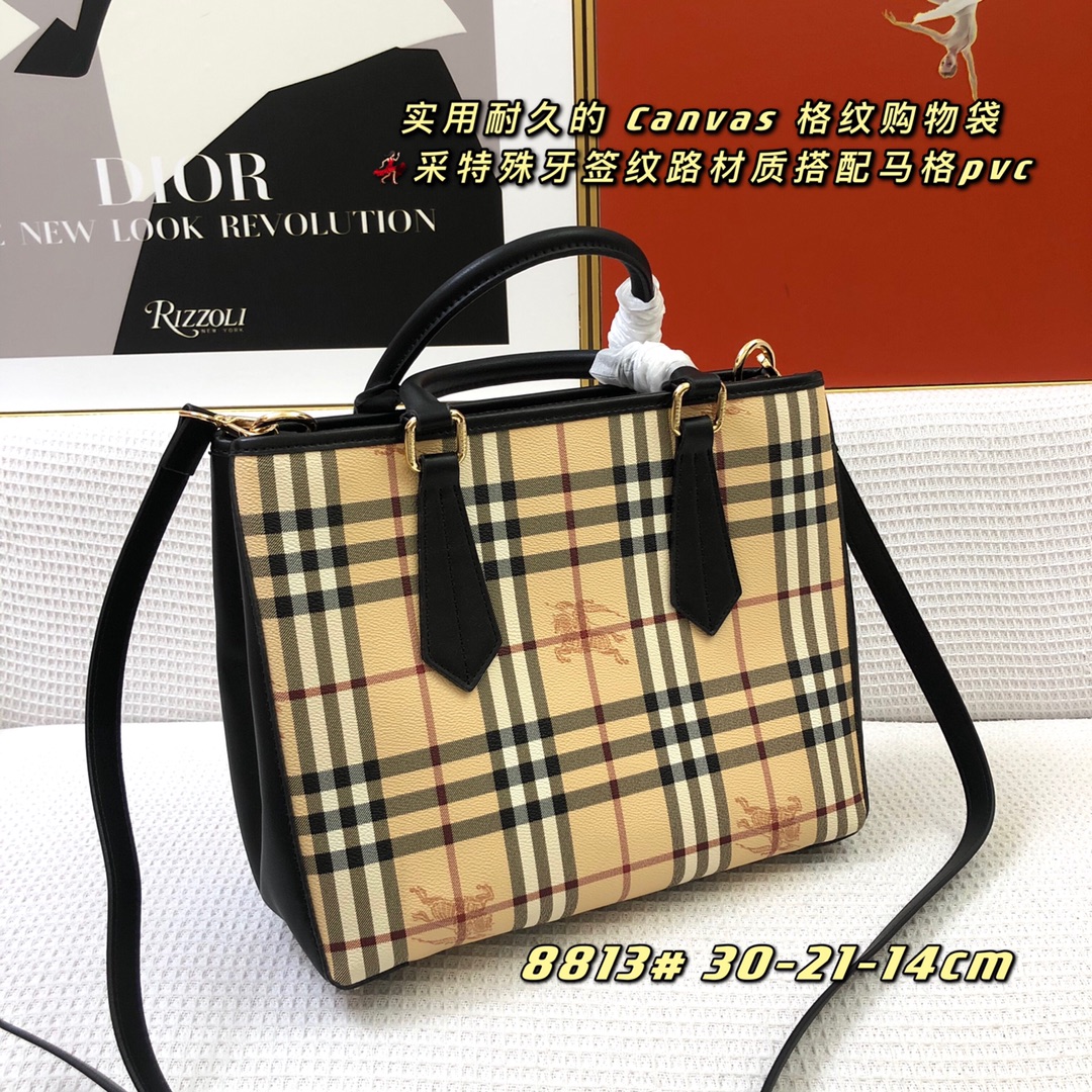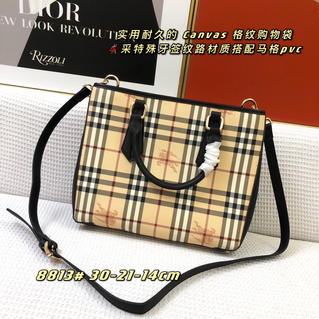 Burberry’s latest practical and durable canvas check shopping bag, featuring a special toothpick texture material combined with mag PVC, perfect for all seasons.