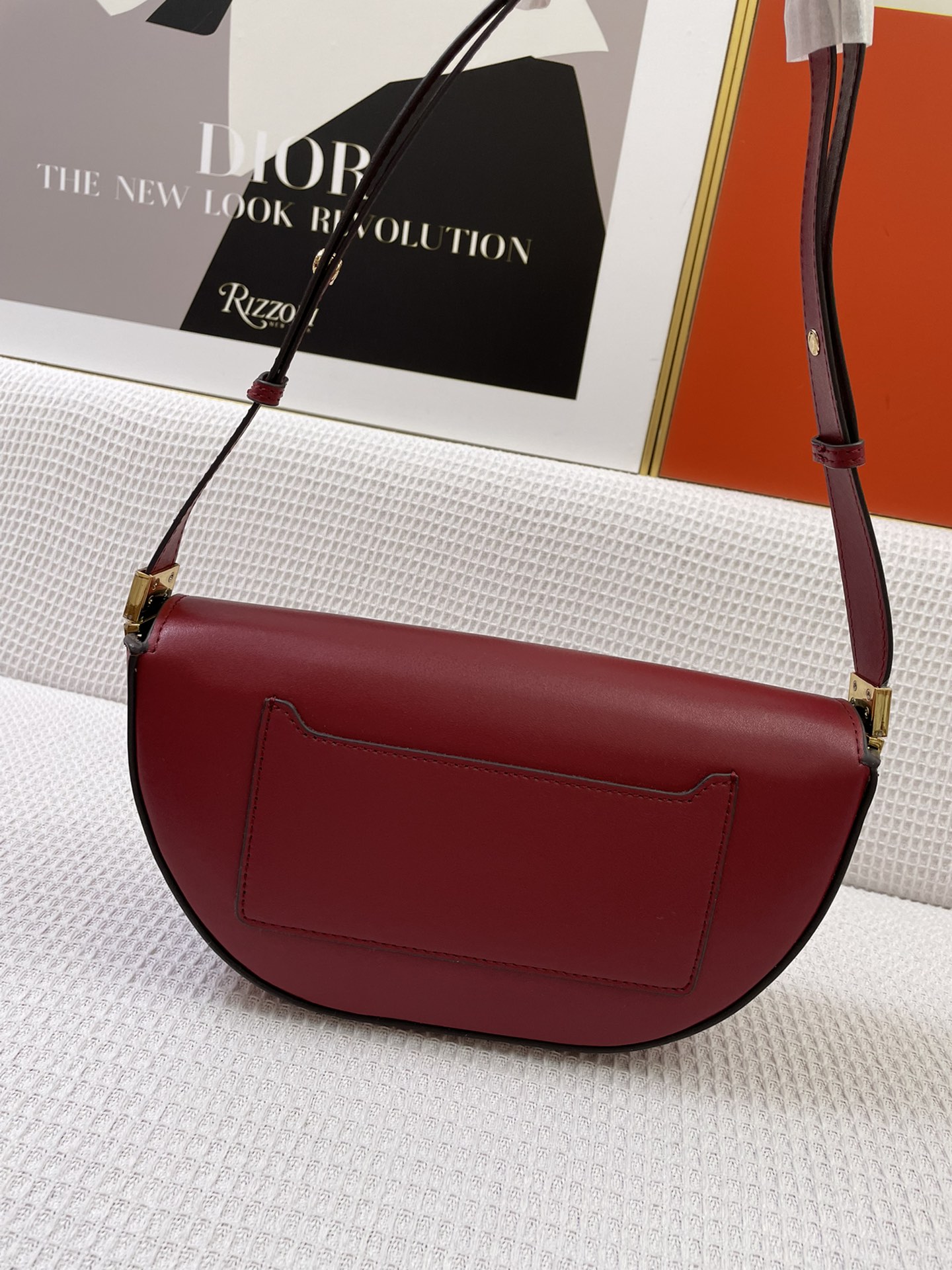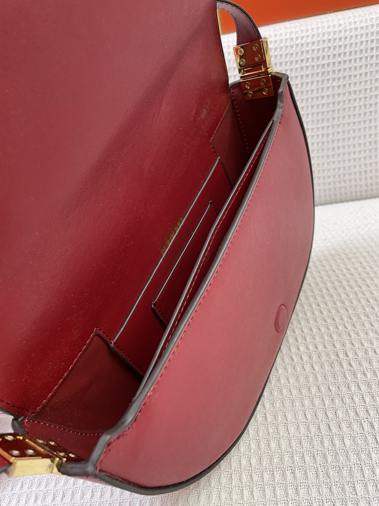 Shortest vertical length for shoulder strap: 10.6 inches. Longest vertical length for shoulder strap: 15.7 inches. Adjustable shoulder strap. It has one interior card slot and one exterior zippered pocket, along with two interior slip pockets. The top flap is secured with a magnetic closure and features hand-painted lacquered edges and shiny metal accessories made in Italy.