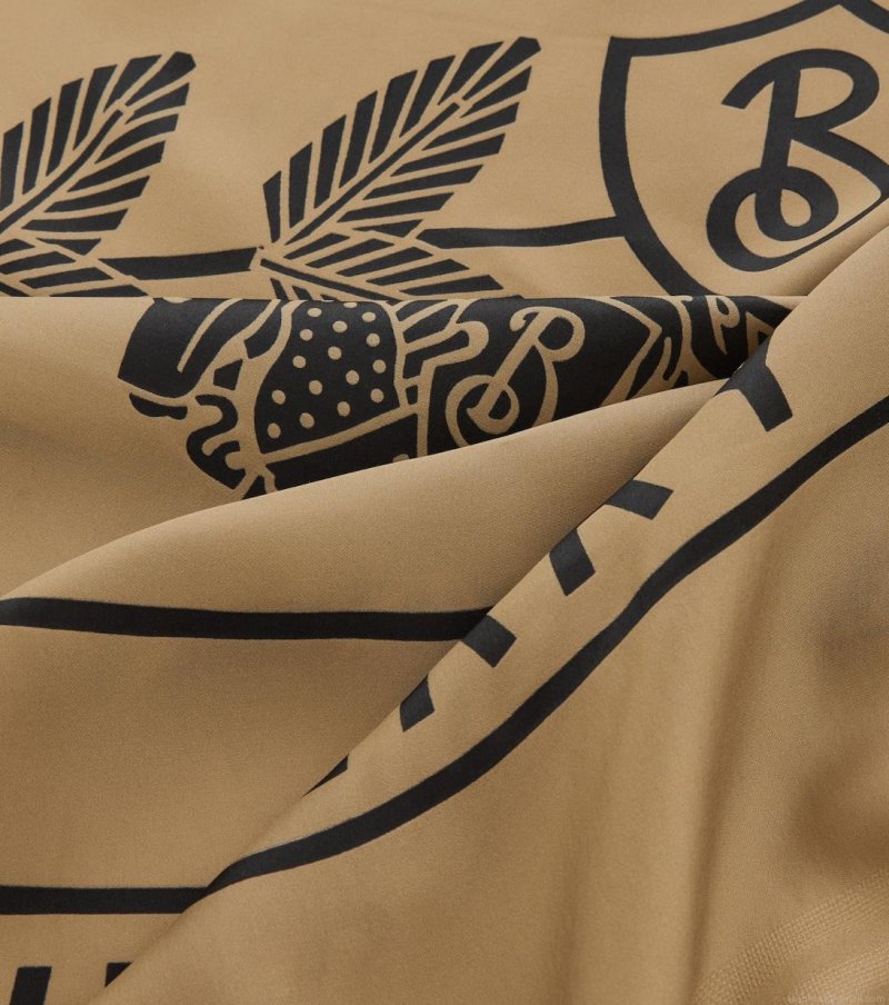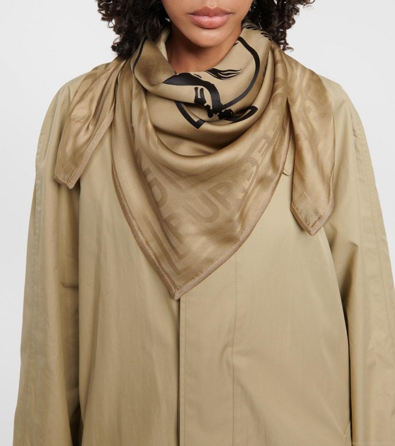 Wrap yourself in this elegant vintage beige silk scarf by Burberry. Featuring the iconic Equestrian Knight logo and stripe details, it embodies timeless sophistication in a classic square design.