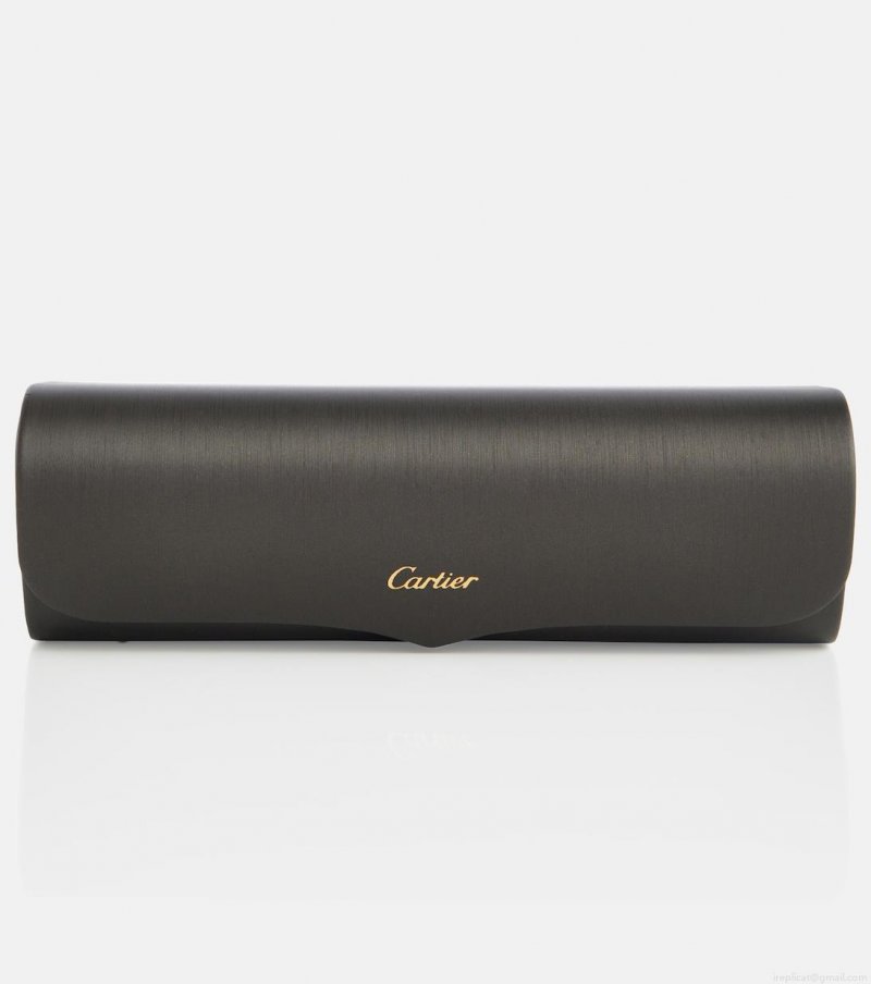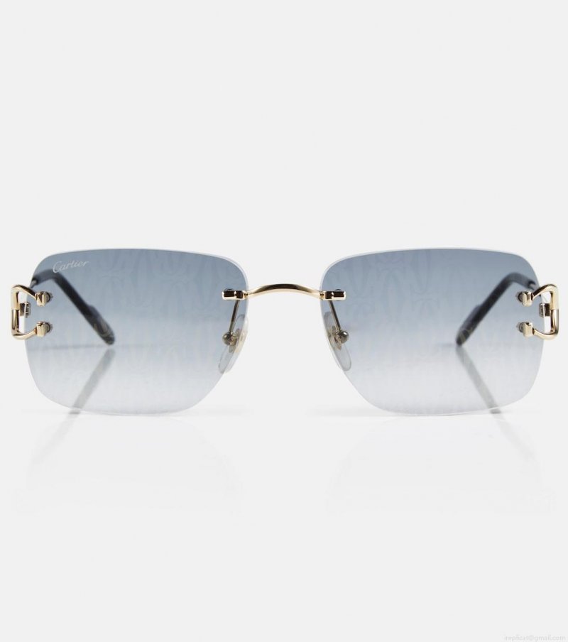 Cartier's expertise in jewelry-making extends to the Cartier Eyewear Collection, a line of exquisite styles for everyday wear. These rectangular sunglasses have rimless, angled tinted lenses and thin, logo-embossed, golden metal frames.