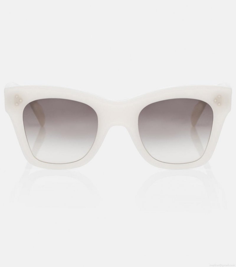 Celine Eyewear looks to the future with designs like these off-white sunglasses. Made in Italy from transparent acetate, they have an angular cat-eye silhouette with wide temples and gradient grey lenses.