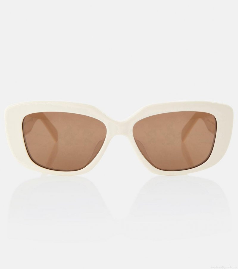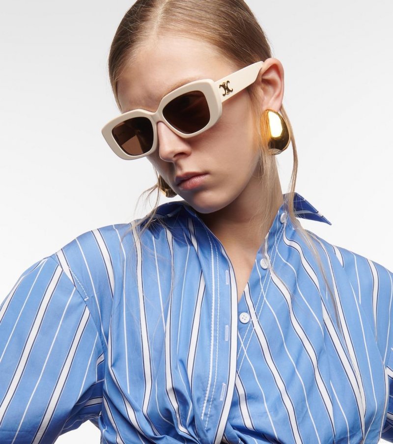 These Celine Eyewear sunglasses are made in Italy from beige acetate and shaped into an elongated squared frame. They feature brown-tinted lenses and a gold-toned logo on the temples.