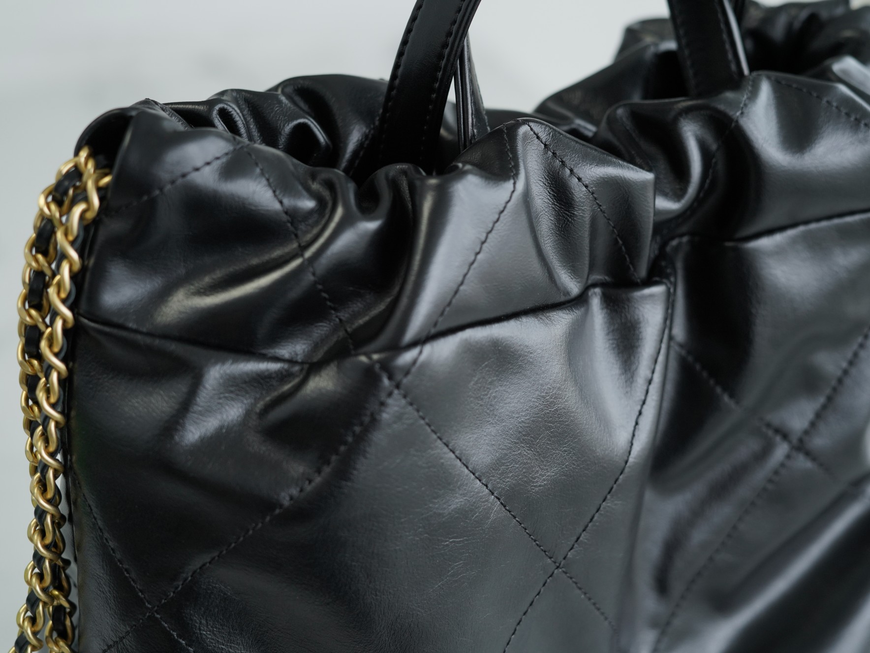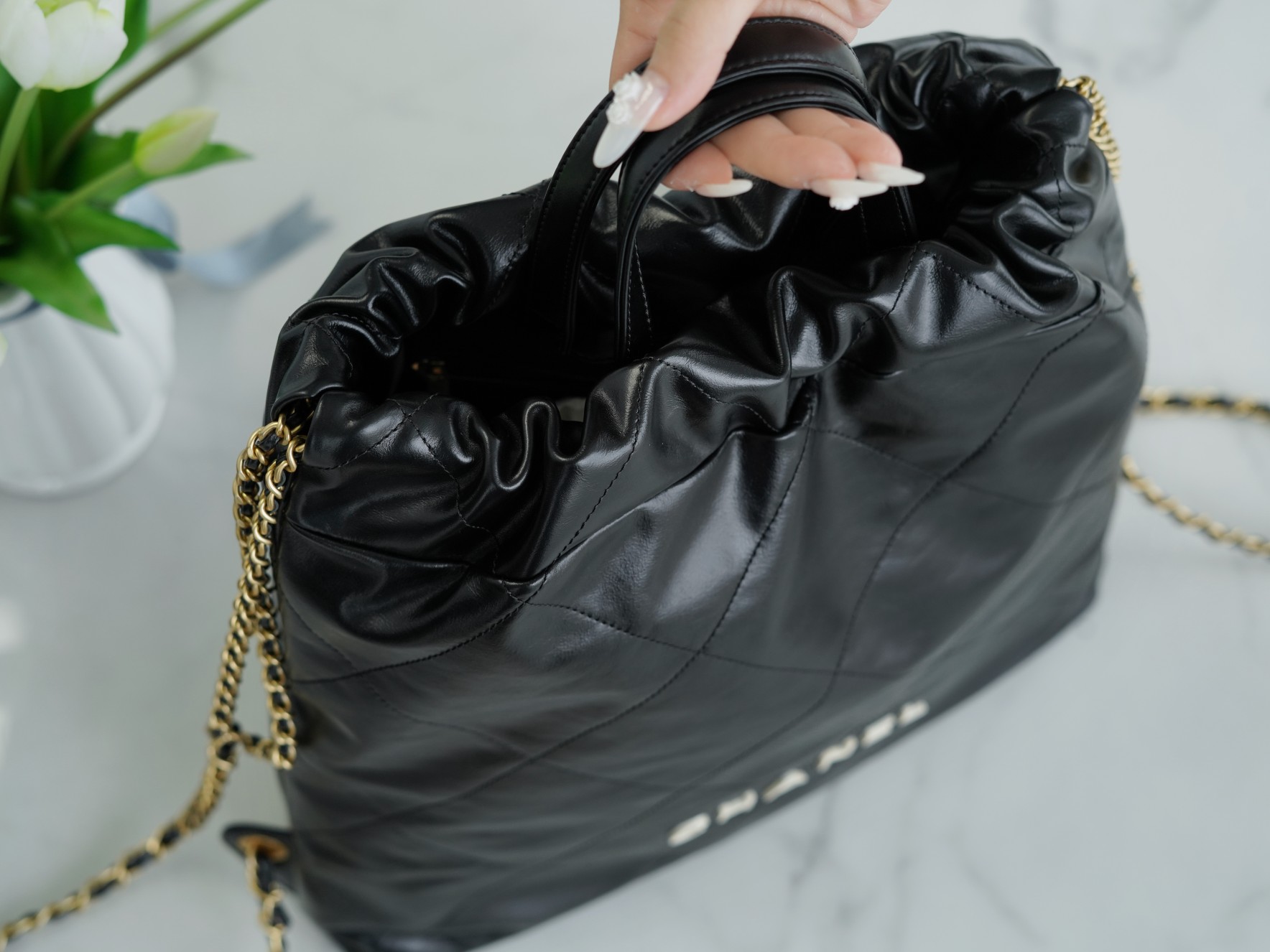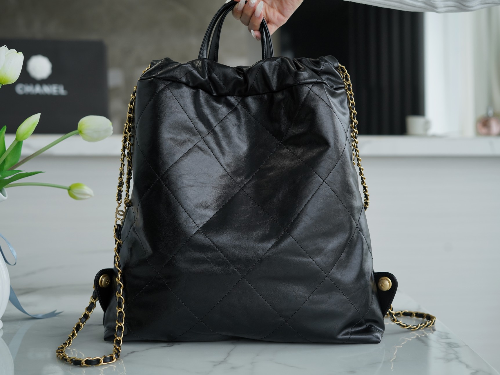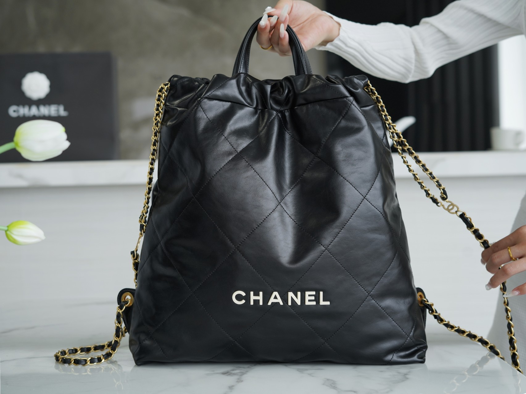 Chanel 22P Spring/Summer New Collection 22P Backpack, made with premium calfskin leather that feels smooth to the touch. It features clear leather crease texture and aged metal, along with a three-dimensional logo. The color scheme is black and white. The top is designed with a drawstring double chain, with the lower half connected by double C logos and the ends of the single chain secured by logo “rivets” on small ears at the bottom. The interior includes a zip compartment and a keychain for easy attachment of keys or small items. It seamlessly blends simplicity and comfort, packing your entire spring day.