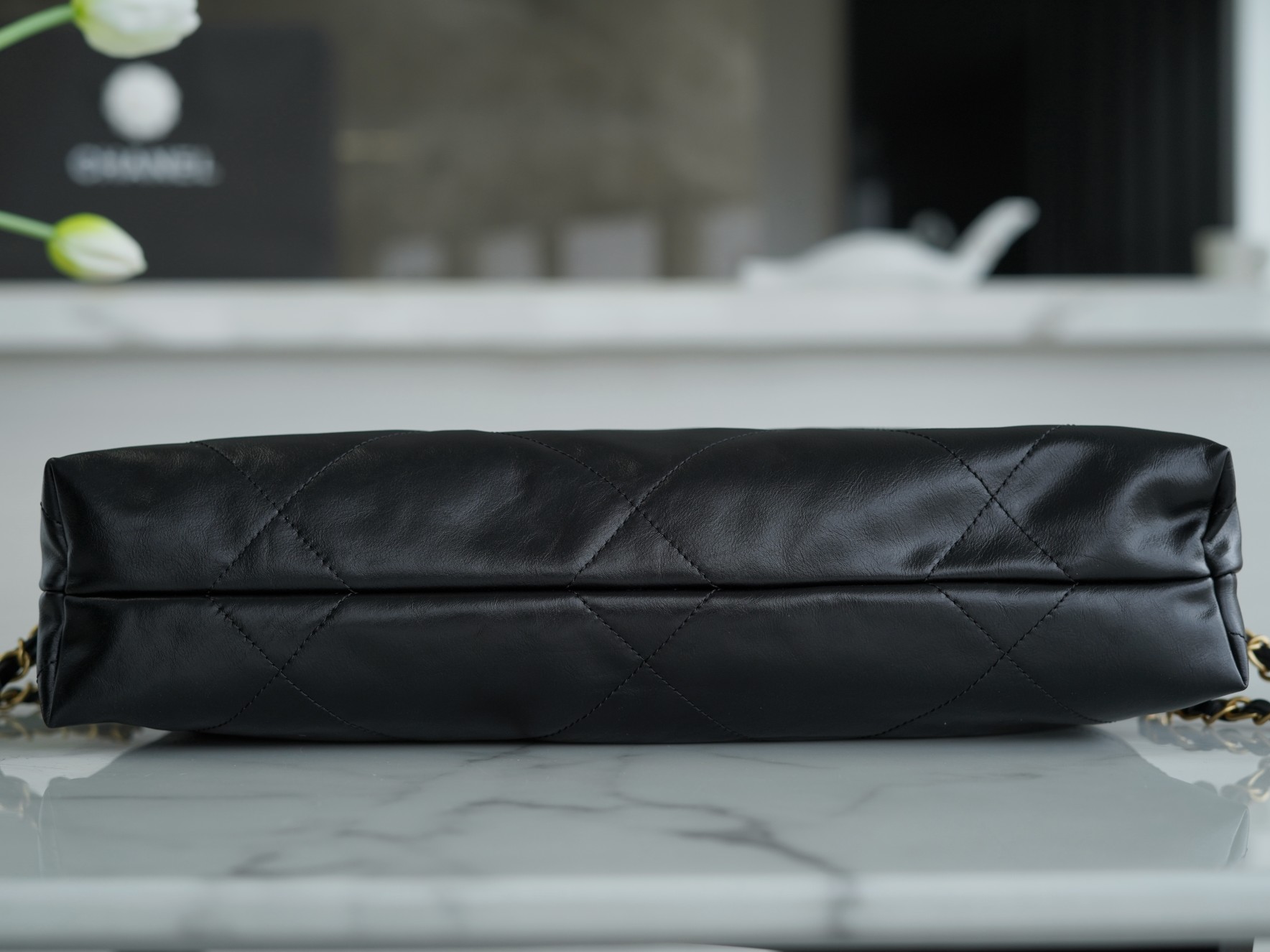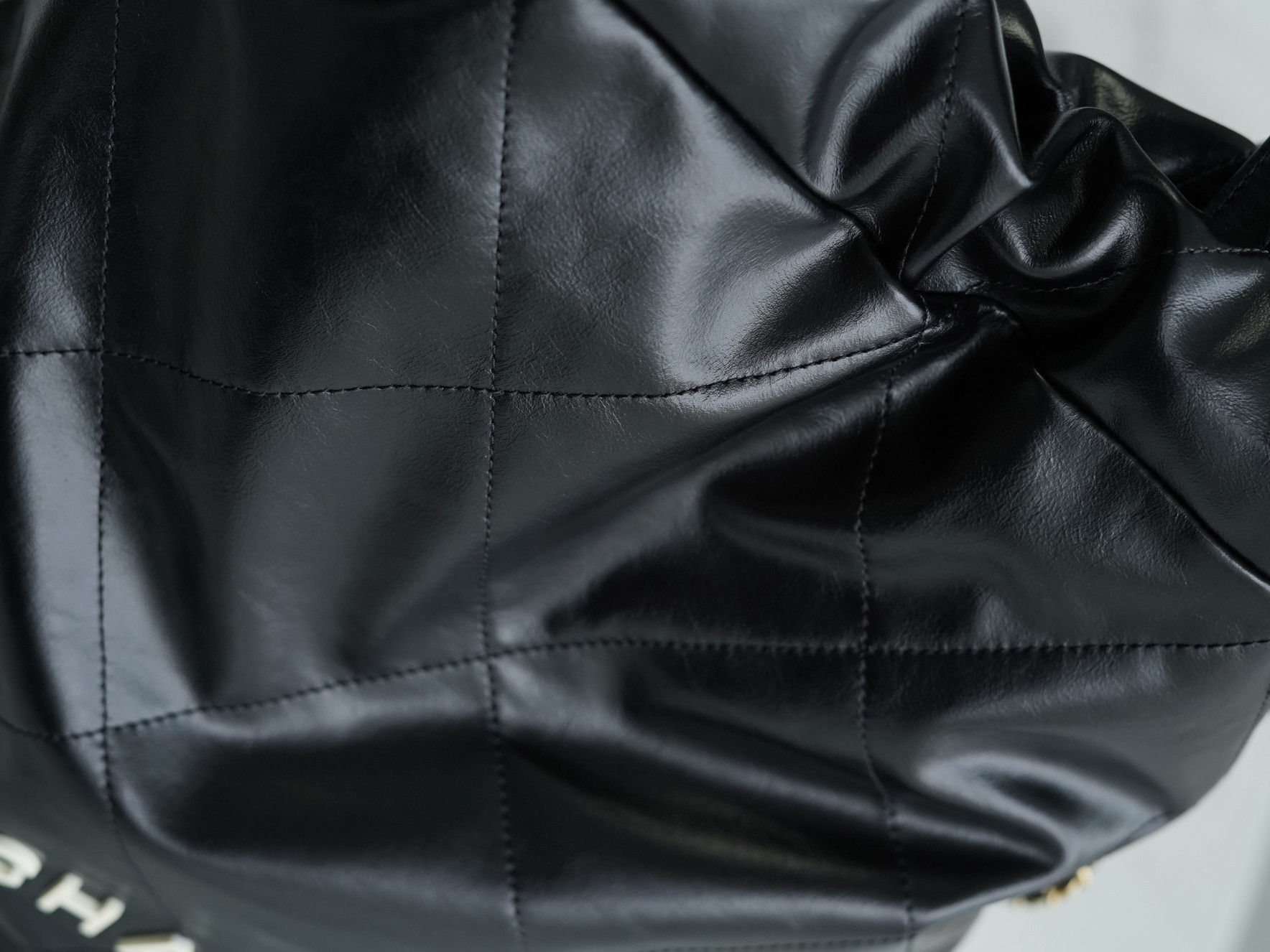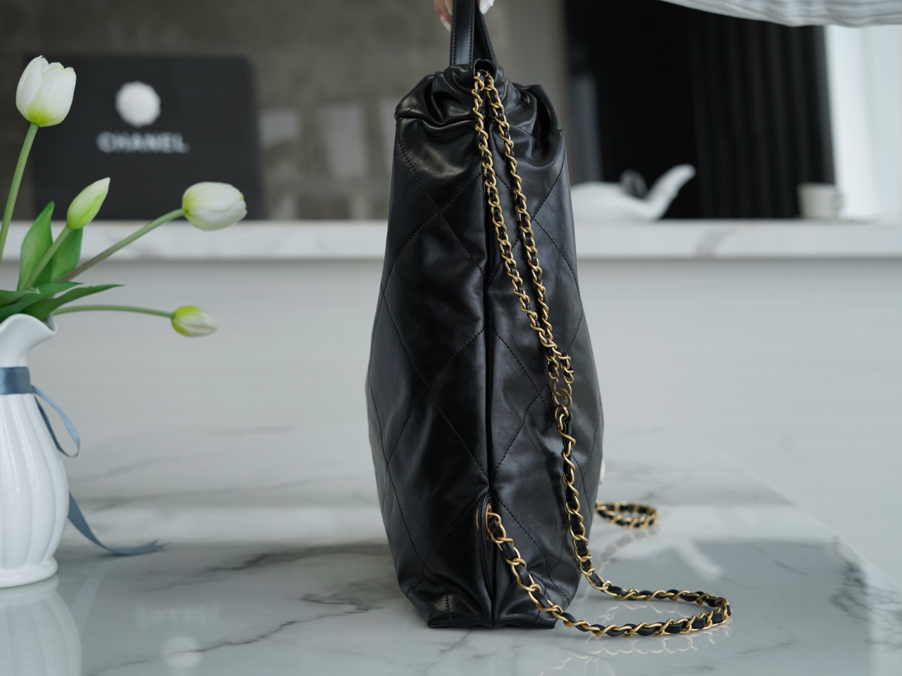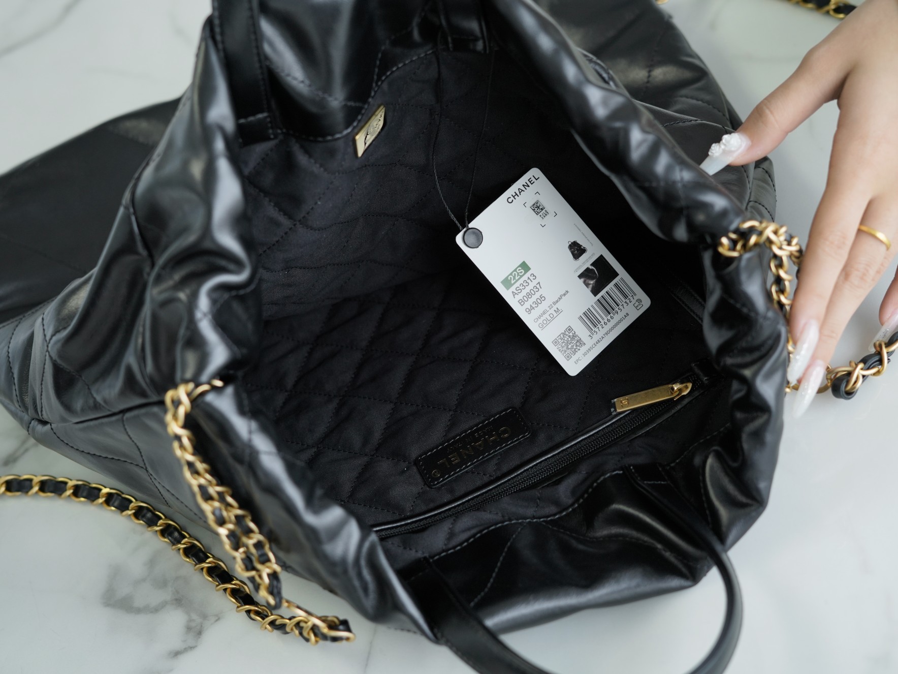 Chanel 22P Spring/Summer New Collection 22P Backpack, made with premium calfskin leather that feels smooth to the touch. It features clear leather crease texture and aged metal, along with a three-dimensional logo. The color scheme is black and white. The top is designed with a drawstring double chain, with the lower half connected by double C logos and the ends of the single chain secured by logo “rivets” on small ears at the bottom. The interior includes a zip compartment and a keychain for easy attachment of keys or small items. It seamlessly blends simplicity and comfort, packing your entire spring day.