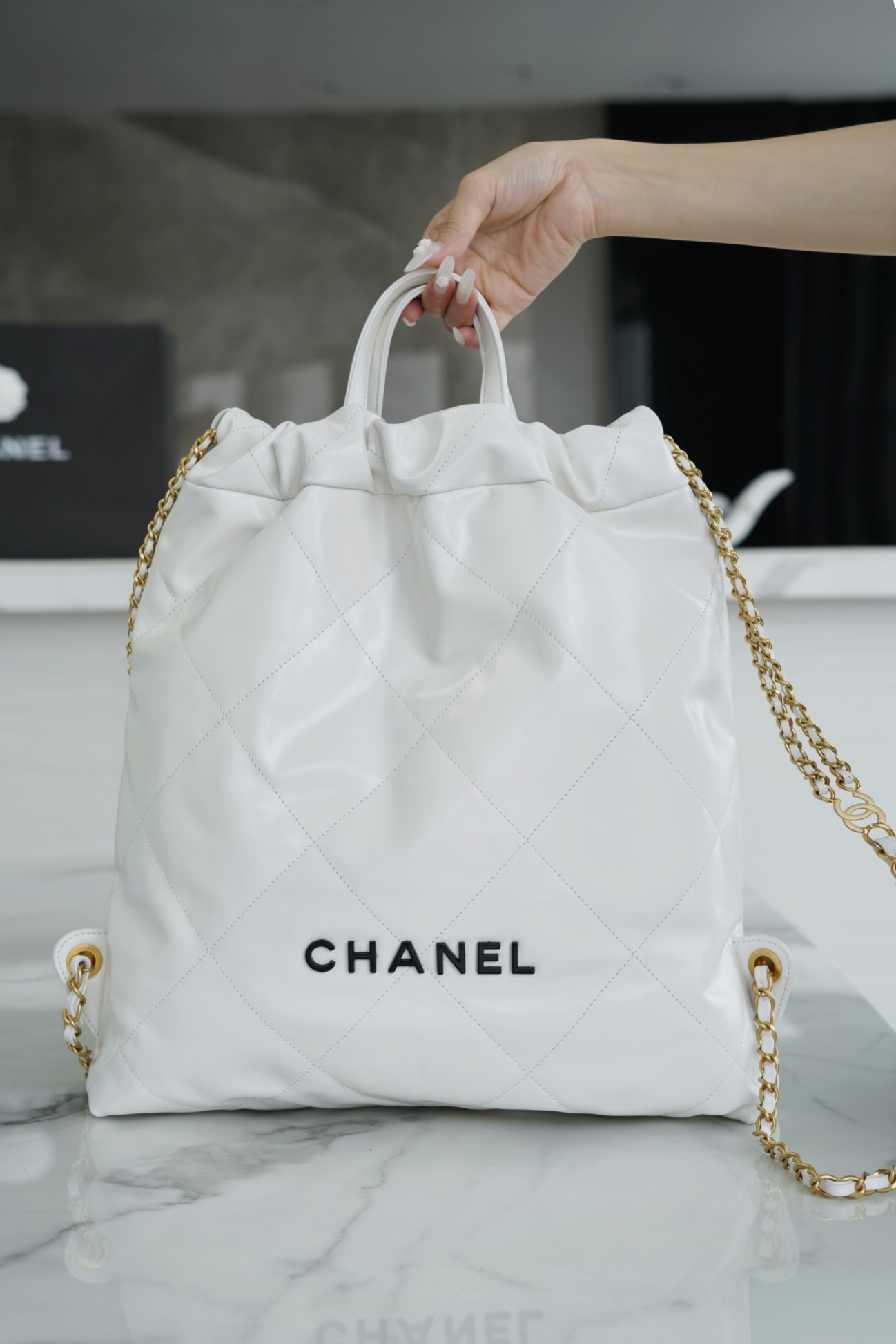 Chanel 22P Spring/Summer New Collection 22P Backpack, made with smooth calfskin leather in a glossy finish. It features clear leather crease texture and aged metal, along with a three-dimensional logo. The top is designed with a drawstring double chain, with the lower half connected by double C logos and the ends of the single chain secured by logo “rivets” on small ears at the bottom. The interior includes a zip compartment and a keychain for easy attachment of keys or small items. It seamlessly blends simplicity and comfort, packing your entire spring day.