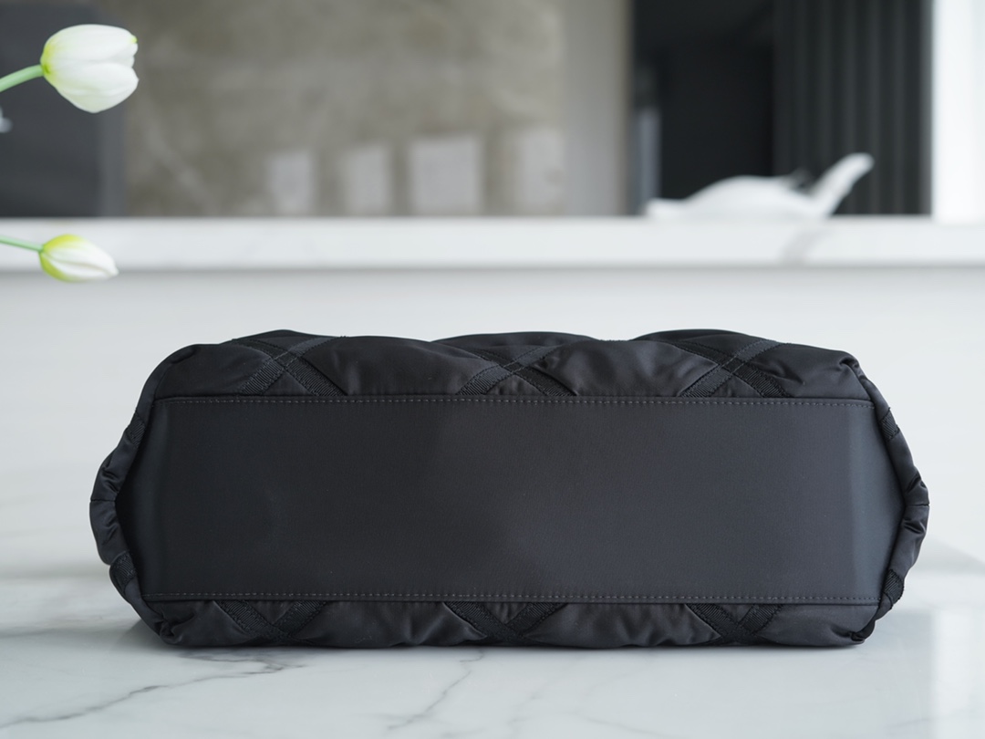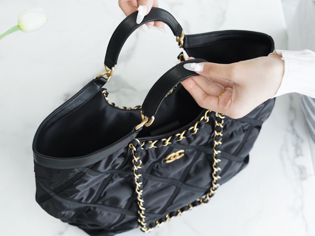 CHANEL Crossbody Bag. The 22P Spring/Summer new Nylon Chain Shopping Bag from CHANEL is here! Get ready for the nylon trend, Nylon material is easy to maintain and not delicate. The bag features a curved handle design with satin ribbon chains on both sides as decoration. The body of the bag combines satin ribbon and nylon to create the classic diamond pattern, breaking away from the traditional design and showcasing a unique charm with the fusion of nylon.