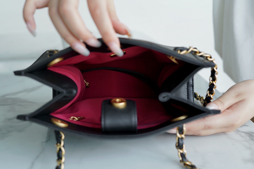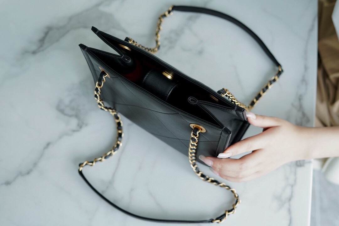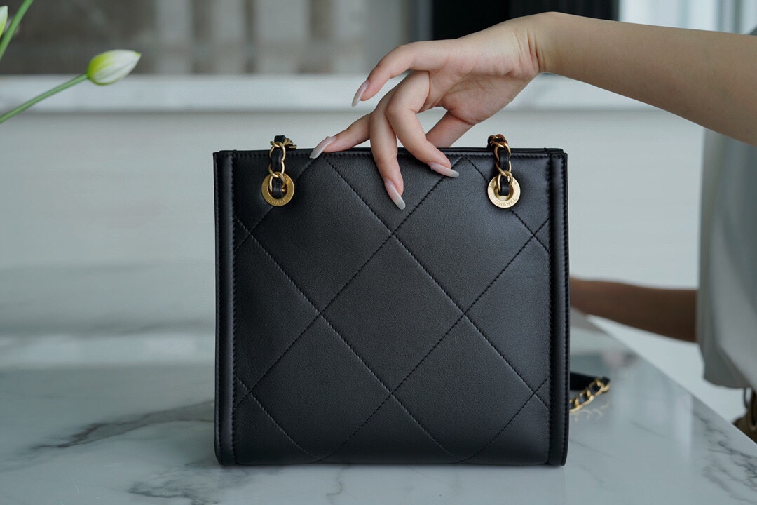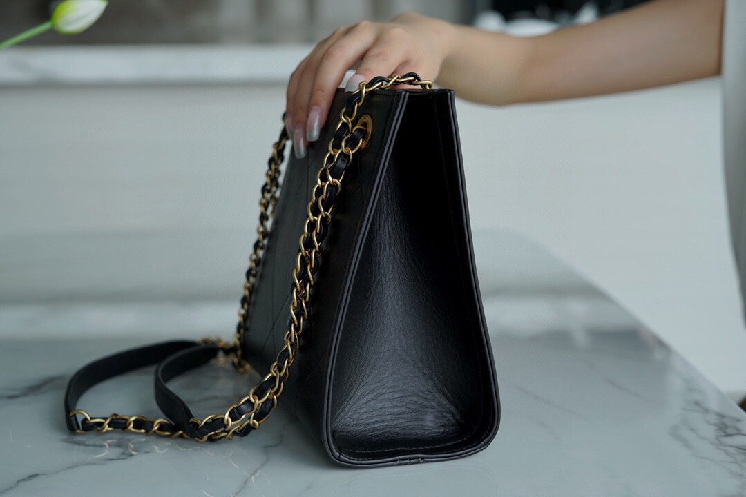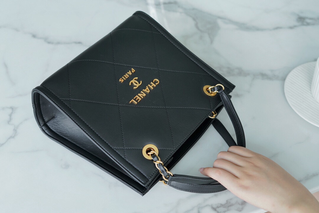The CHANEL Fall/Winter New Tote Shopping Bag is love at first sight. It features a rich texture in high-quality leather, complemented by a simple solid color and chunky chain hardware. The large diamond pattern design is accentuated with a vibrant red hue, exuding a subtle yet luxurious appeal. With its ample storage capacity, this bag is perfect for any occasion and instantly transforms into an IT BAG when worn. Its minimalist, fashionable style exudes a strong vintage charm.