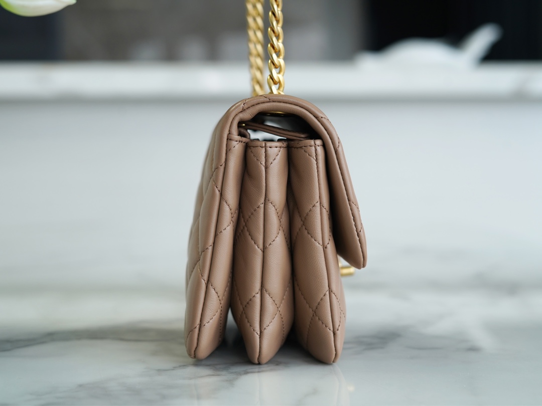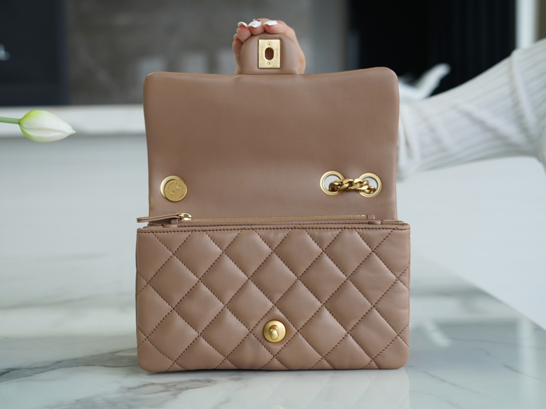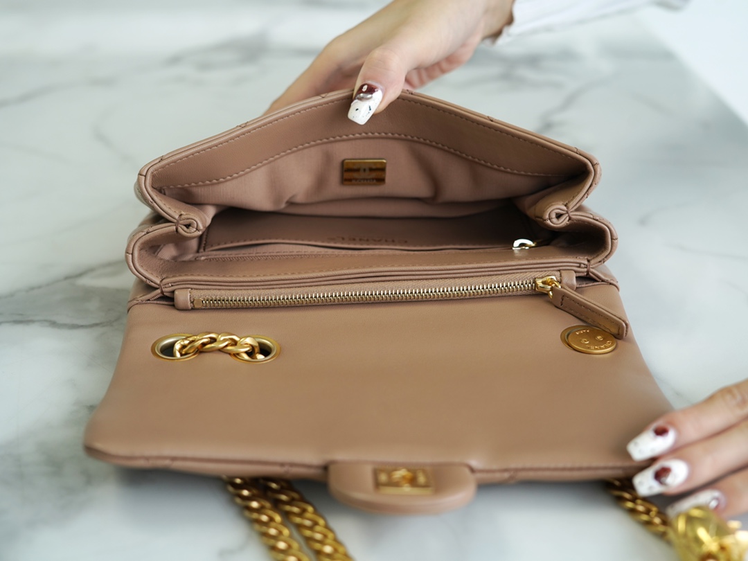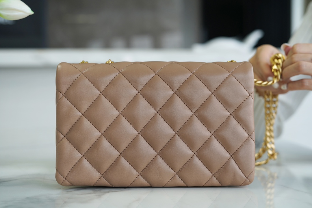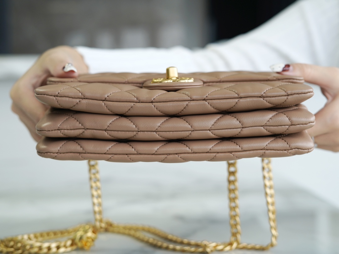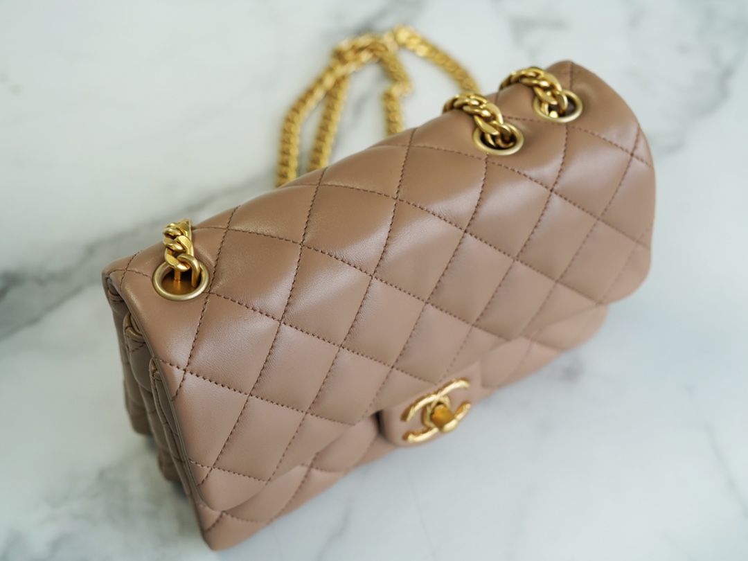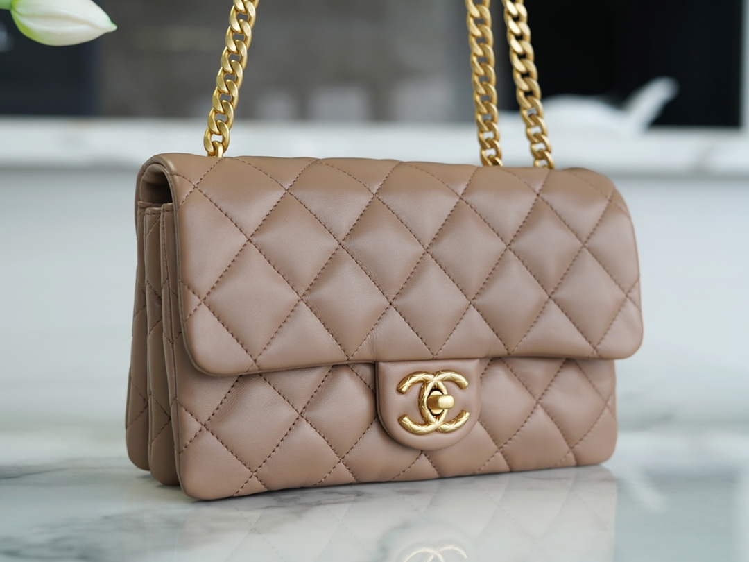 The CHANEL 2022K New Adjustable Flap Bag, small size, made with authentic leather, is the hottest item of the season. It features a new chain flap design, combining the classic CF bag shape with an adjustable pearl clasp. The double C logo is embossed on the hardware, and the hardware is adorned with a simple gold chain, breaking away from the traditional chain design. It exudes a rich autumn and winter charm while maintaining a vintage feel. It’s a classic piece that stands out from the crowd. Are you tempted?