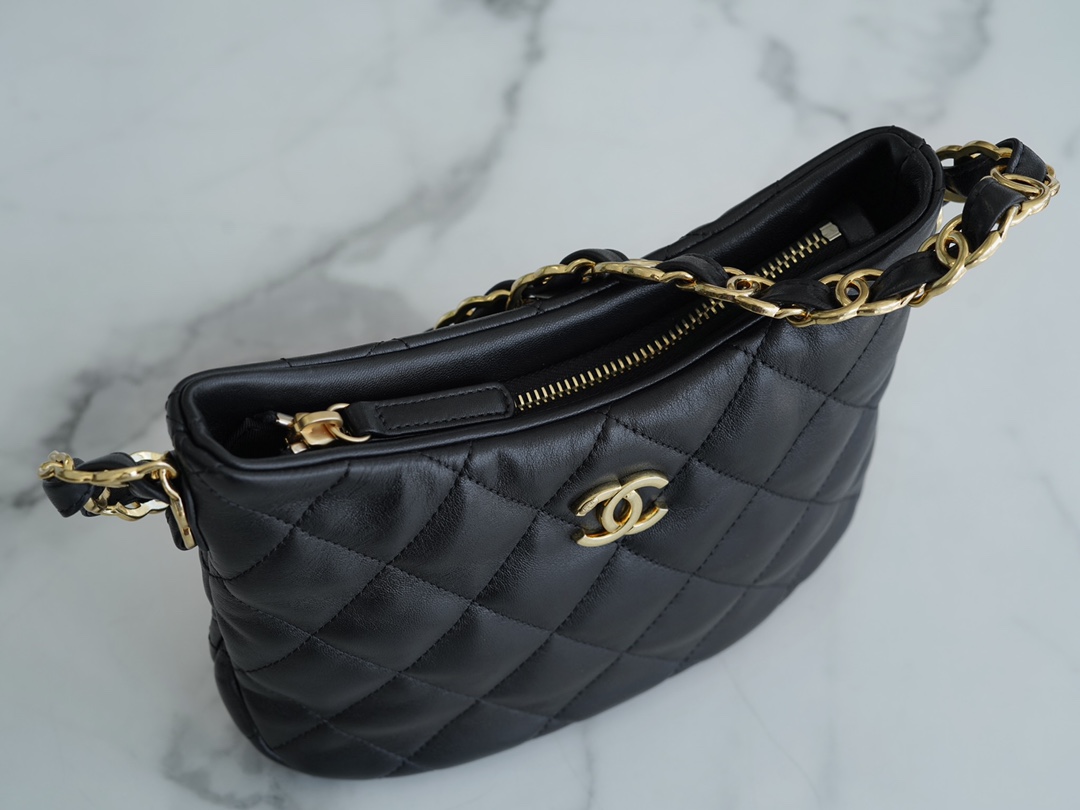 The CHANEL 2022K New Hobo Underarm Bag, made with authentic leather, showcases a vintage and vintage-inspired style this season. The leather is crafted from soft and delicate lambskin, and the shoulder strap features the iconic double C design. It is exquisitely detailed with a zipper, combining practicality and aesthetics. It exudes a casual and cool vibe, making it a versatile and must-have accessory for trendy girls.