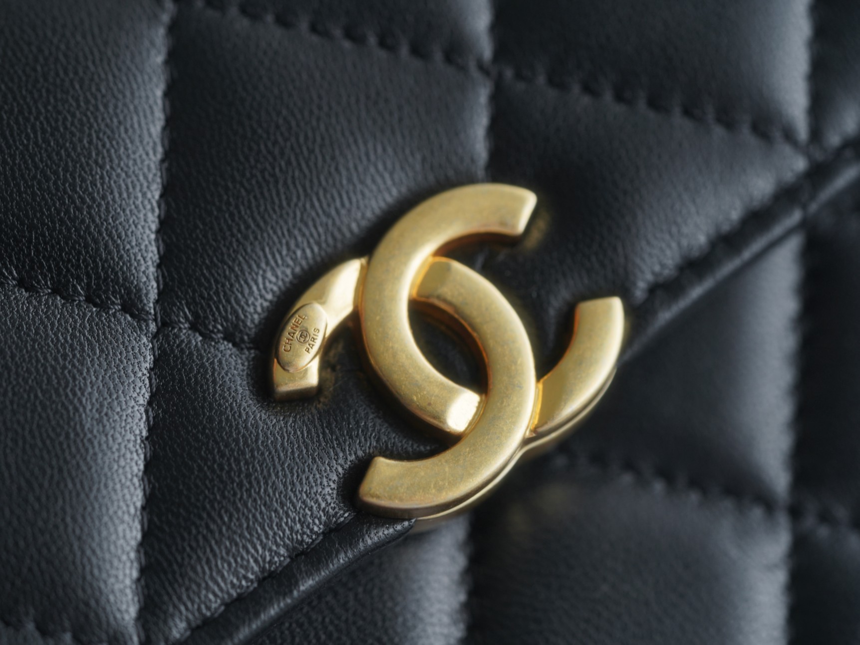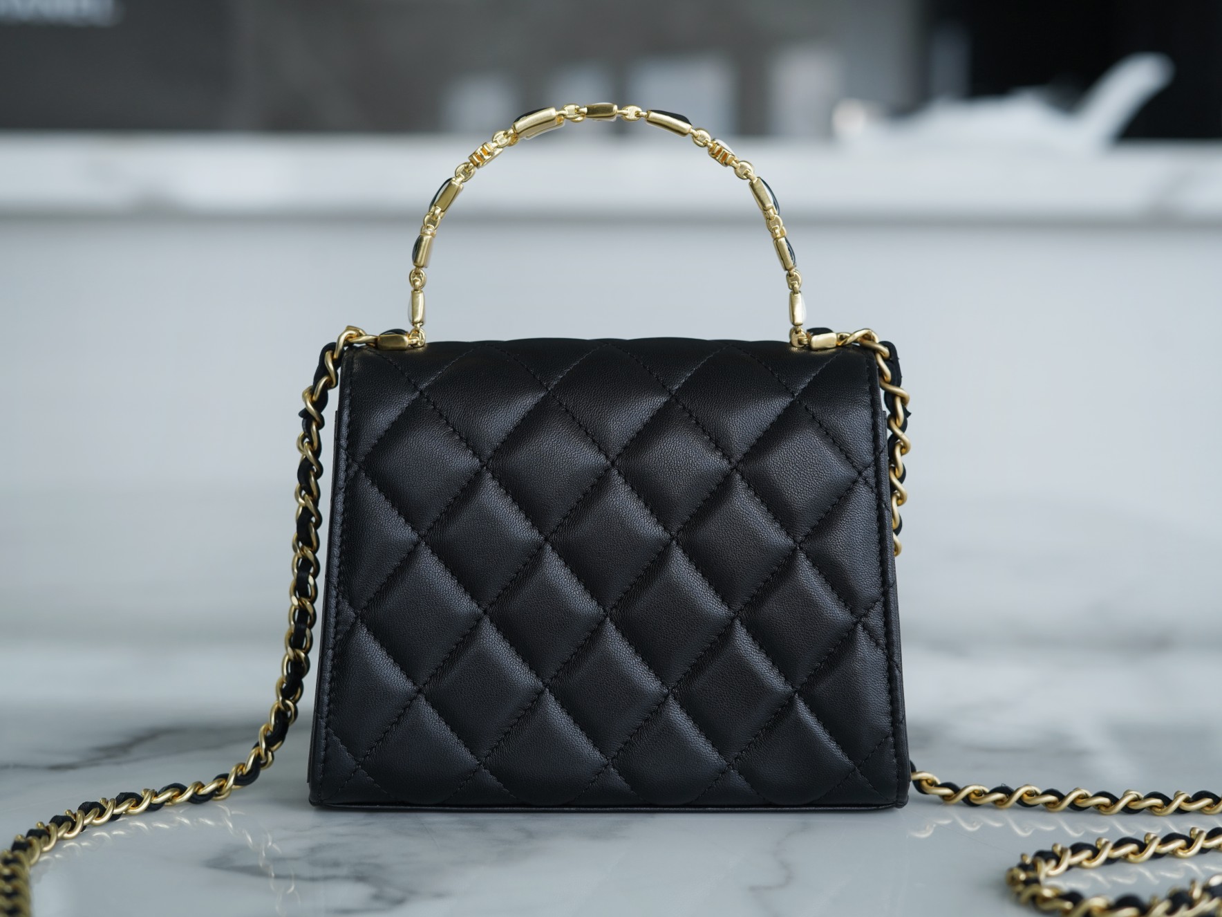 Chanel 22B Enamel Handle Chain Bag, medium size. This season’s most beautiful vintage enamel handle bag, resembling the iconic Coco handle. With its classic black and gold design, the enamel handle is its standout feature, exuding exquisite elegance whether worn on the shoulder or carried by hand. A must-have for stylish and sophisticated ladies.