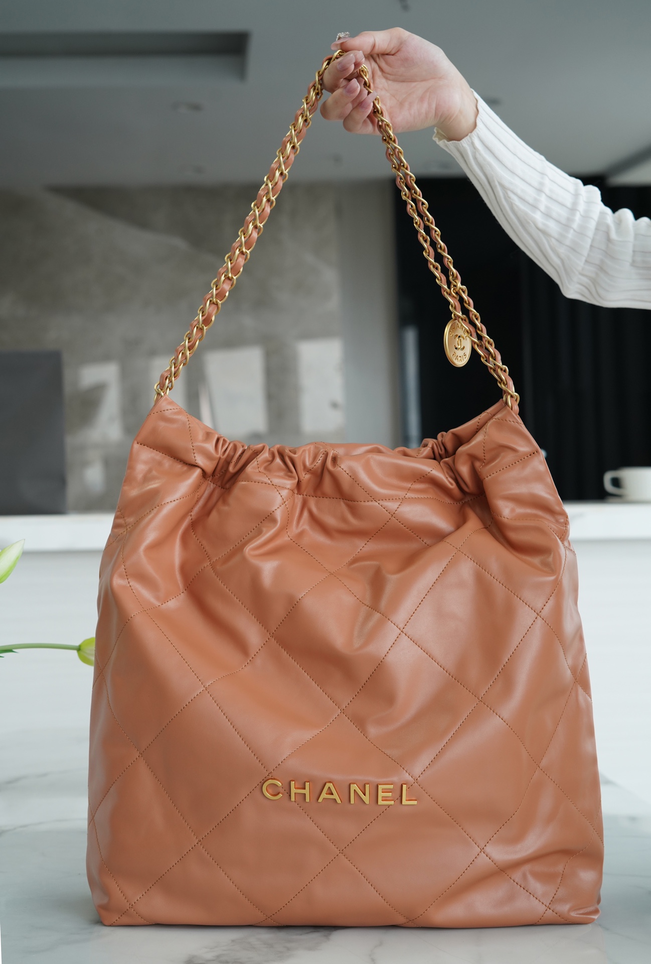 Chanel 22P Spring/Summer New Collection 22 Handbag, featuring a large size with a black color and white clasp. It is made with genuine top-grade “Pure A” (White Label) calfskin leather, which is delicate, glossy, soft, and durable. Despite its simple appearance, it incorporates advanced designs by the designer, such as the hollowed-out Chanel logo gold coins. These small embellishments elevate the overall elegance to a higher level, exuding a nostalgic charm and a relaxed, casual vibe.