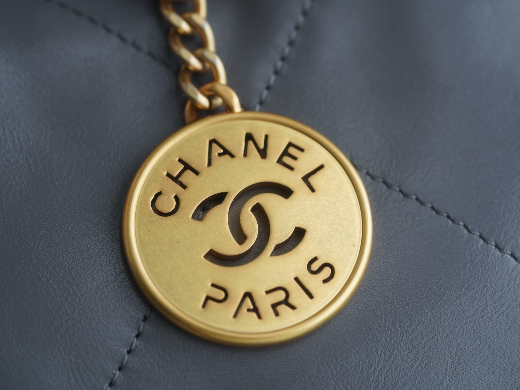 Chanel 22P Spring/Summer New Collection 22 Handbag in Genuine Tail Leather, Small Size, in Premium Gray. It is crafted with authentic first-grade tail leather sourced from Italy’s renowned “Montebello” factory, ensuring a fine and glossy texture that is both soft and durable. The simple exterior design conceals sophisticated elements created by the designer, such as the hollowed-out Chanel logo gold coins. These small embellishments elevate the overall elegance to a higher level, exuding a nostalgic charm and a relaxed, casual vibe.