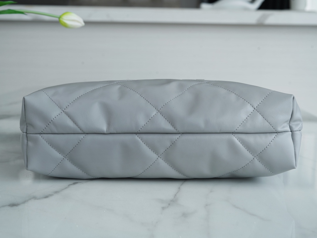 Chanel 22P Spring/Summer New Collection 22 Handbag in Gray with Silver hardware. It is made with a small-sized leather that is both soft and durable. The simple exterior design conceals sophisticated elements created by the designer, such as the hollowed-out Chanel logo. These small embellishments elevate the overall elegance to a higher level, exuding a nostalgic charm and a relaxed, casual vibe.