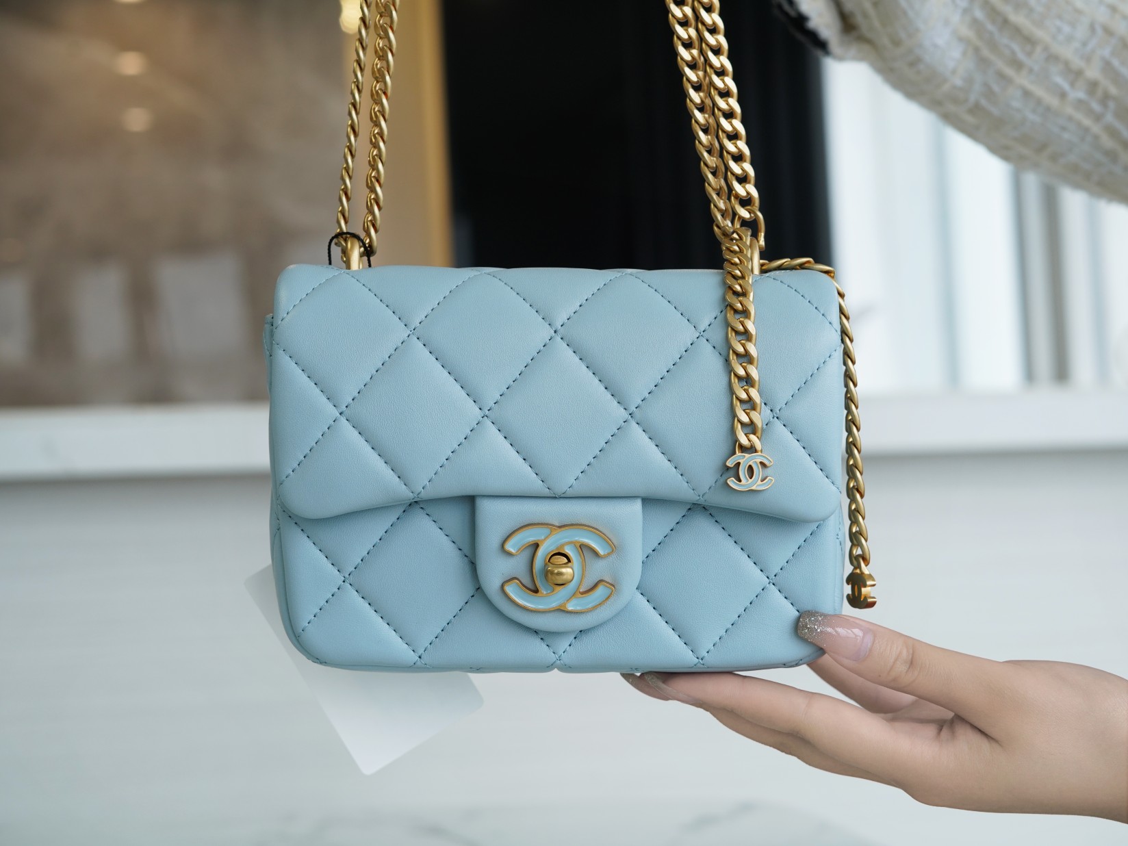The Chanel 22P enamel button square chubby pink handbag features lambskin leather in the classic CF style, adorned with an enamel button charm as an exquisite accent. The clever combination creates a dynamic and delicate look, allowing for various stylish ways to carry it, including: