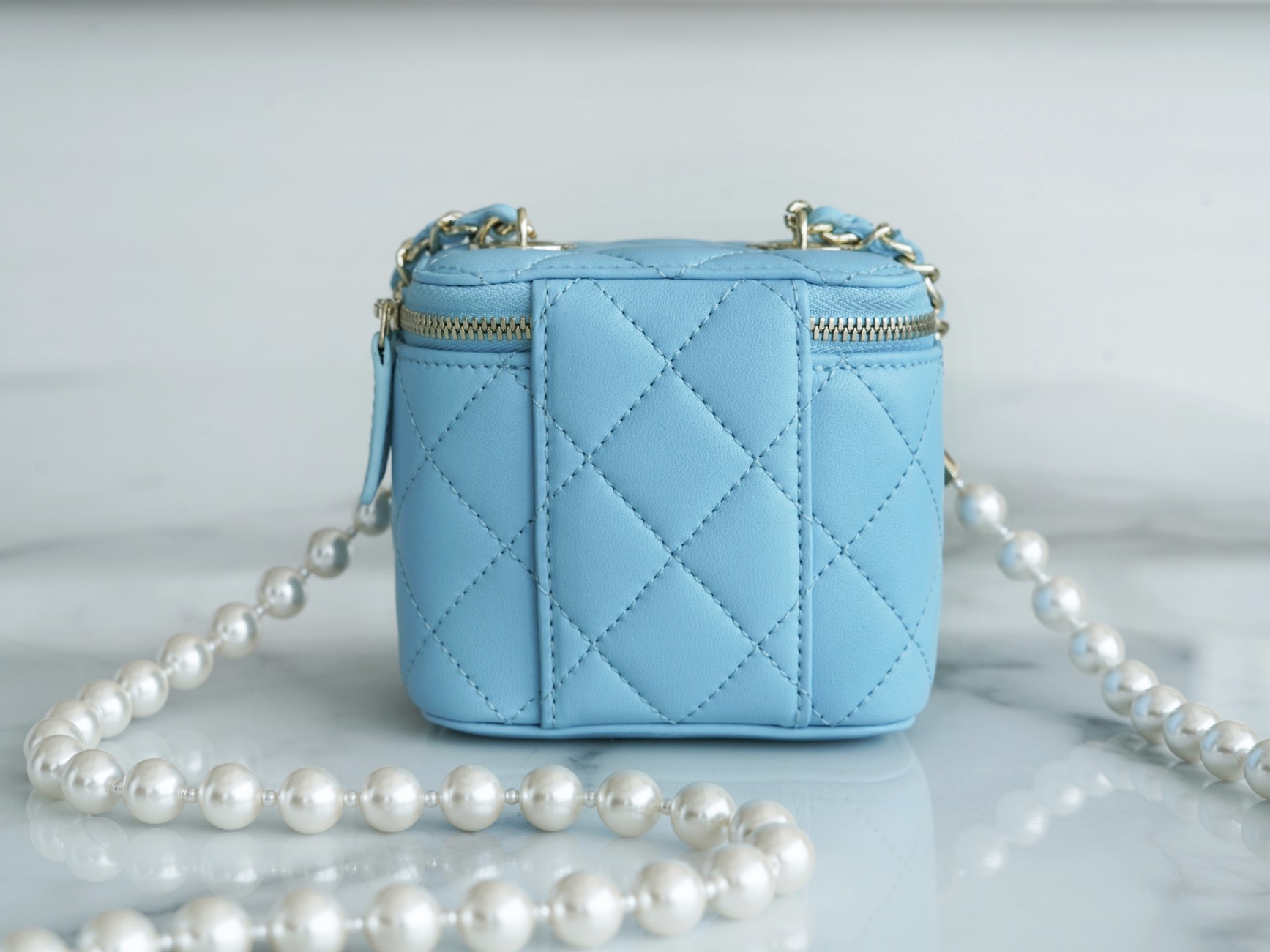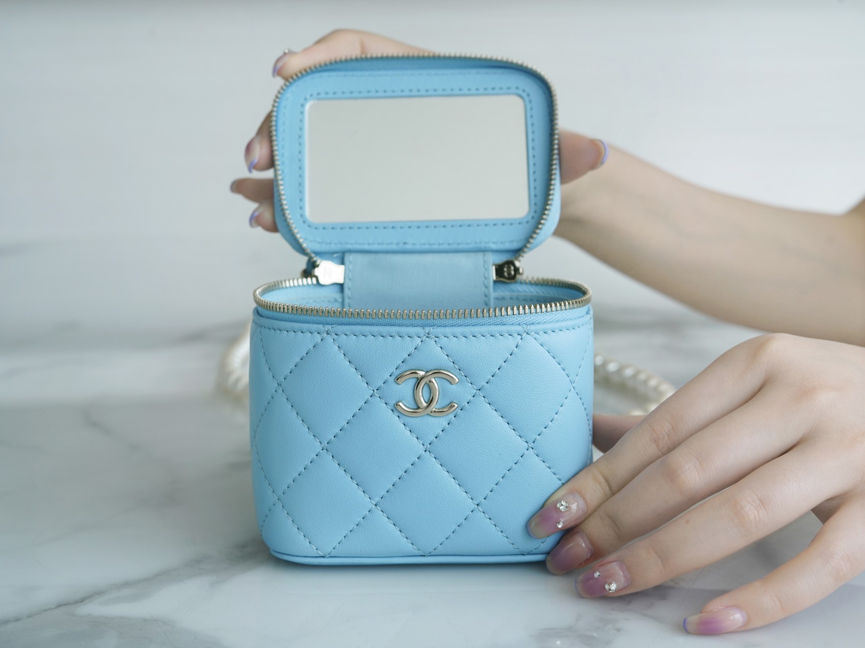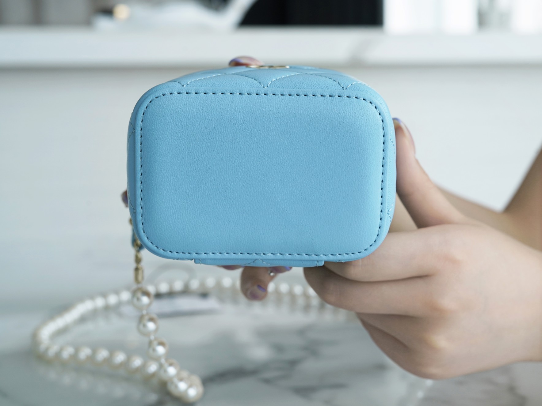 The new Pearl Box Bag is undoubtedly a symbol of top-tier elegance among numerous handbags. The shoulder strap, made of large pearls, adds to its allure with their full, round, and dreamy appearance. The classic diamond pattern and delicate lambskin leather material create an elegant and extravagant style. It exudes an elegant yet flamboyant vibe that is simply too sophisticated! Additionally, it features a small mirror inside, which is incredibly thoughtful.