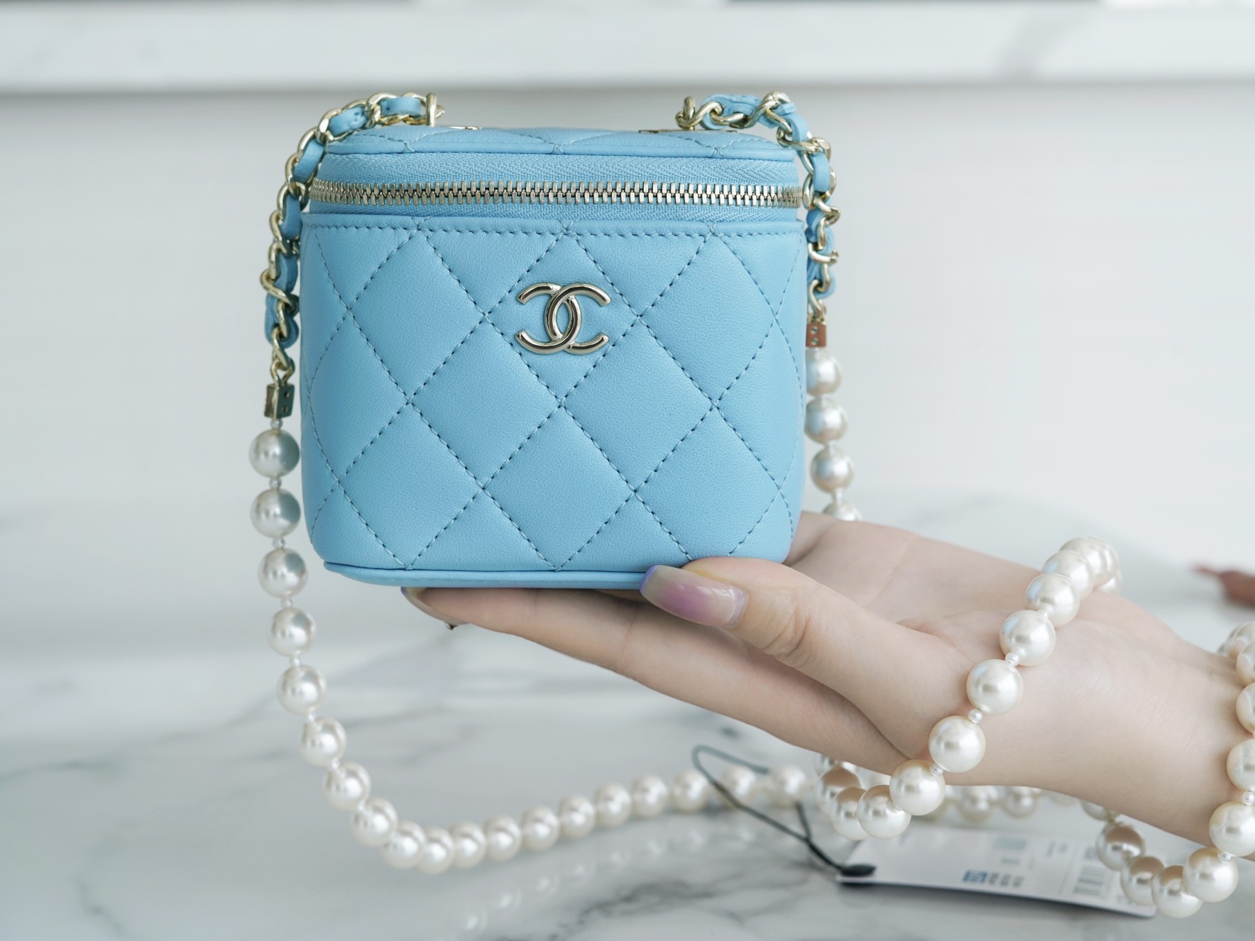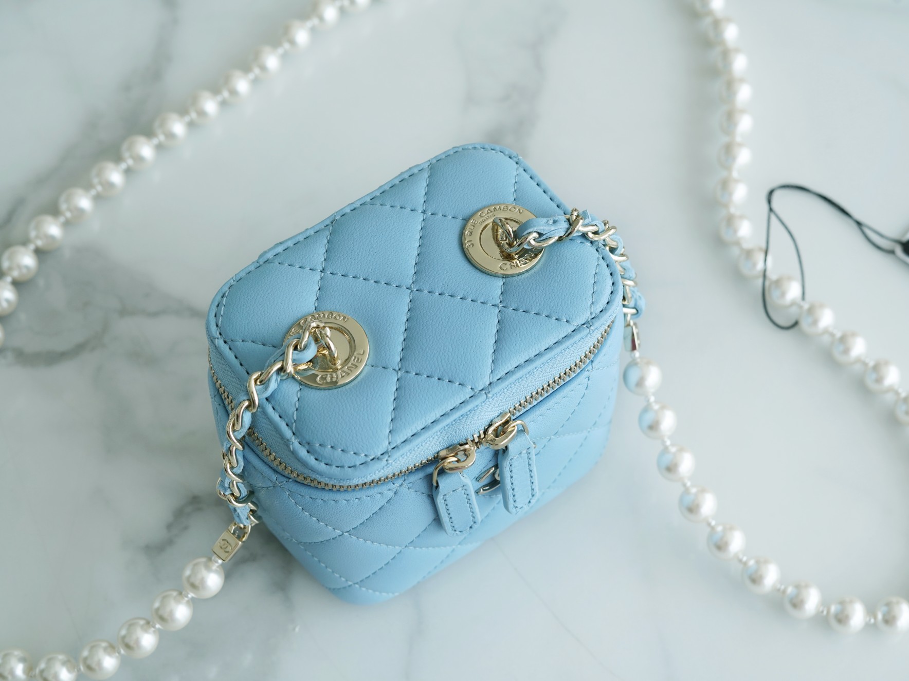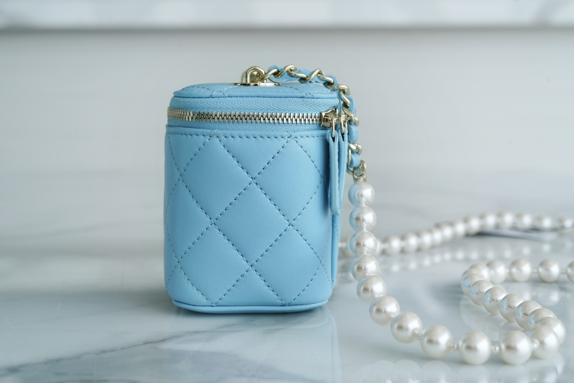 The new Pearl Box Bag is undoubtedly a symbol of top-tier elegance among numerous handbags. The shoulder strap, made of large pearls, adds to its allure with their full, round, and dreamy appearance. The classic diamond pattern and delicate lambskin leather material create an elegant and extravagant style. It exudes an elegant yet flamboyant vibe that is simply too sophisticated! Additionally, it features a small mirror inside, which is incredibly thoughtful.